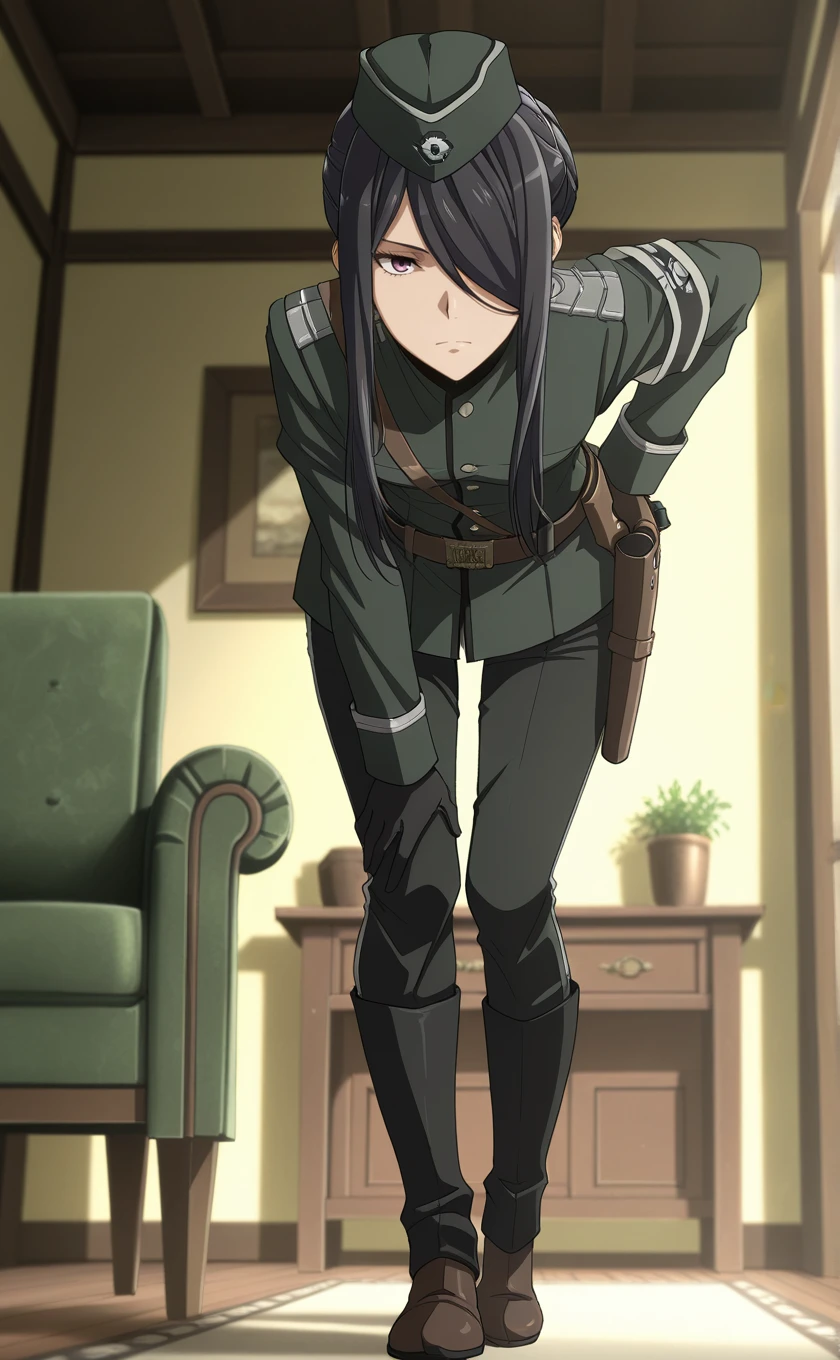 1girl,krstjgrth,anime coloring,(black hair,purple eyes:0.8),{(glaring:0.85) | (half-closed eyes:0.8)},(eyelashes:0.9),flat chest,sidelocks,(yellow earrings:0.8), hair over one eye,long hair, hair bun, androgynous, shirt,collarbone,long sleeves, brown dress,medallion,long dress