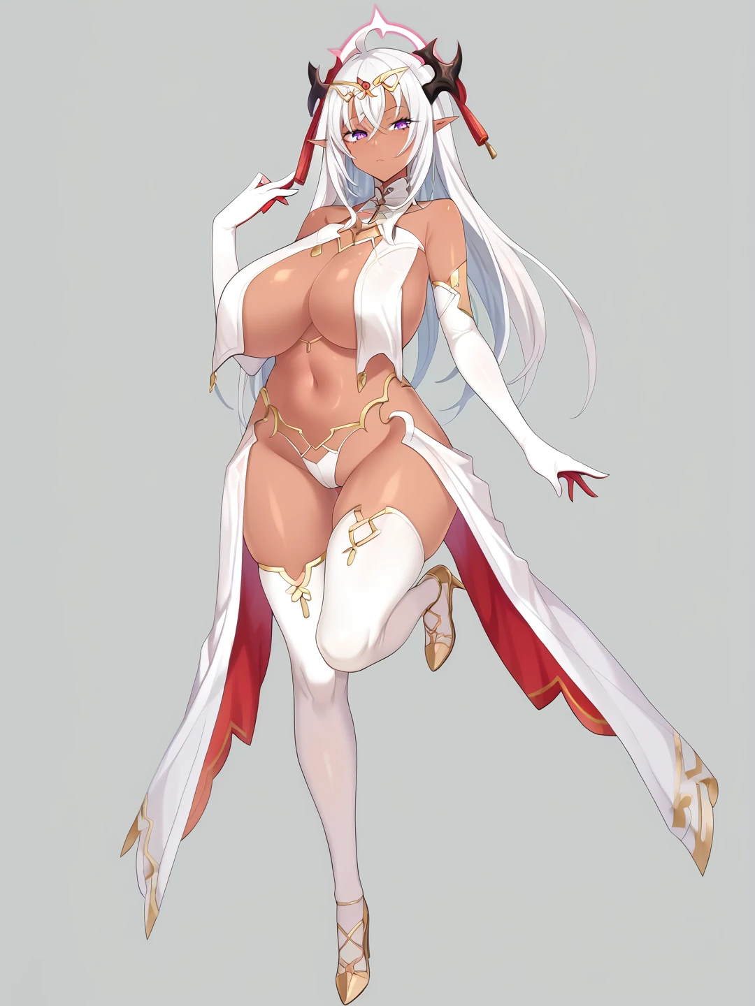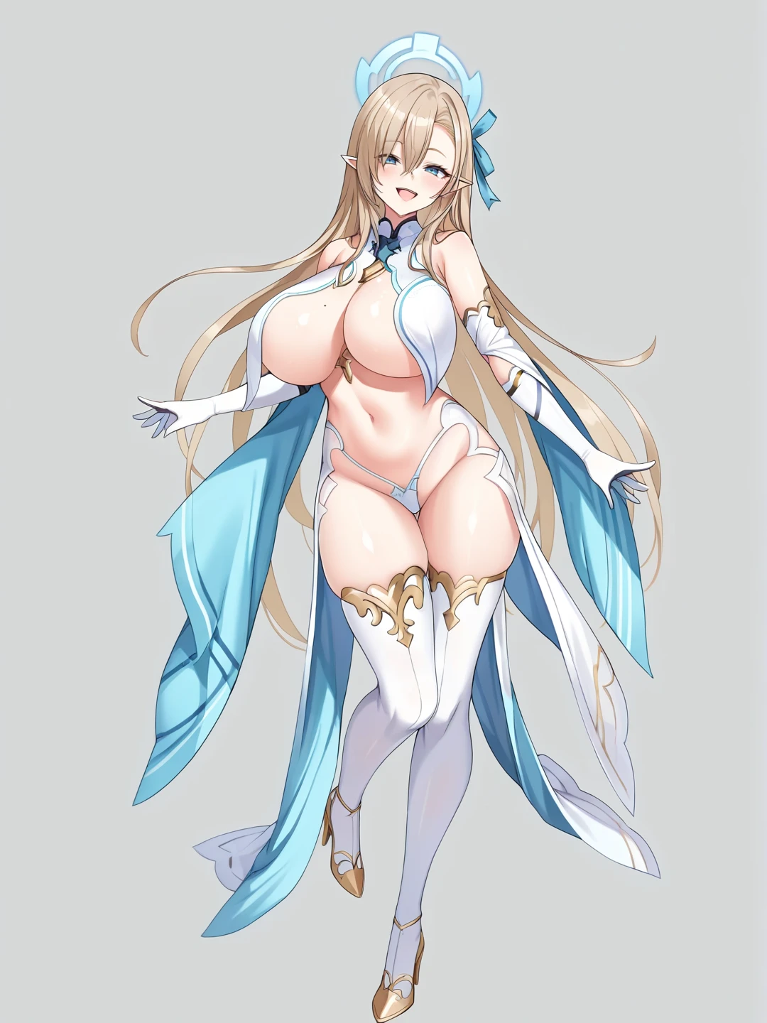 nella, breasts, looking at viewer, thighhighs, gloves, navel, cleavage, bare shoulders, elbow gloves, white gloves, high heels,revealing clothes, breast curtains