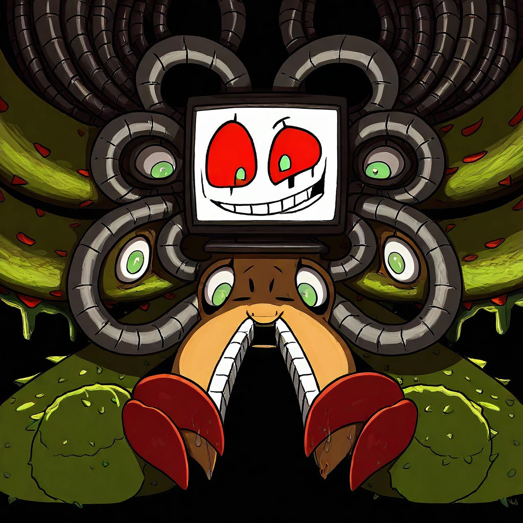 anthro, cartoony, tv screen face, red sclera, green pupils, monitor head, giant plant monster, twisted vines, grey mechanical tendrils, dark green leaves,