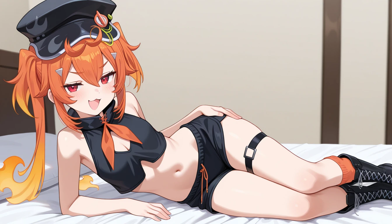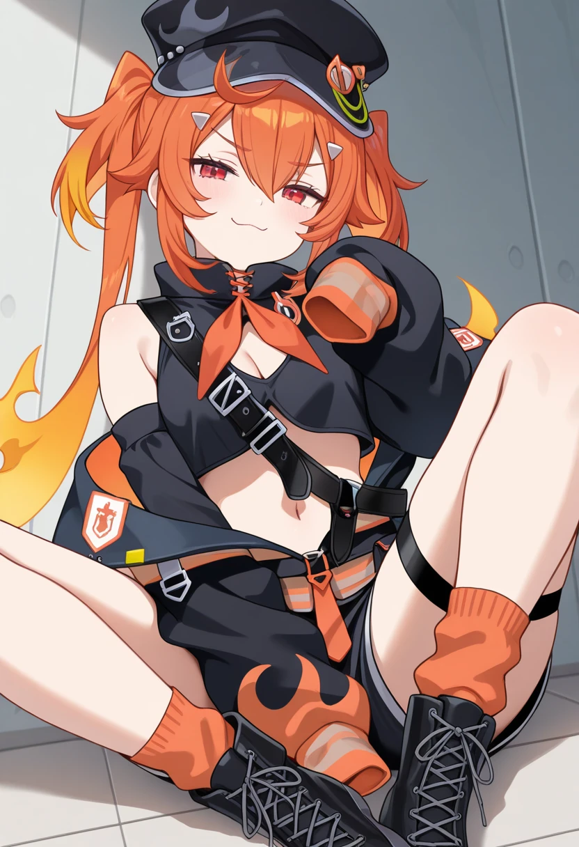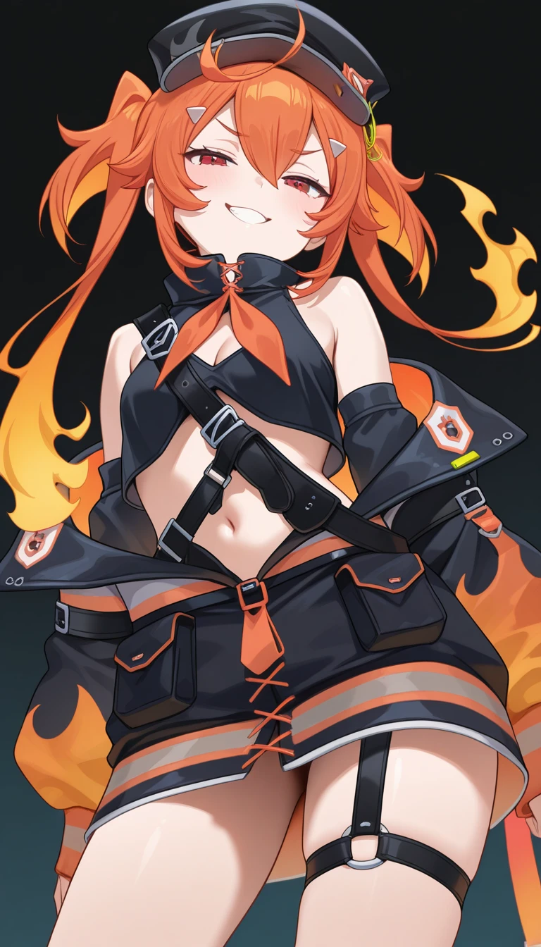 1girl, red eyes, orange hair, fiery hair, multicolored hair, long hair, twintails, ahoge, hair between eyes, hairclip