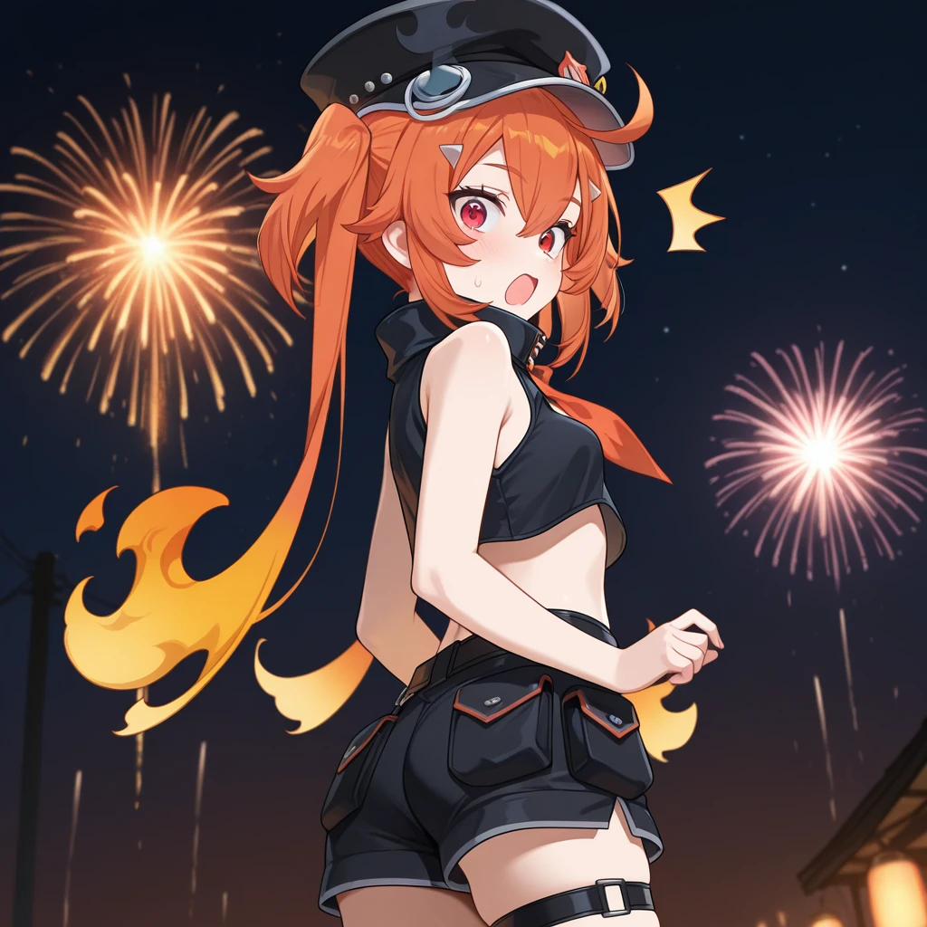 black shirt, crop top, orange neckerchief, cleavage cutout,
