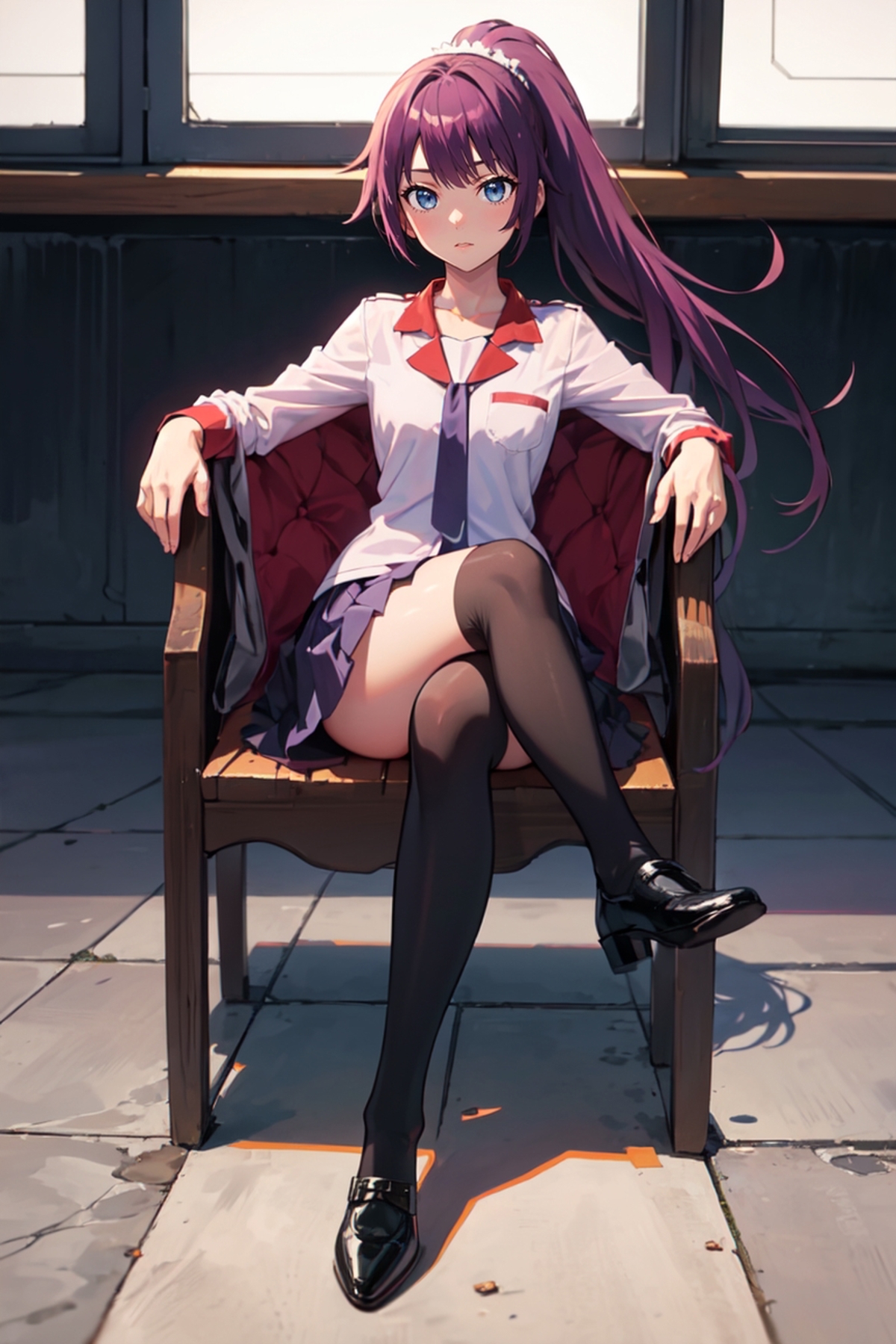 • For her original outfit use the tags: pikkysenjougahara hitagi, 1girl, solo, looking at viewer, purple hair, shiny hair, long hair, bangs, ponytail, sidelocks, blue eyes, breasts, medium breasts, school uniform, naoetsu high school uniform, thighhighs, skirt, zettai ryouiki