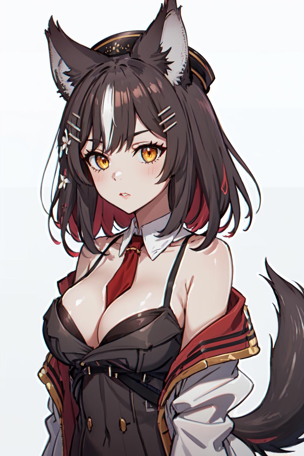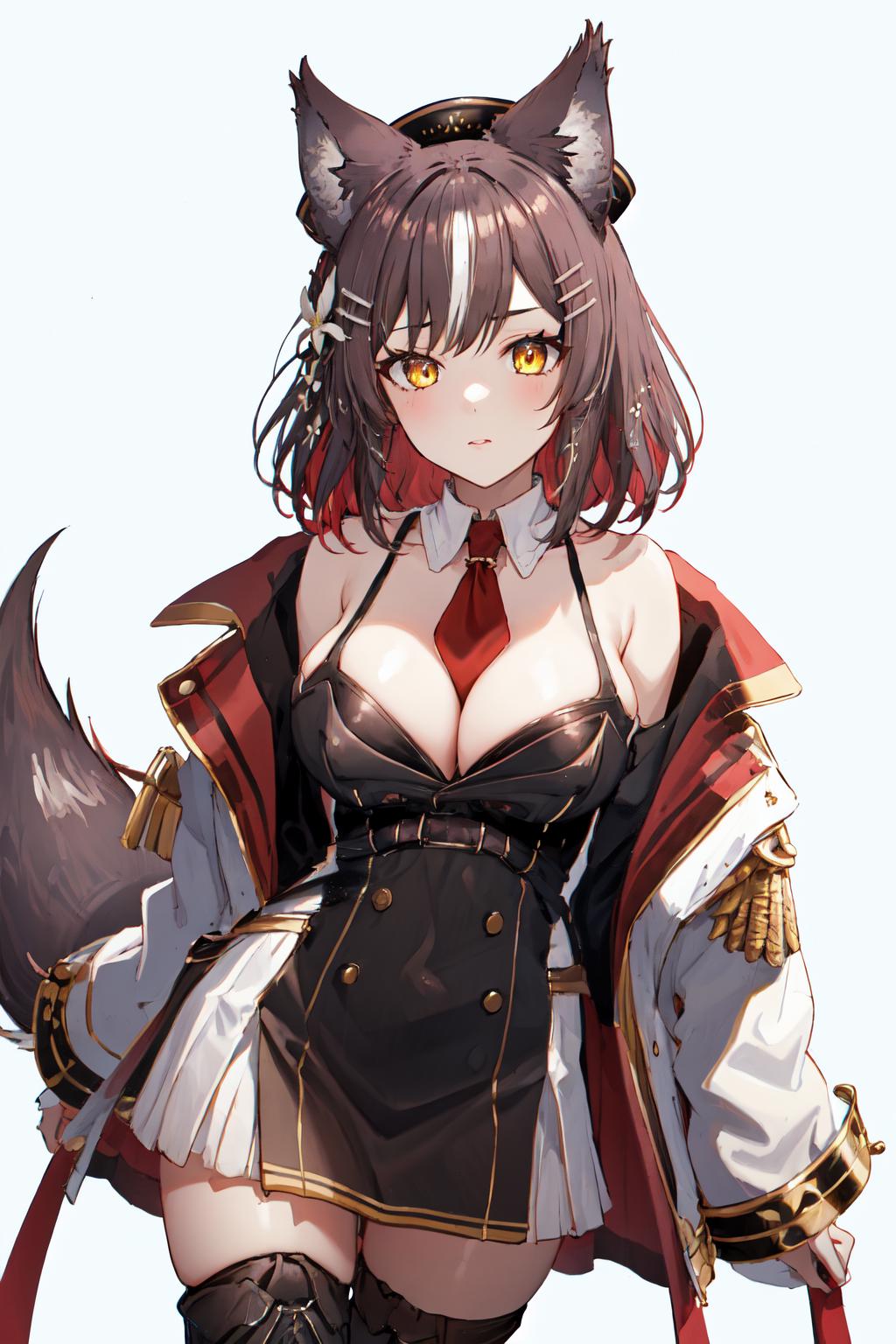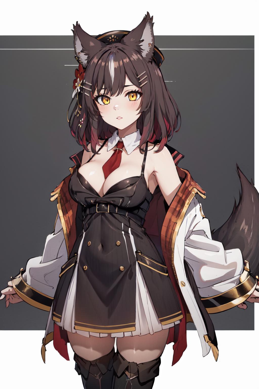 chisaka1st, hairclip, hair flower, wolf tail, hat, red necktie, necktie between breasts, detached collar, cleavage, black dress, boots, white jacket