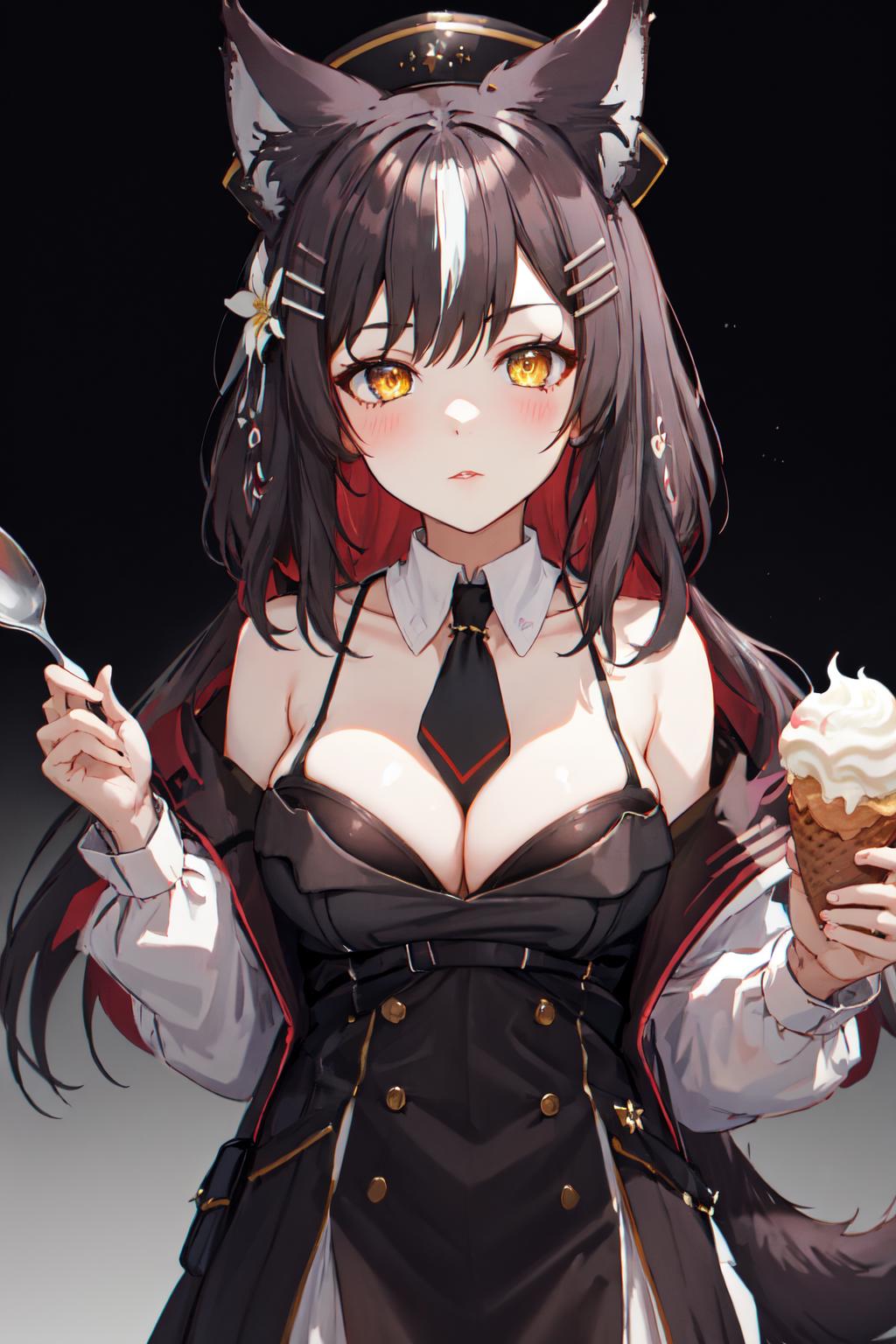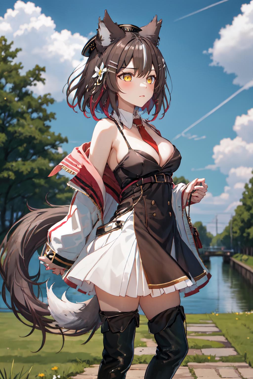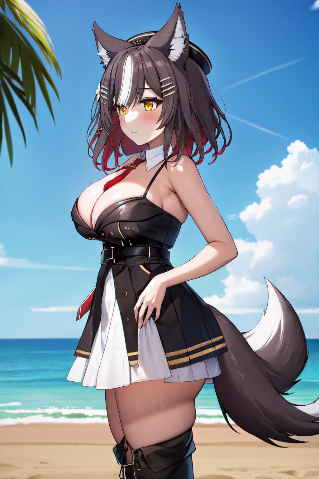 chisaka1st, hairclip, hair flower, wolf tail, hat, red necktie, necktie between breasts, detached collar, cleavage, black dress, boots, white jacket