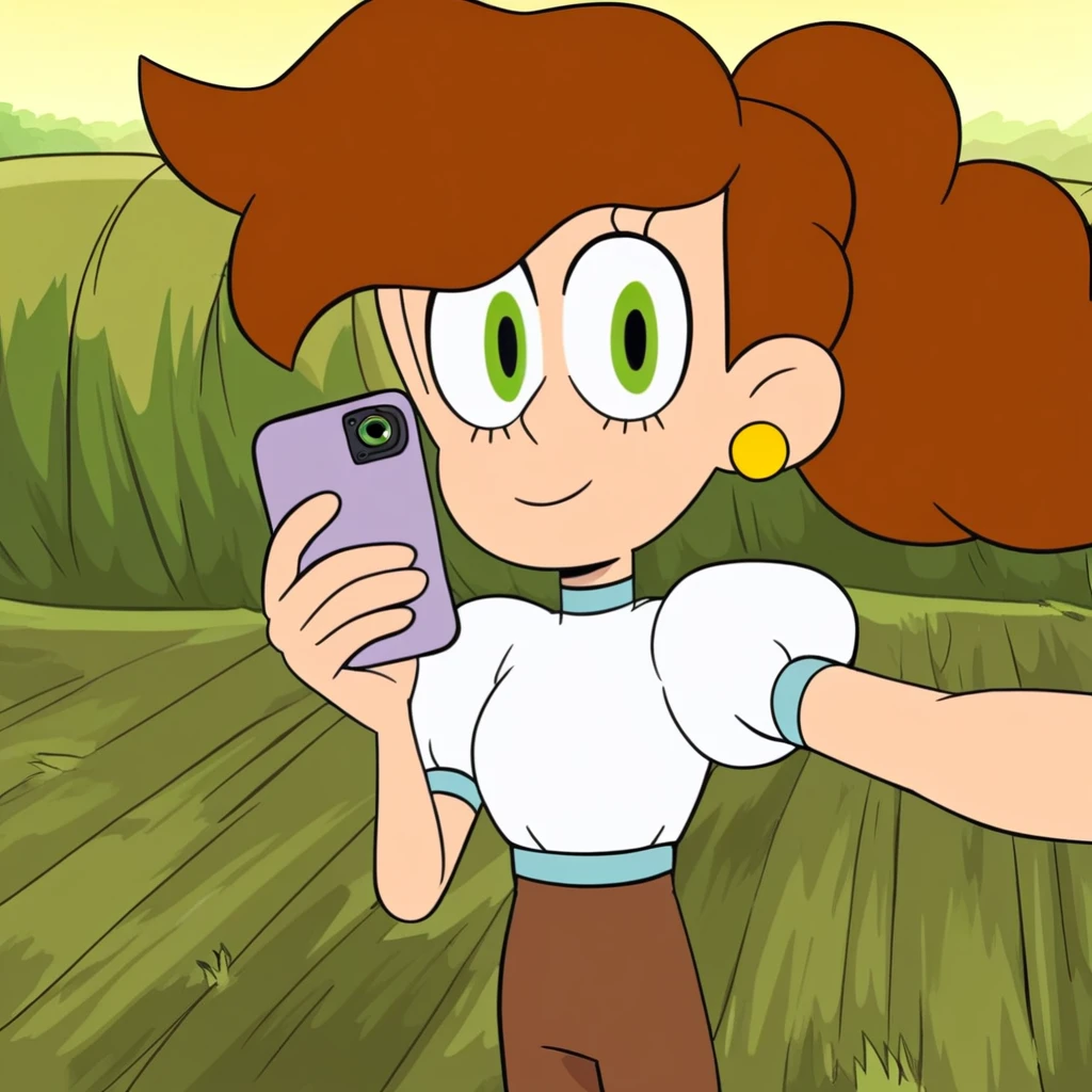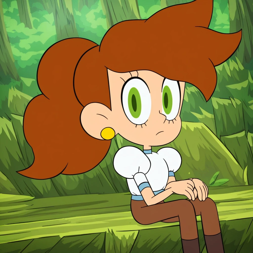 melissa_cotc, brown hair, green eyes, ponytail, earrings, white shirt, puffy sleeves, brown pants