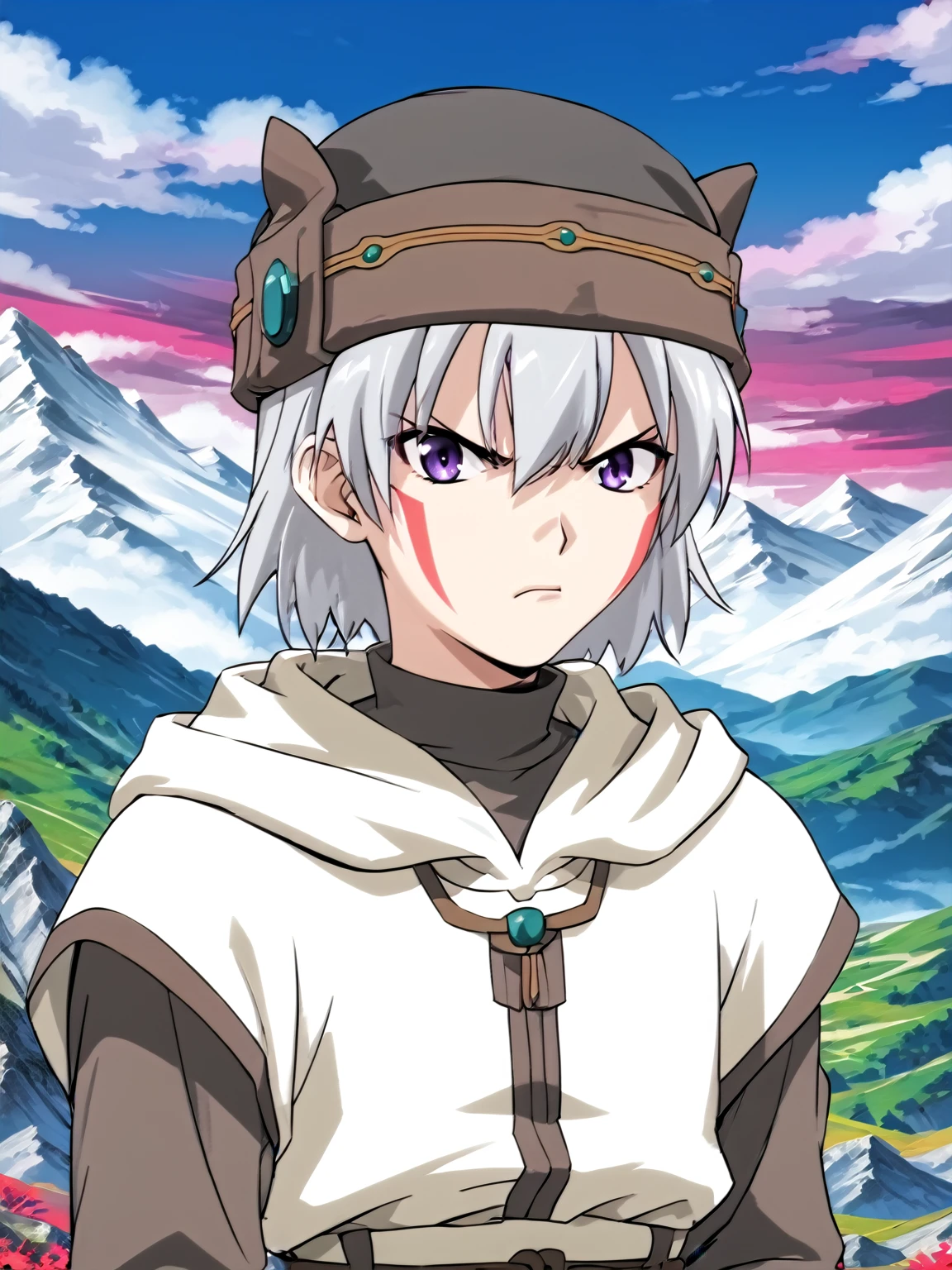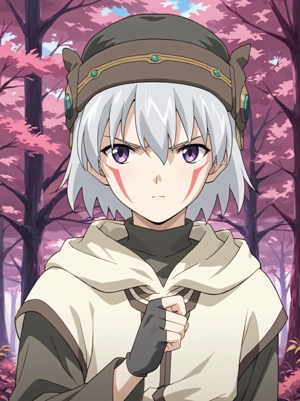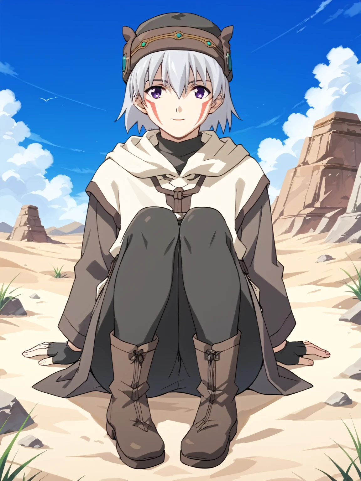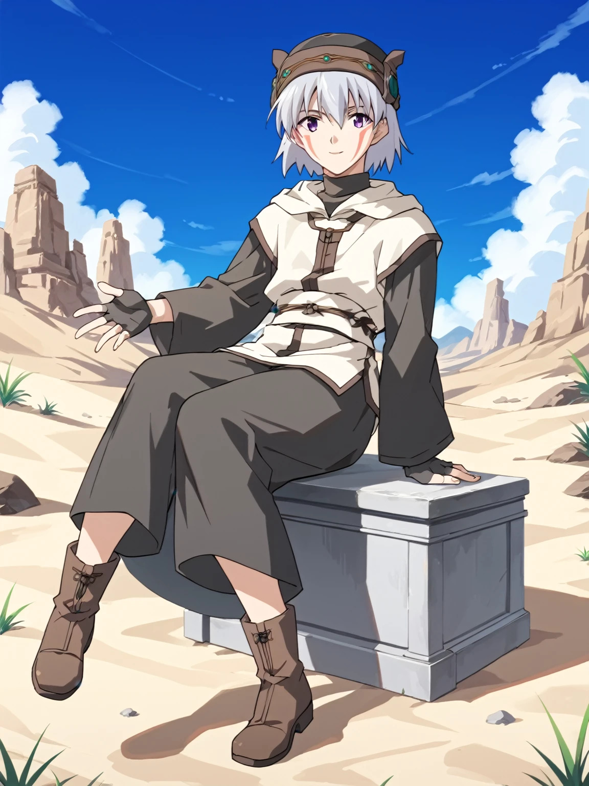 General: 1boy, male focus, solo, short hair, white hair, hat, purple eyes, facial mark, facepaint, long sleeves, robe, gloves, fingerless gloves, boots
