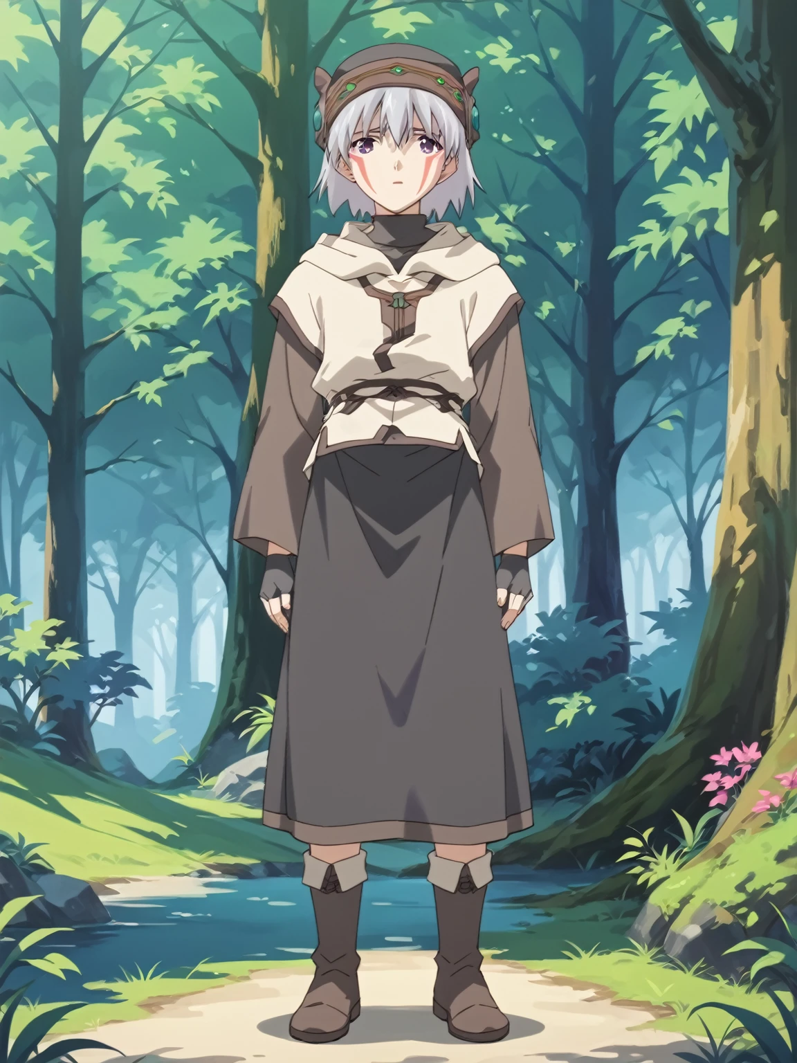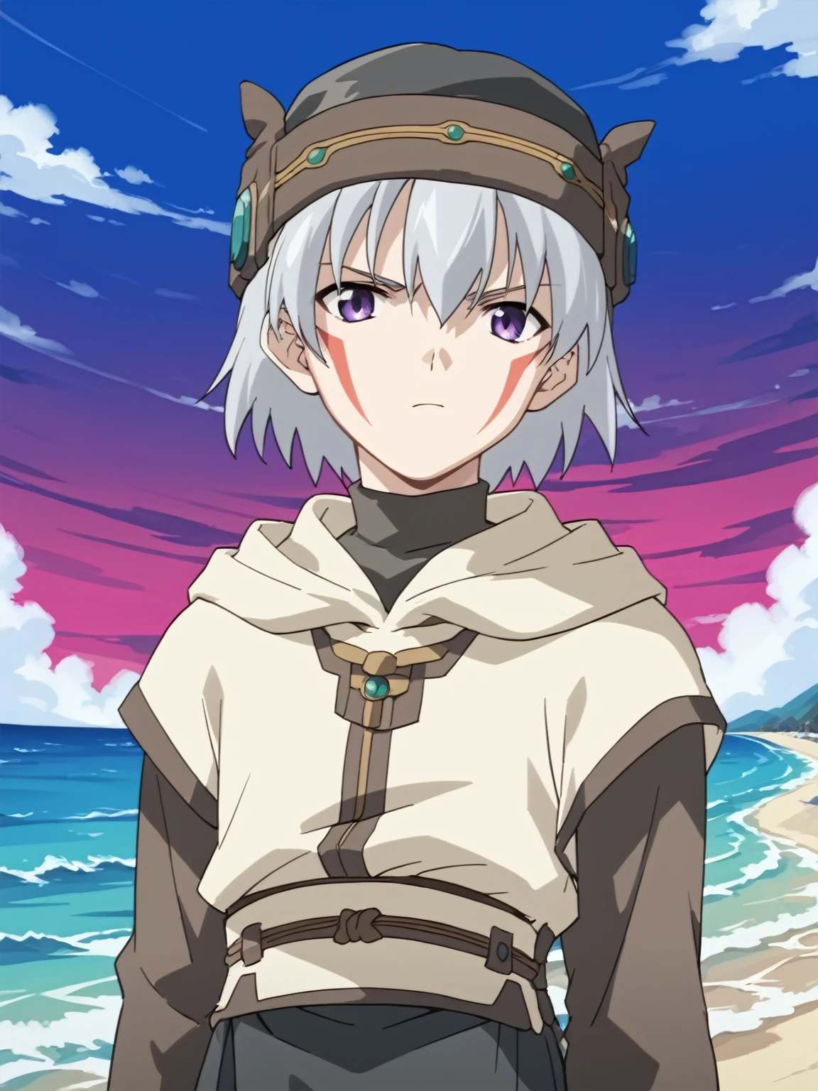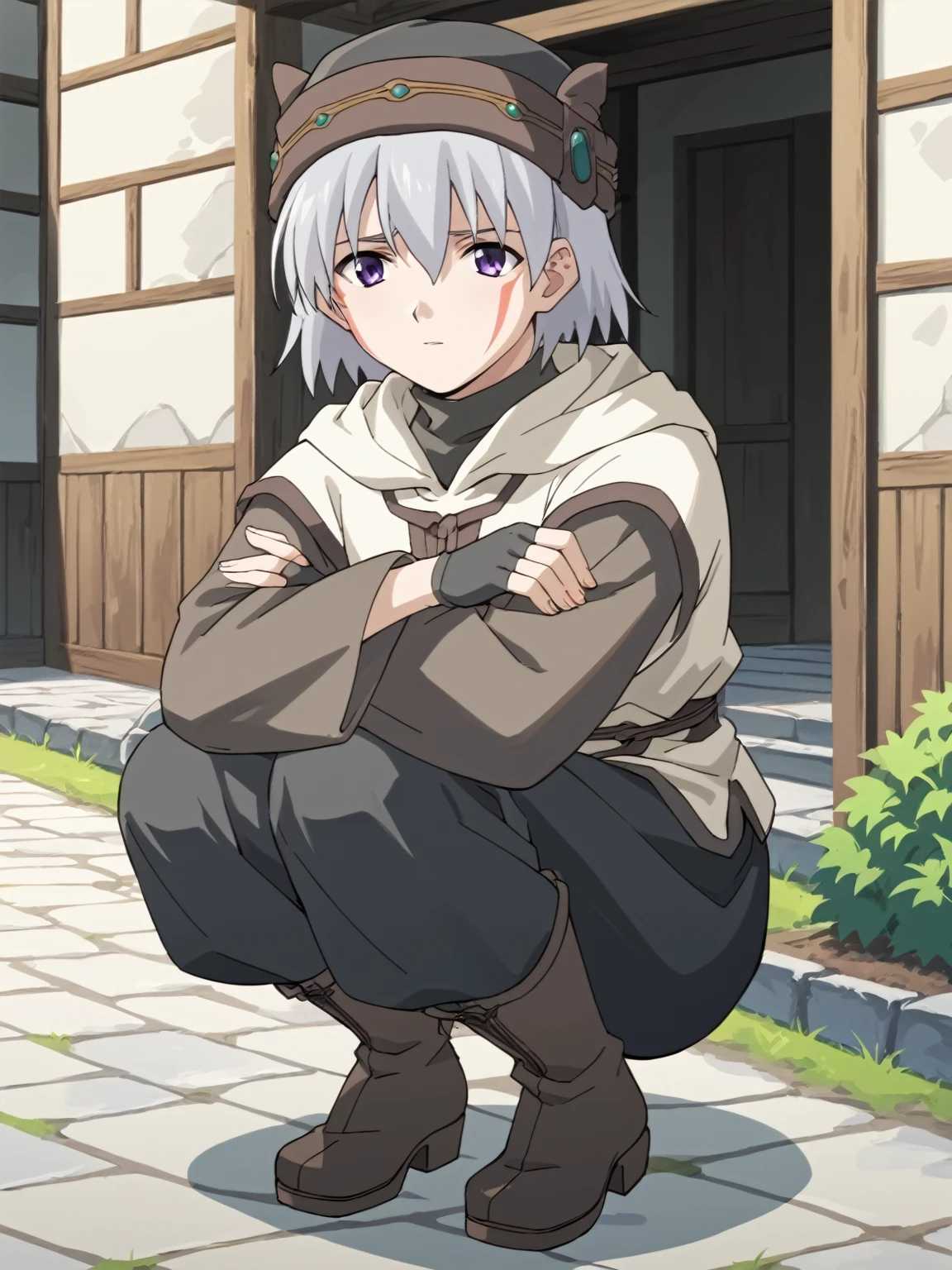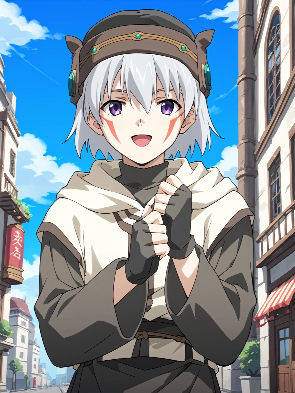 General: 1boy, male focus, solo, short hair, white hair, hat, purple eyes, facial mark, facepaint, long sleeves, robe, gloves, fingerless gloves, boots