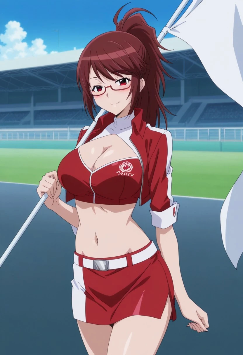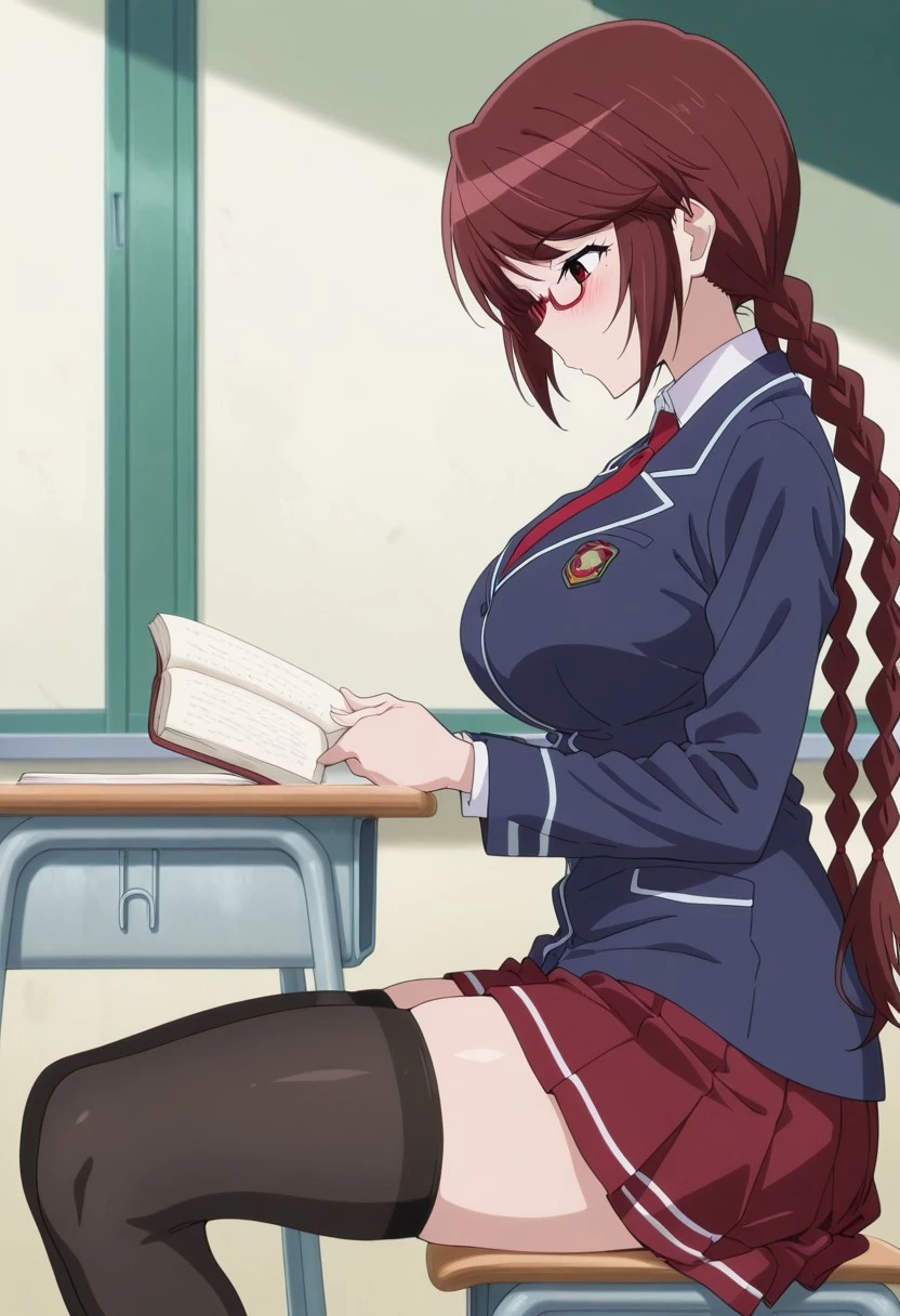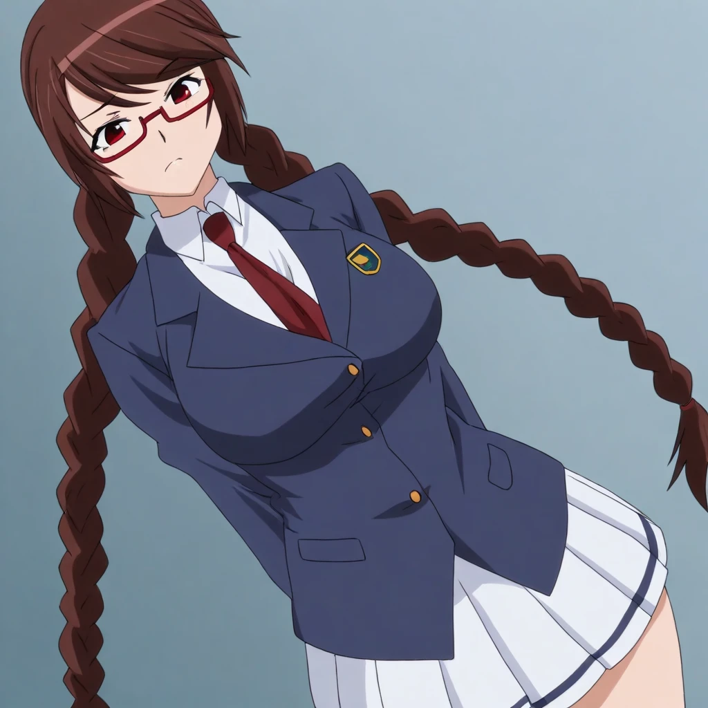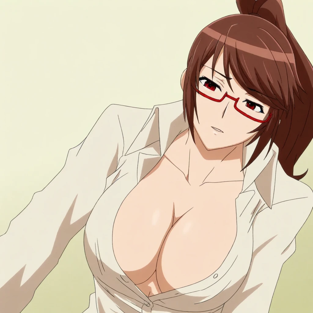 brown hair, long hair, swept bangs, red eyes, glasses, under-rim eyewear, large breasts,