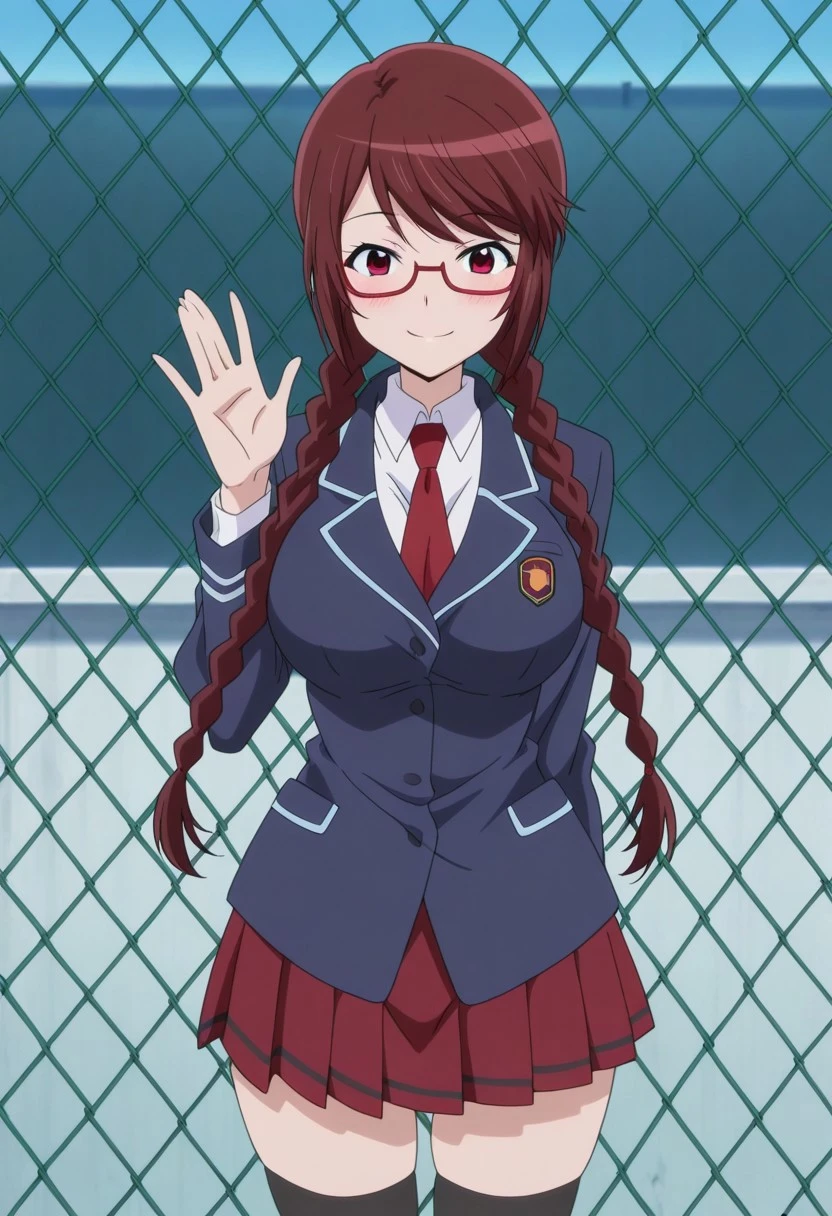 uniform, blue blazer, white shirt, red tie, red skirt, pleated skirt, black thighhighs,