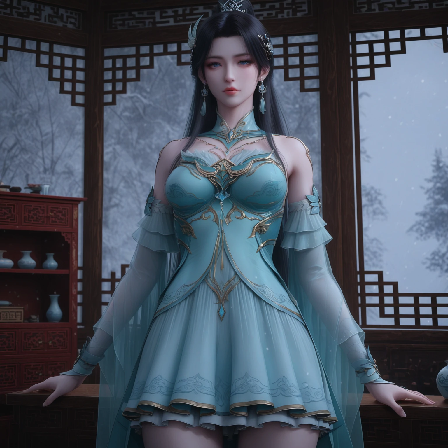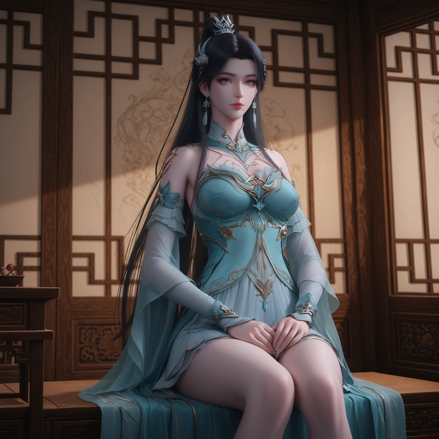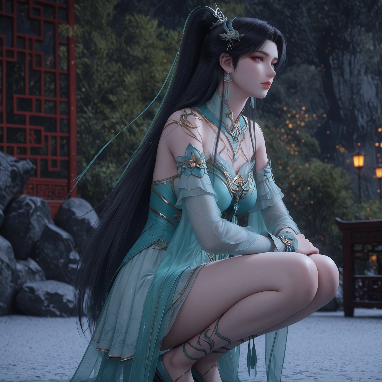 guxuner, 1girl, solo, black hair, chinese clothes, detached sleeves, earrings, dress, green dress, hair ornament, jewelry, long hair, ponytail,