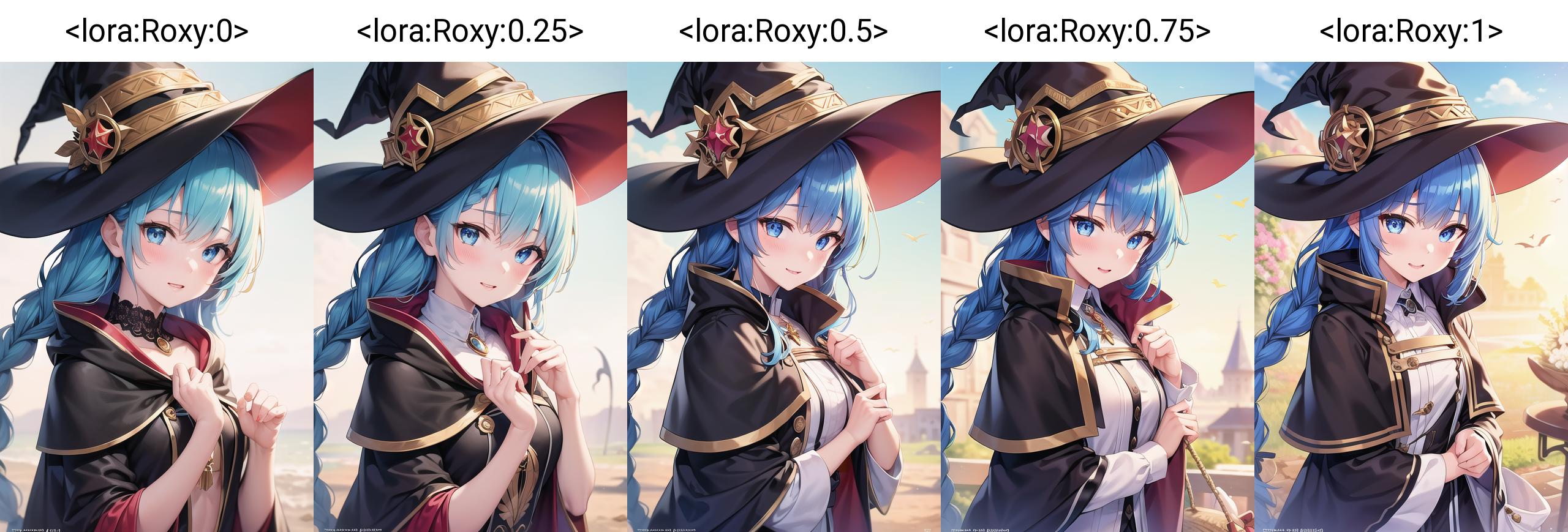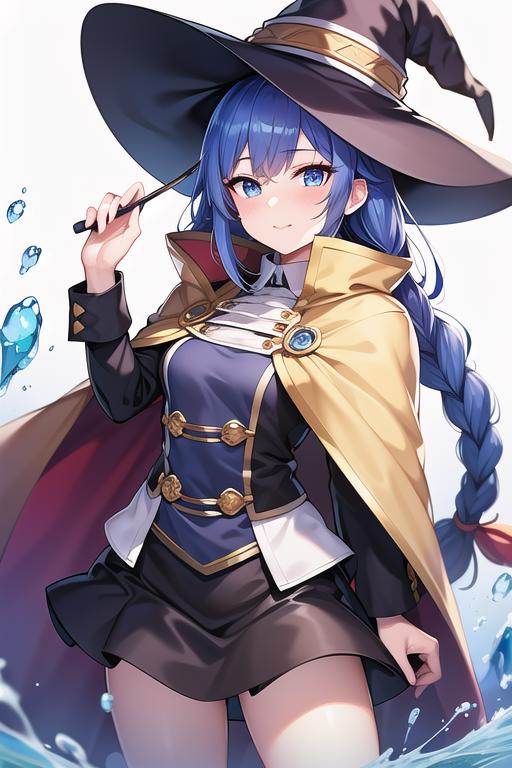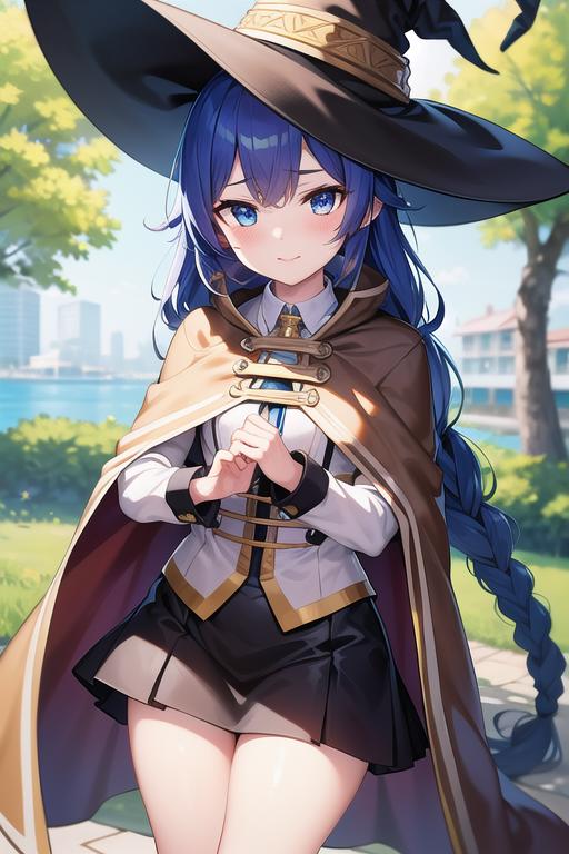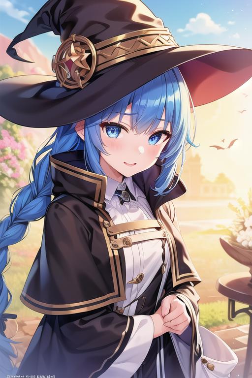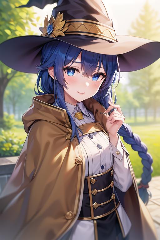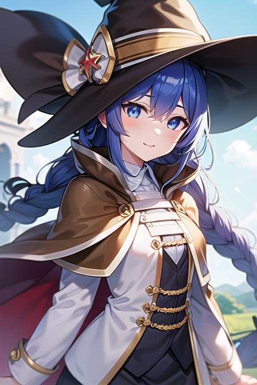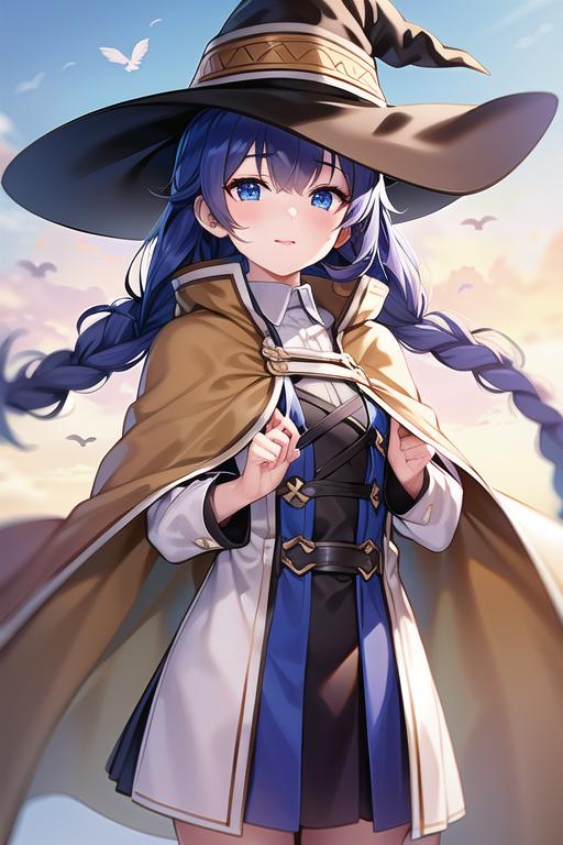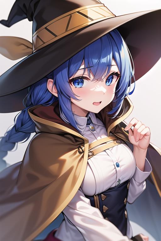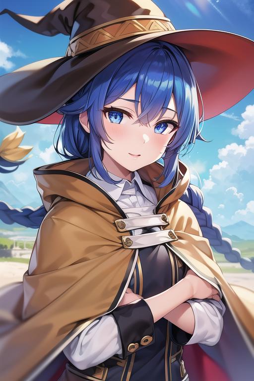 (roxy migurdia), blue eyes, blue hair, bangs, brown cape, witch hat, braid,