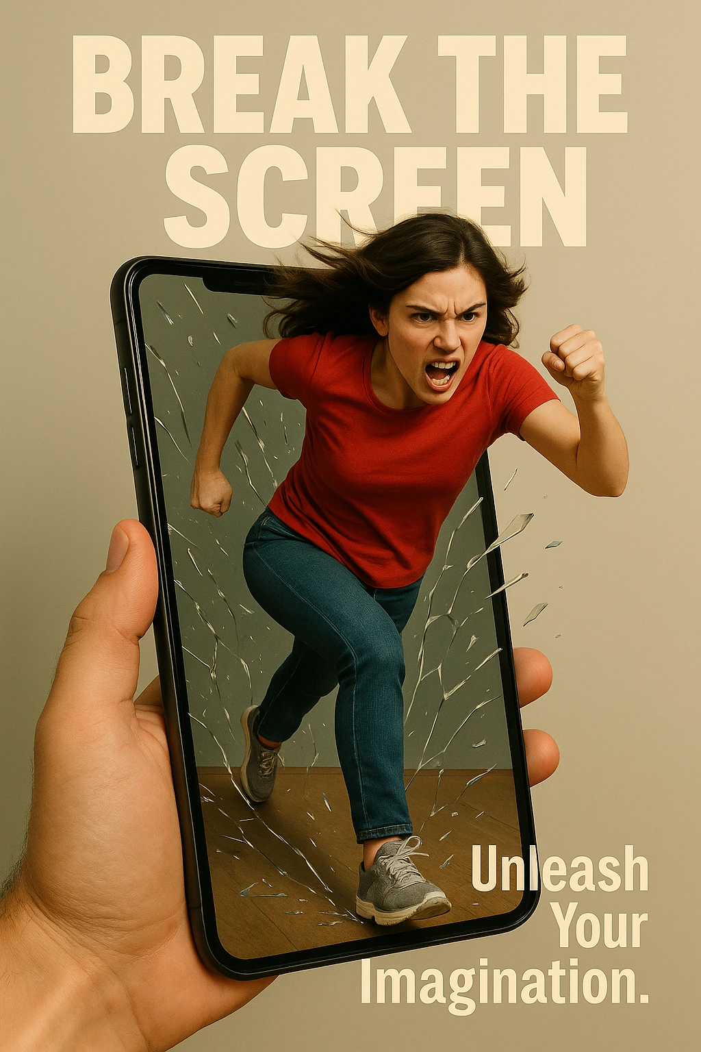 创造逼真的手持手机视角,呈现从屏幕中走出的立体人物效果