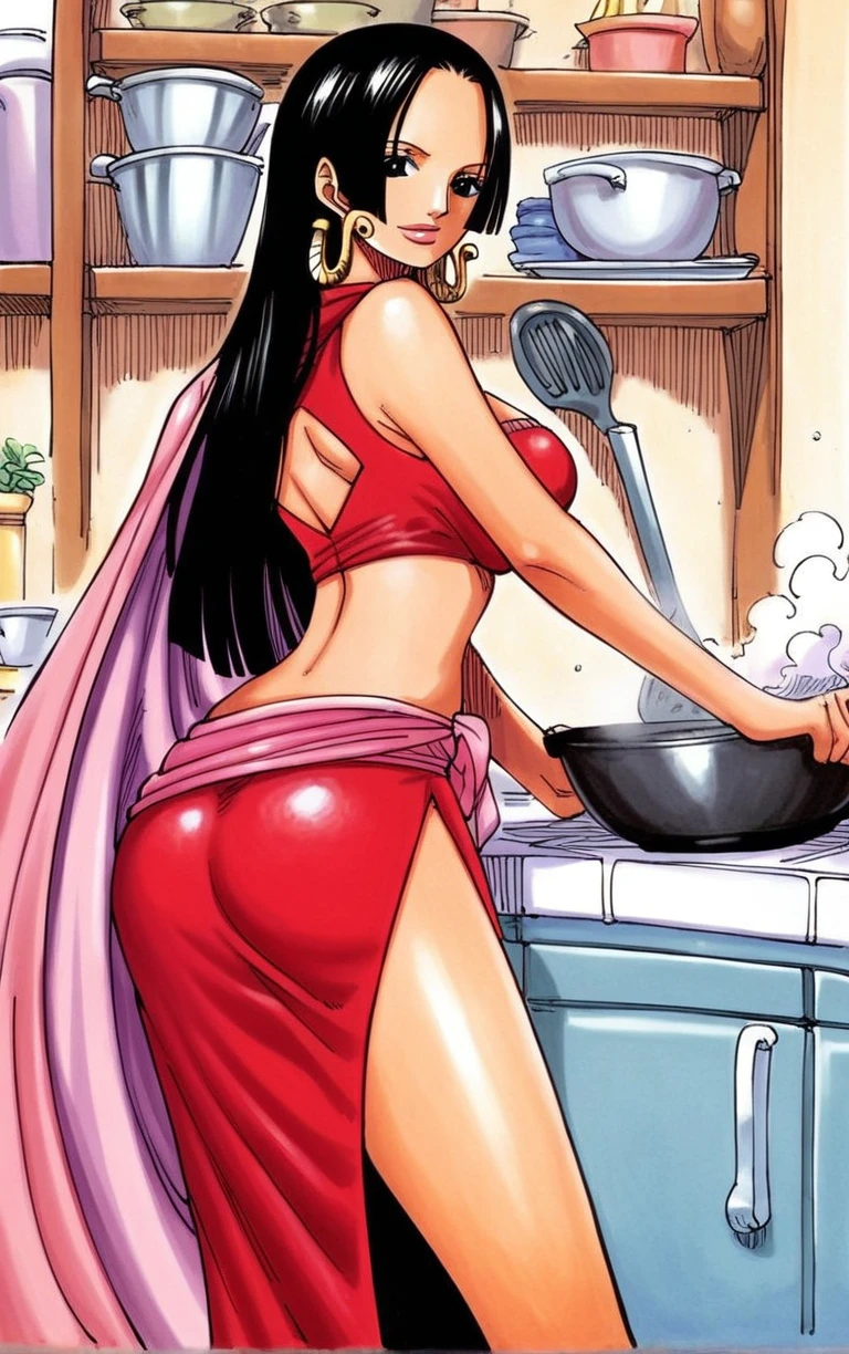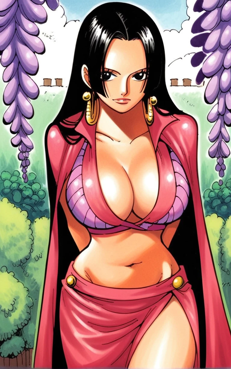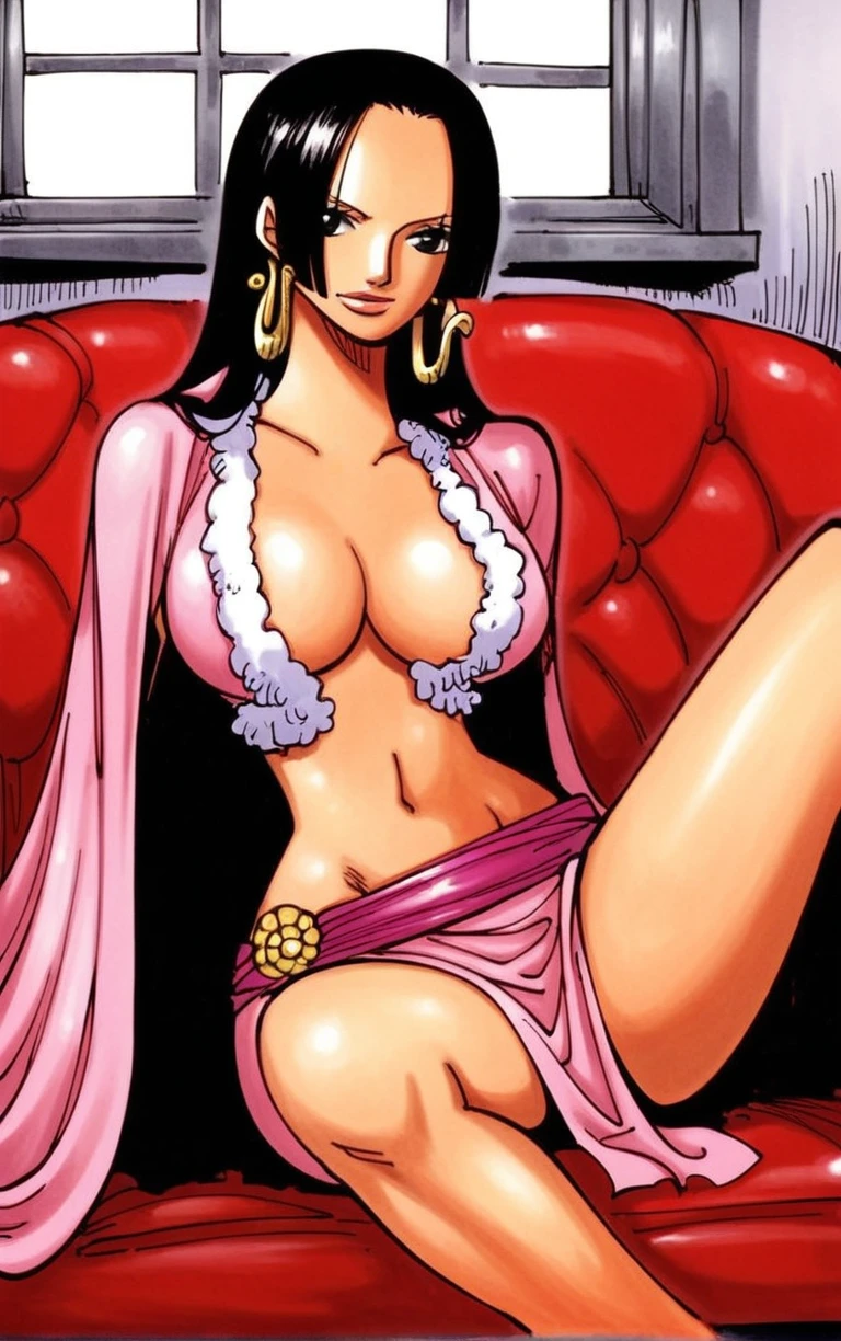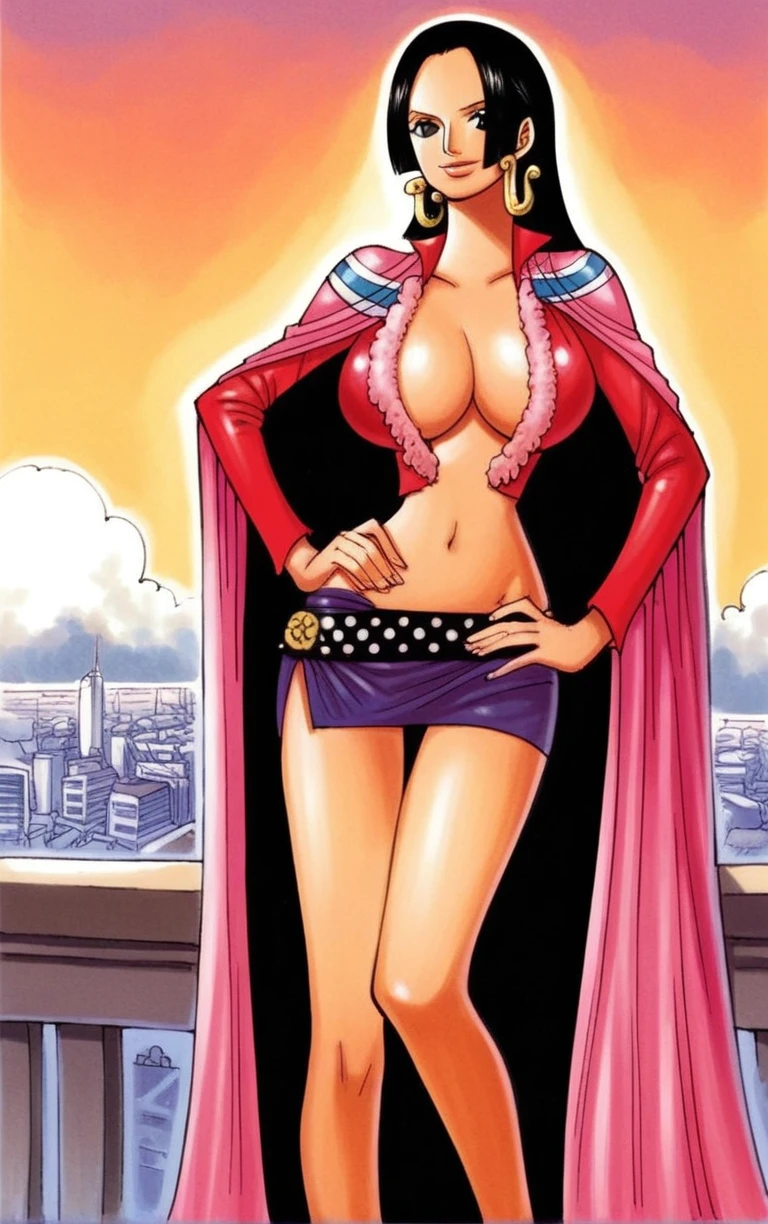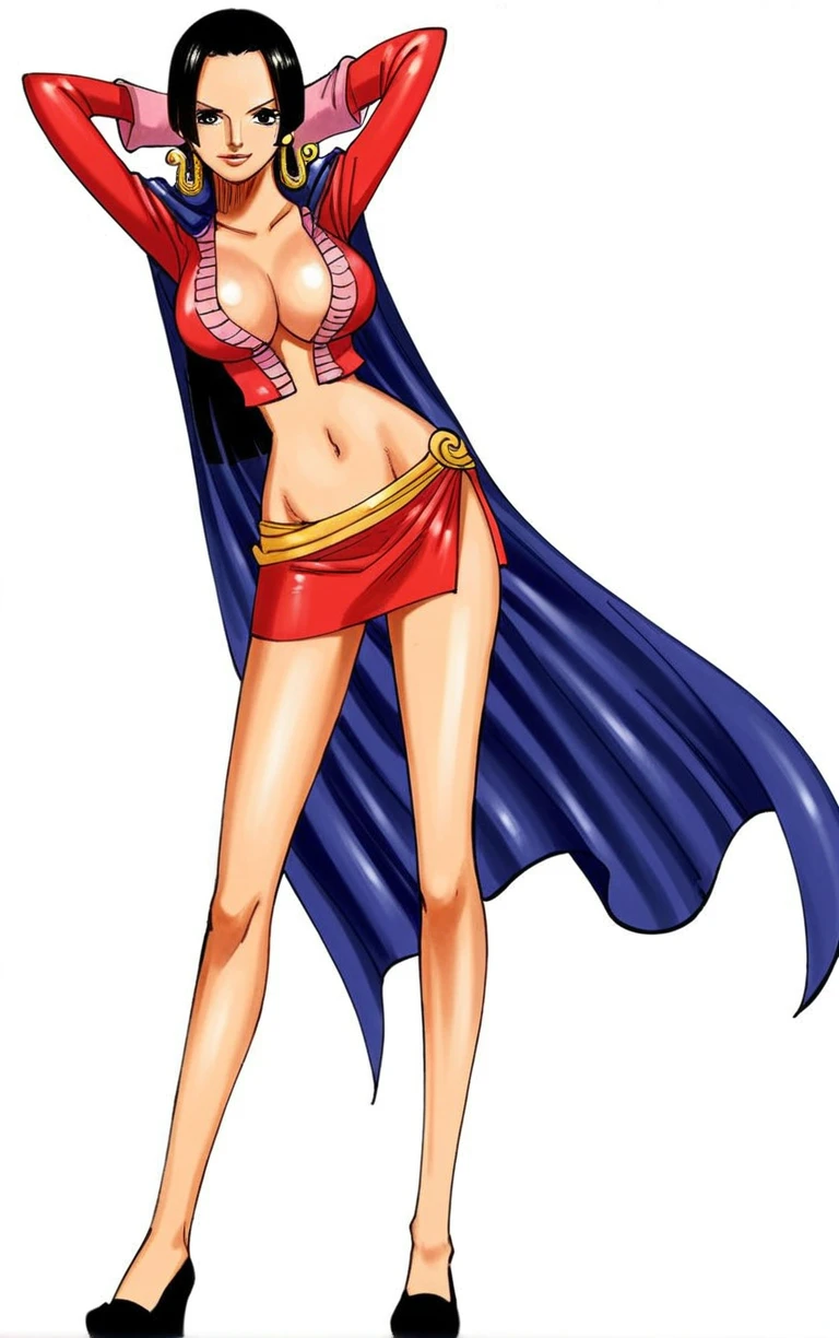1girl, boa hancock, large breasts, long hair, black hair, jewelry, earrings, midriff, cape, cleavage, long legs, navel, side slit, crop top, no bra, black eyes, groin,