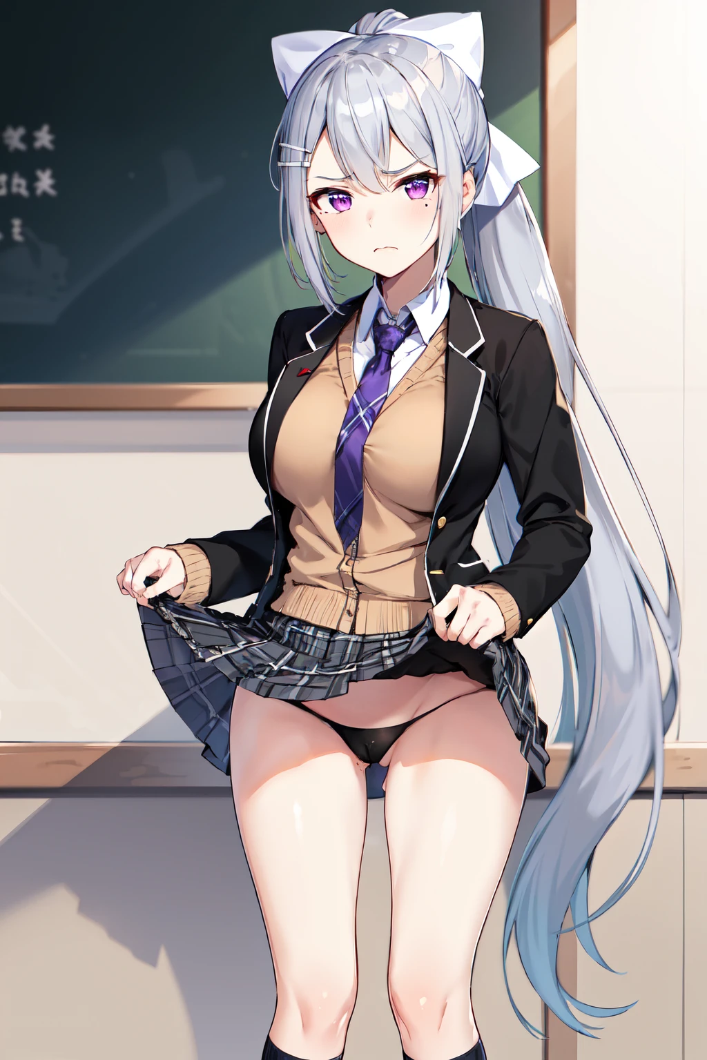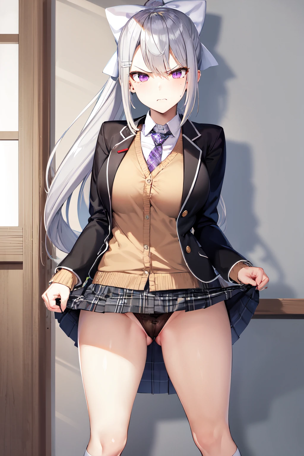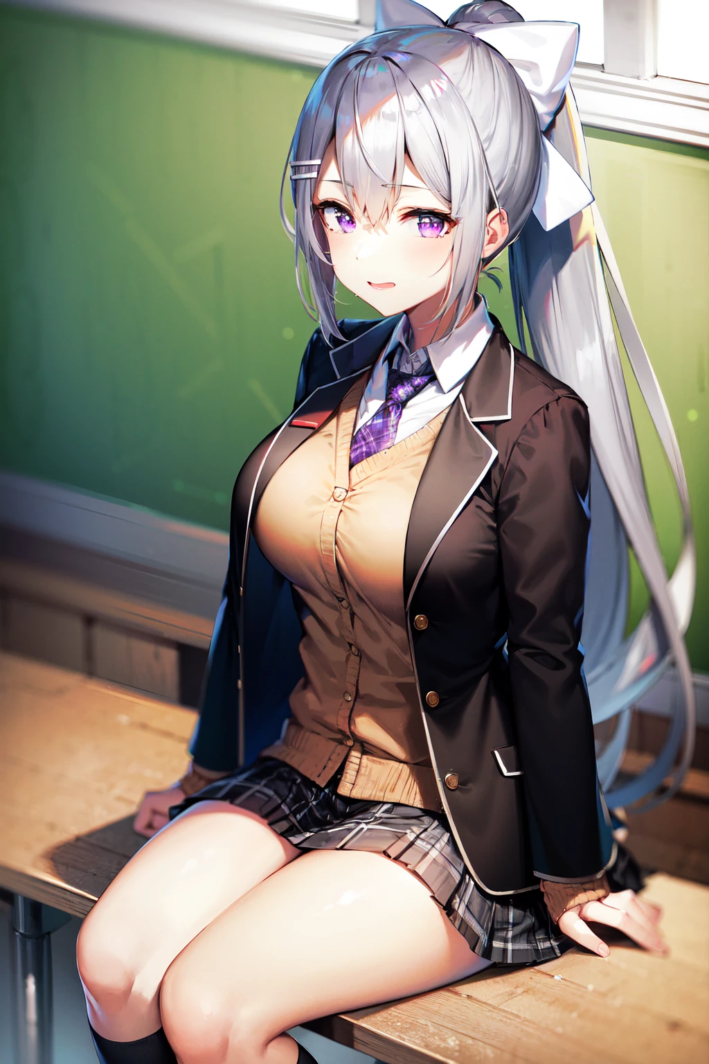 higuchi kaede, 1girl, solo, long hair, mole under eye, purple eyes, ponytail, white bow, hair bow, blazer, purple necktie, hairclip, open clothes, cardigan, school uniform, grey hair, black jacket, collared shirt, plaid skirt, long sleeves, grey skirt