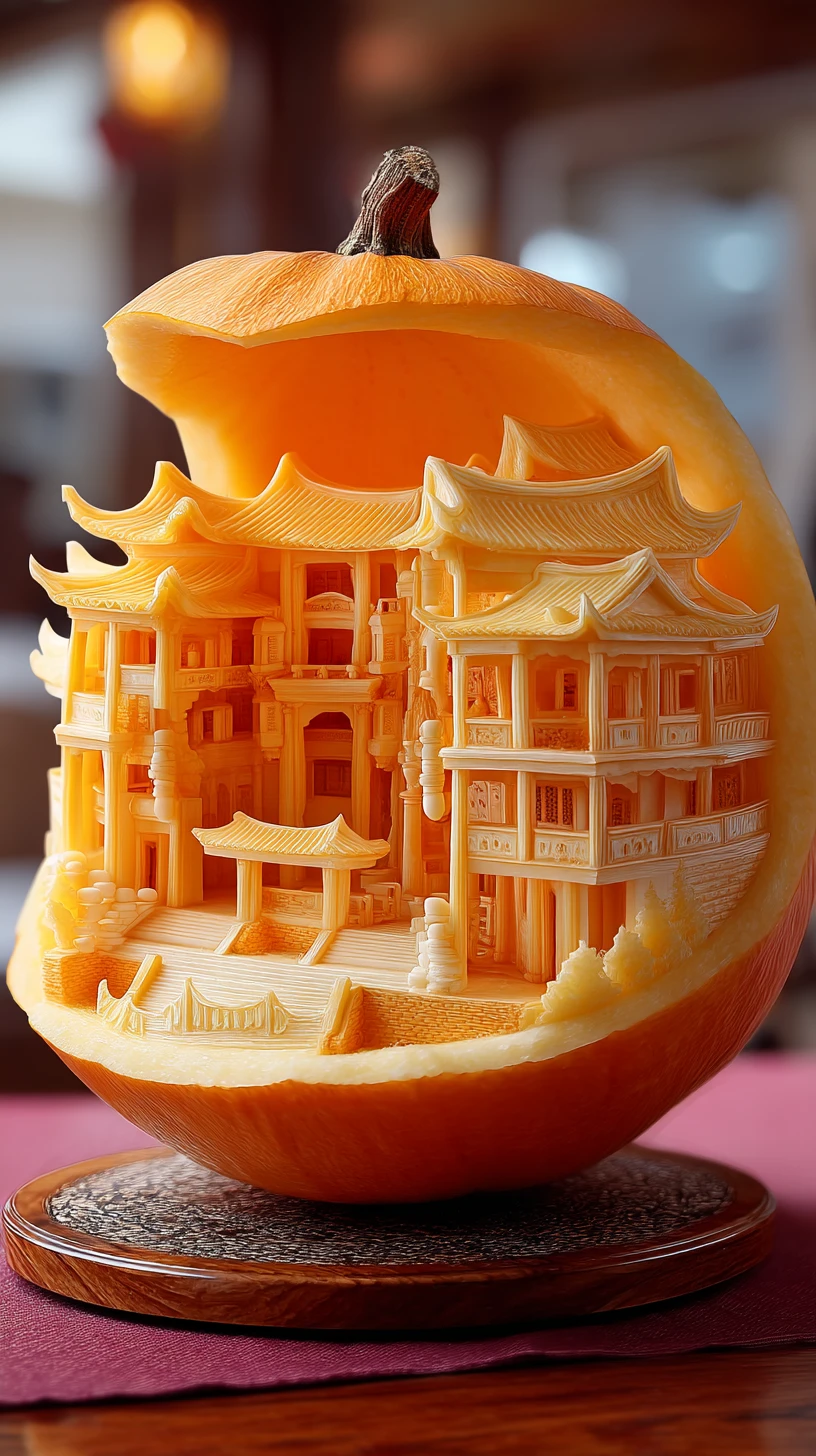 3D food carving art, using (XXX) to carve out the shape of Fujian earth building, the circular earth building is staggered, the windows and porches in the building are clearly visible, the orange-yellow color of the pumpkin gives the building a warm tone, matched with a plain background, reflecting the perfect combination of traditional folk house culture and food art.