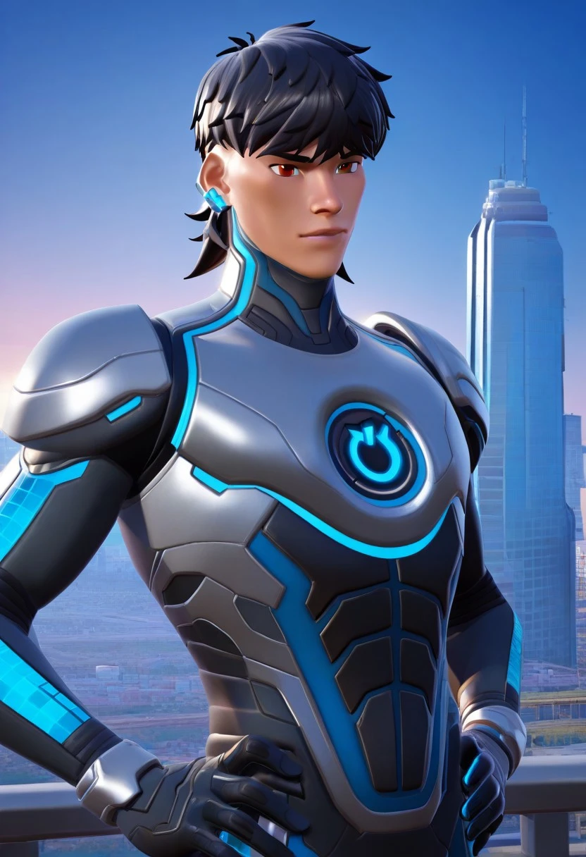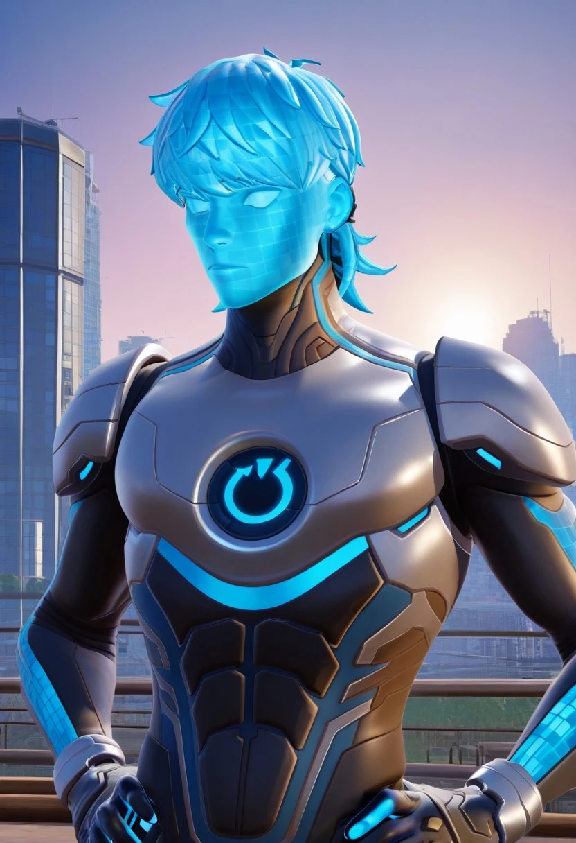 • reboot_man, 1boy, blue grid skin,blue grid hair, mullet, blue ear accessory on left ear, small floating blue cubes around, high-tech bodysuit, silver and black suit, glowing blue lines, circuit patterns, futuristic armor, full body, sci-fi, sleek design, tight suit, glowing chest reboot symbol, digital grid accents,