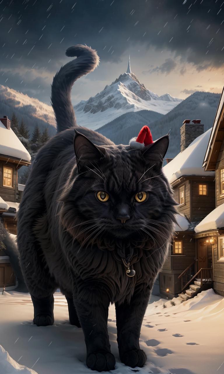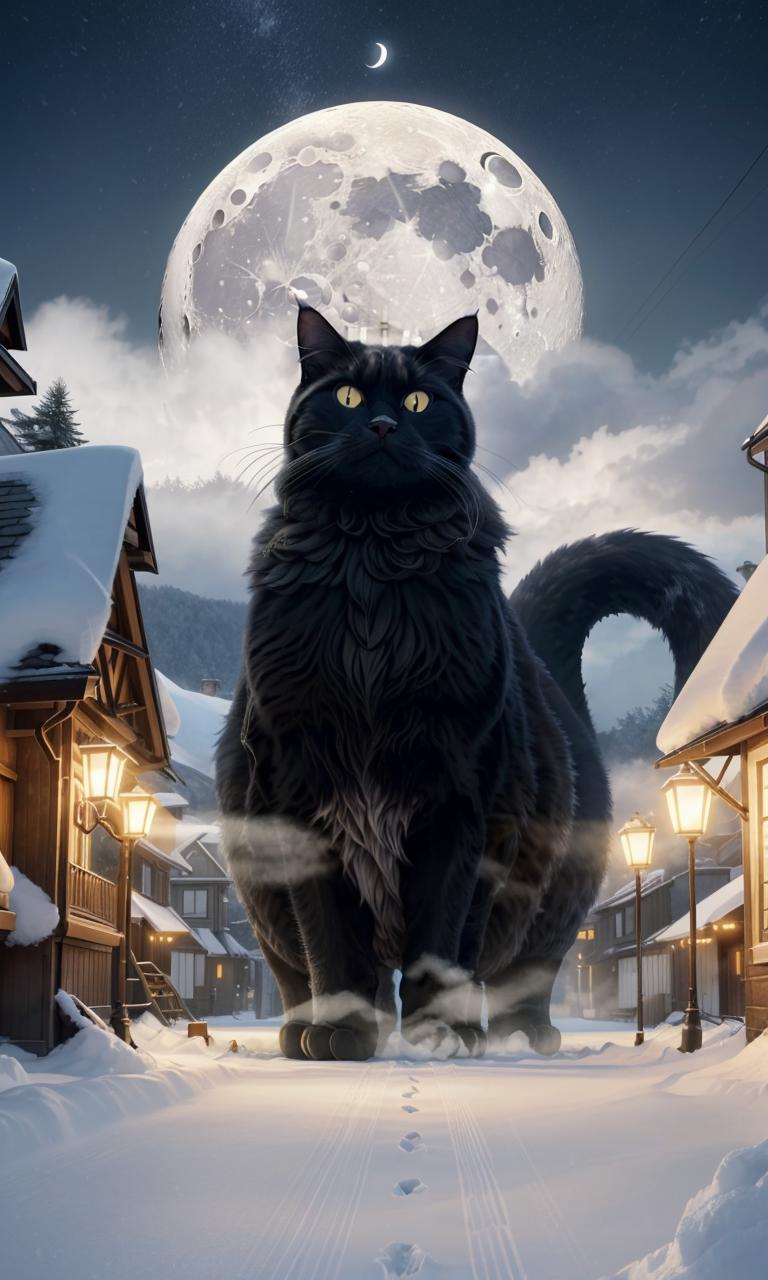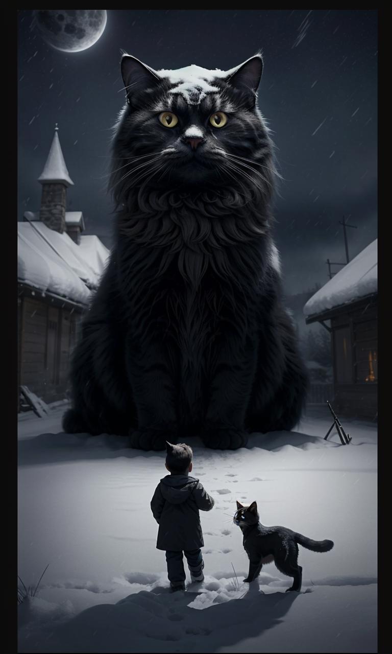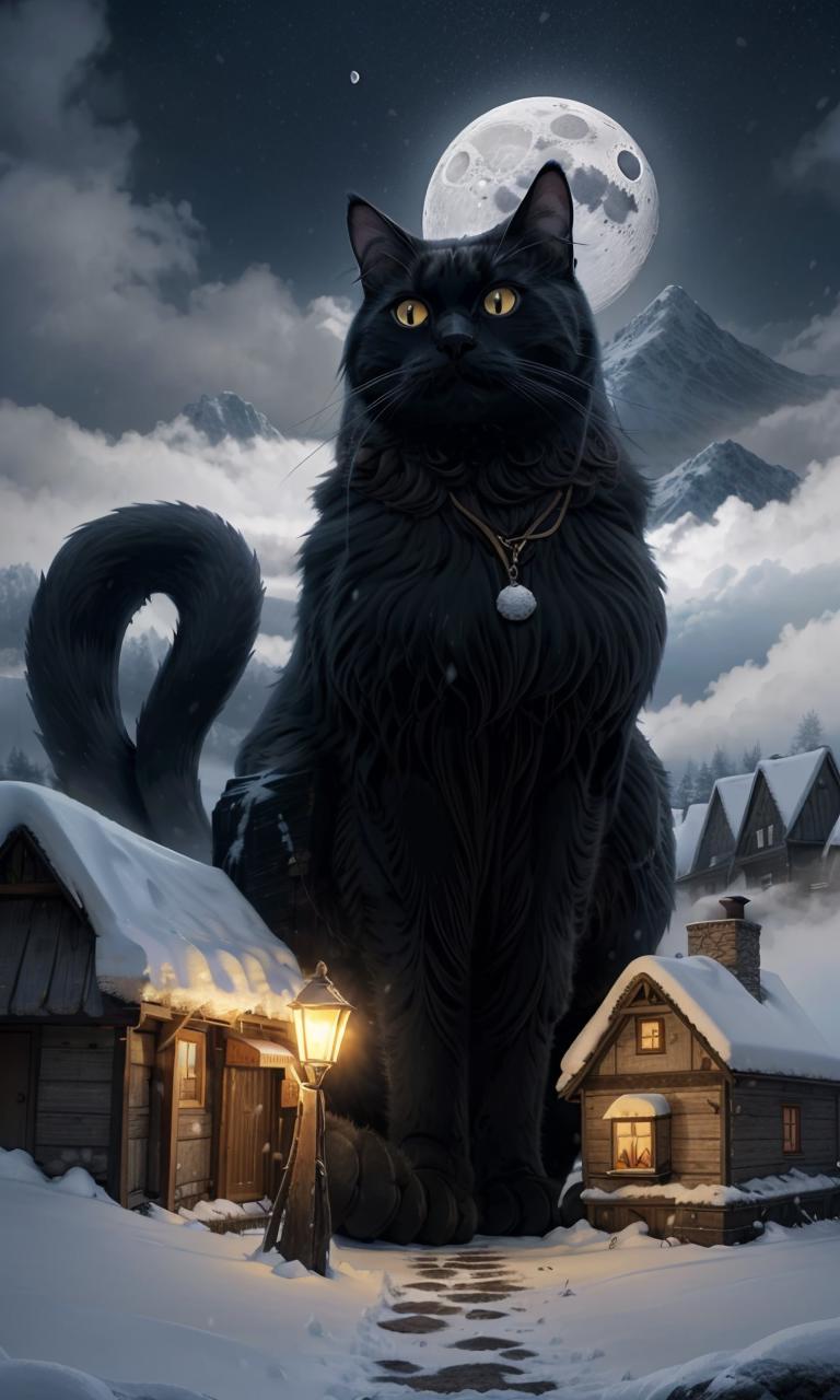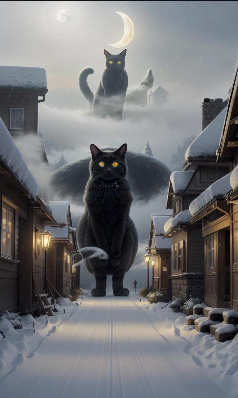Best prompts to use are Giant or Gigantic cat, snowy, glowing eyes.