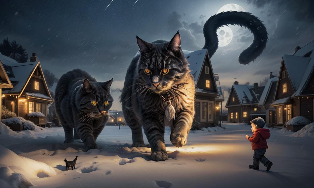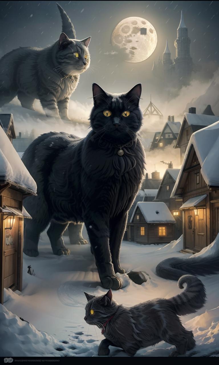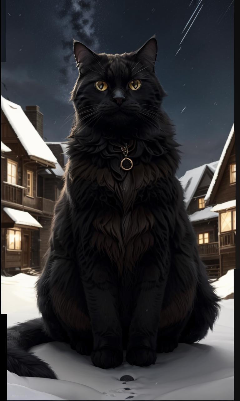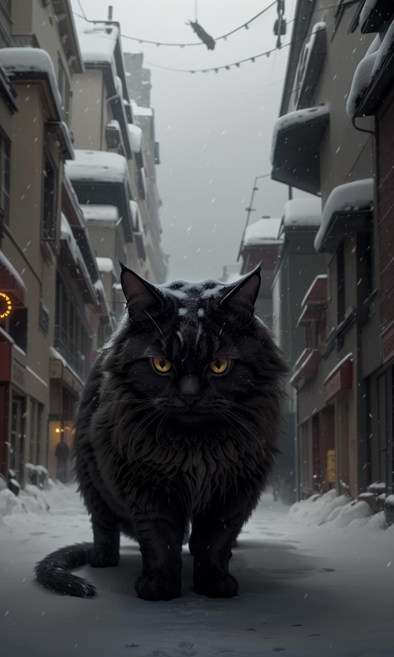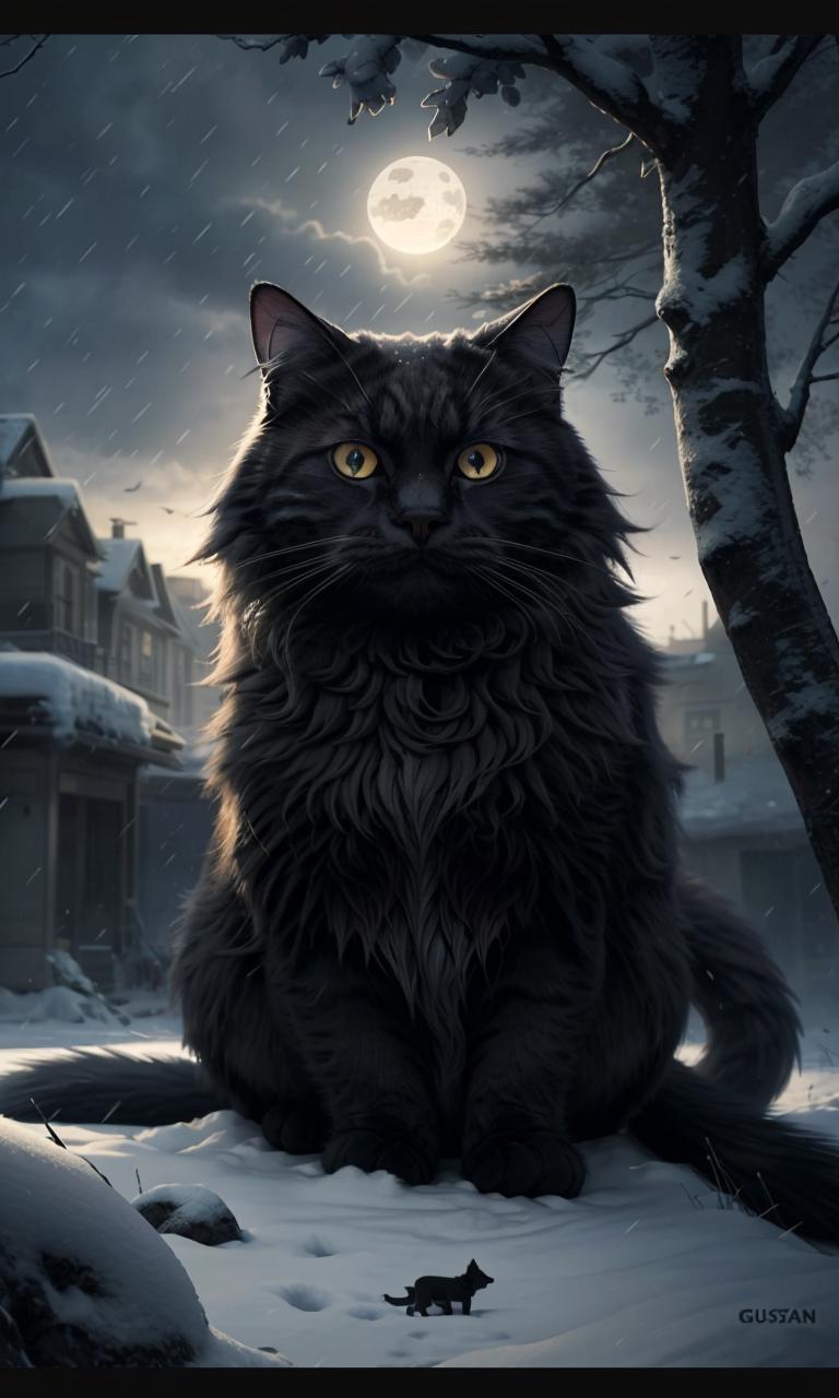 Best prompts to use are Giant or Gigantic cat, snowy, glowing eyes.