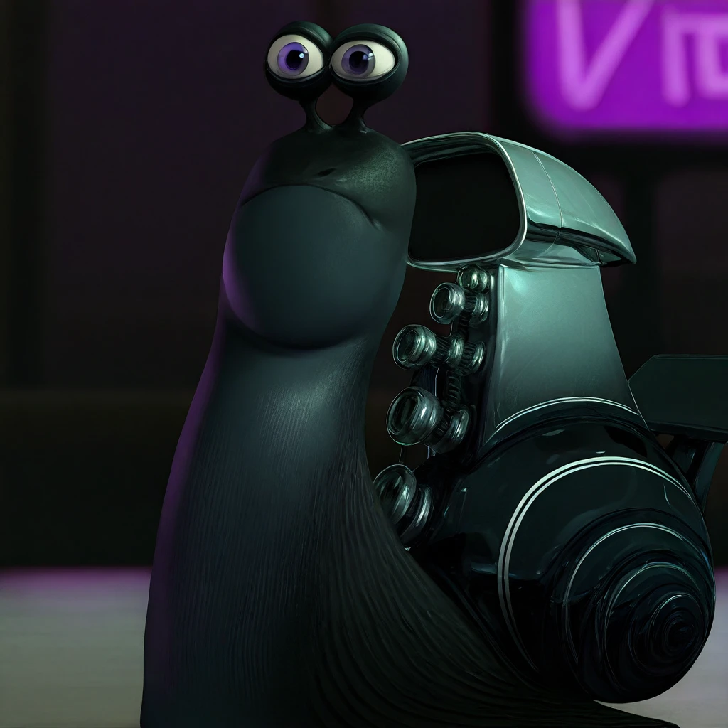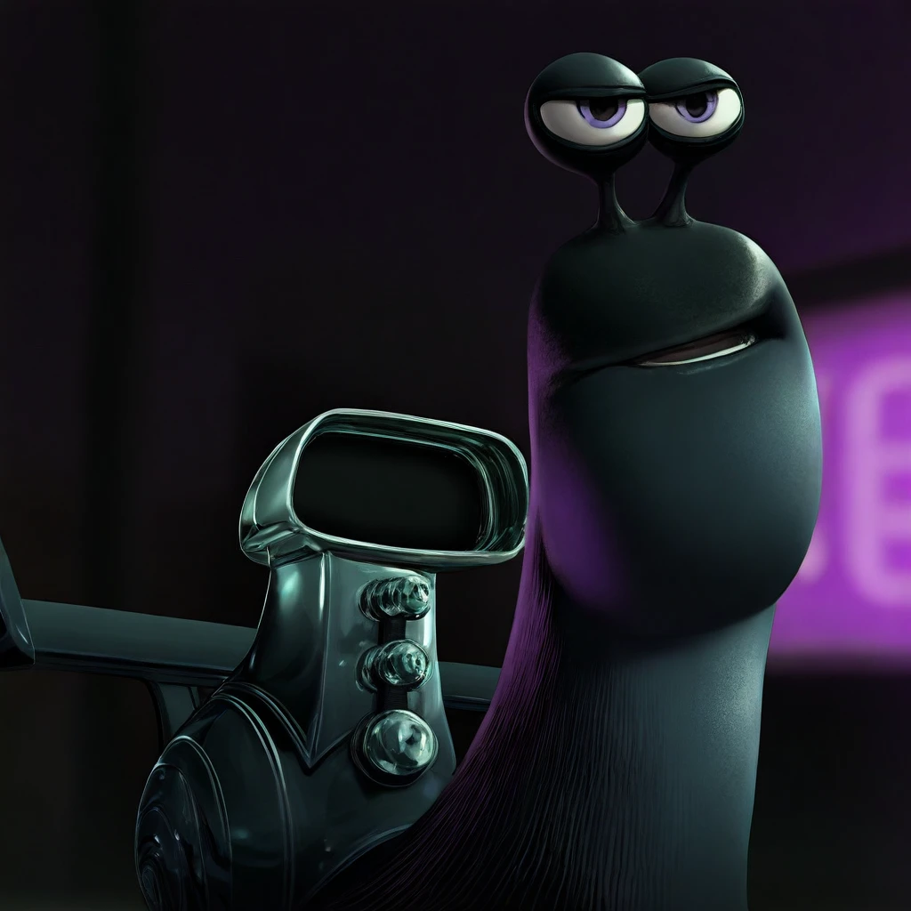 Whiplash, snail, Black skin, purple Eyes, Black shell, black shell with jet engine with The number 46, furry,