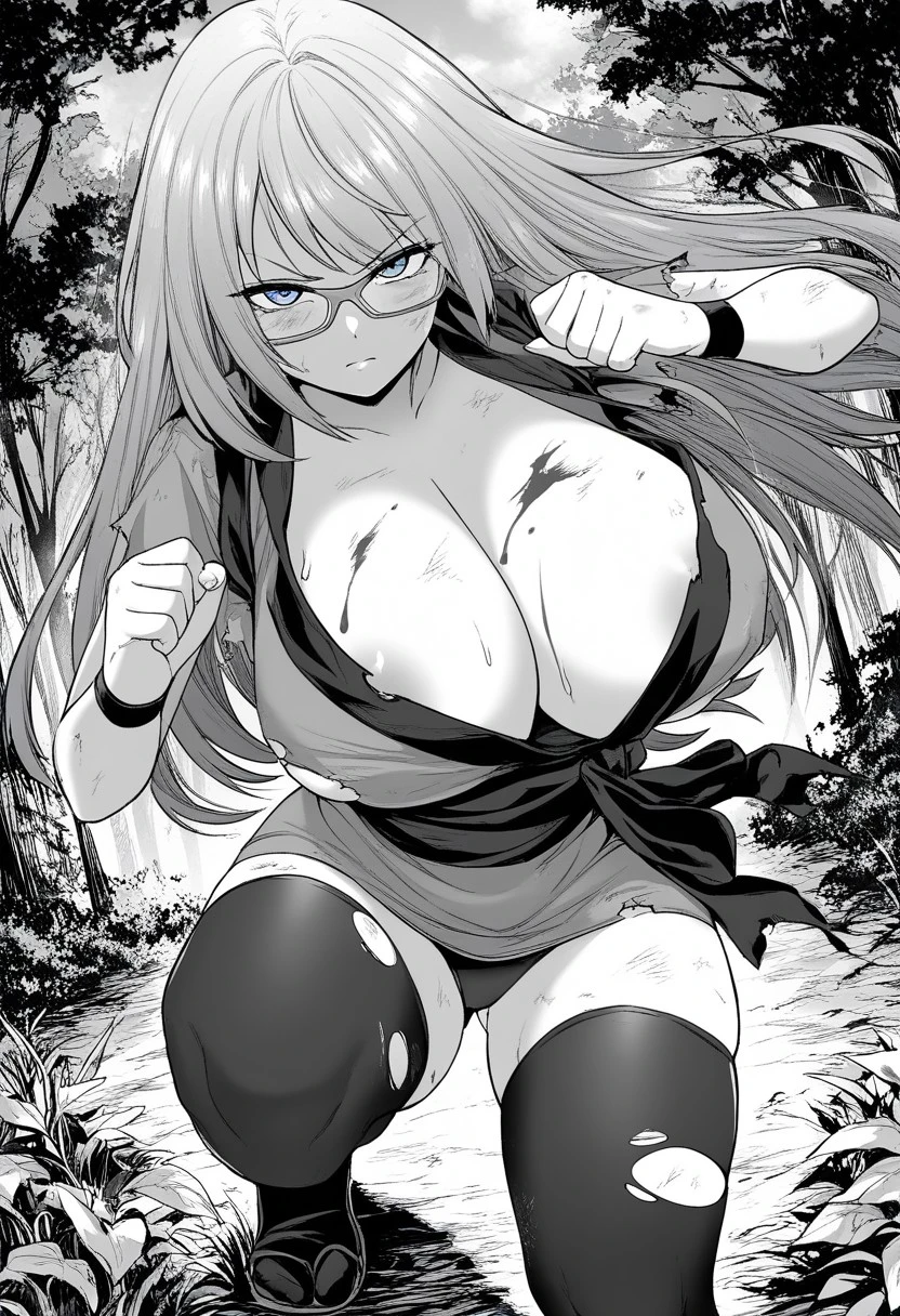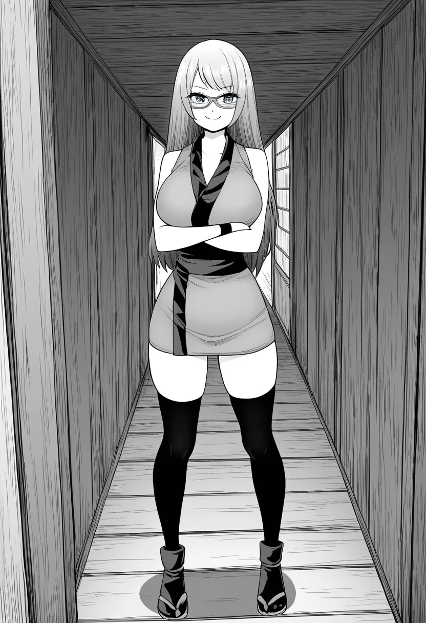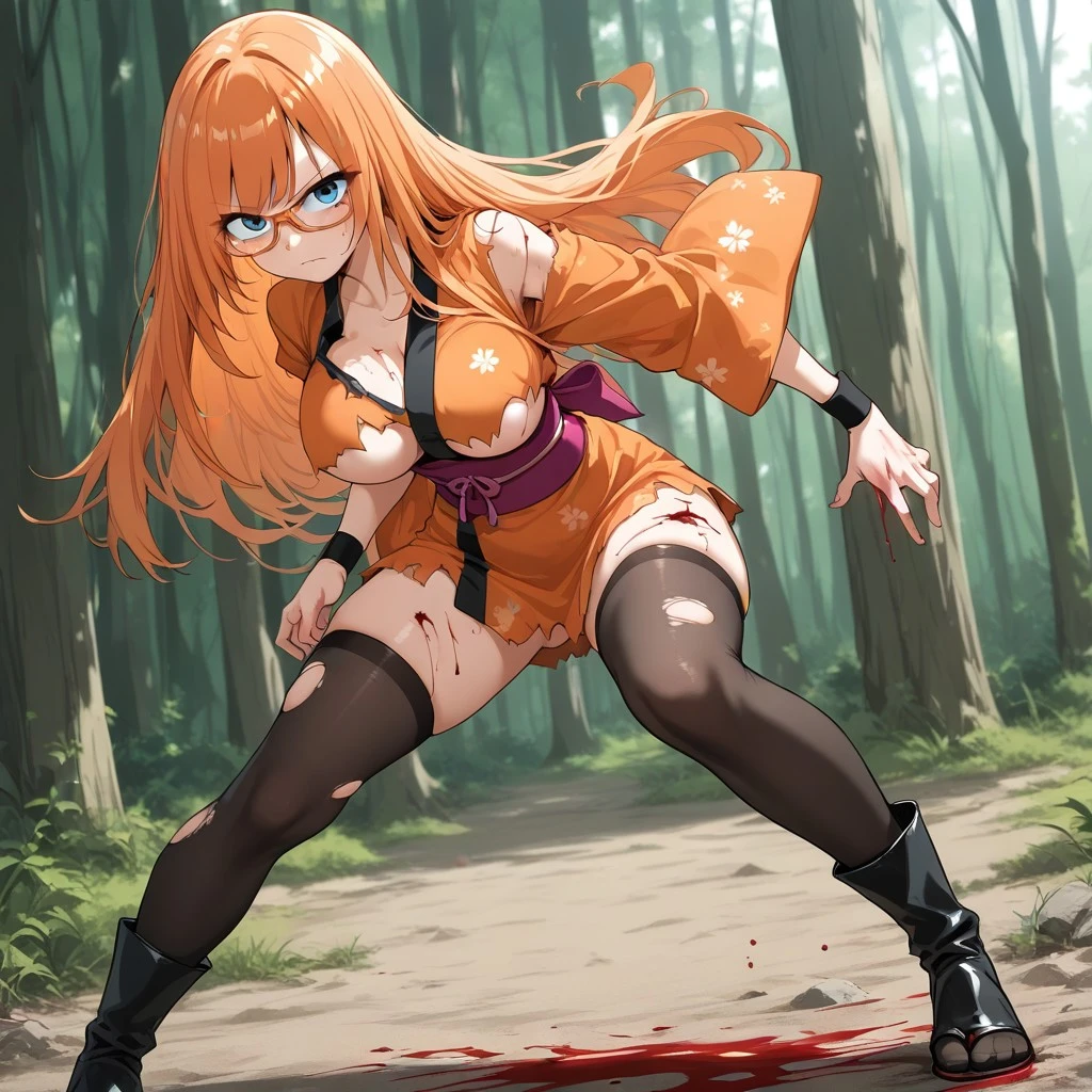 Mitsuki, 1girl, solo, blue eyes, orange hair, long hair, large breasts, glasses, orange glasses, short kimono, orange kimono, short skirt, pink obi, black wristband, thighhighs, black thighhighs, ninja footwear