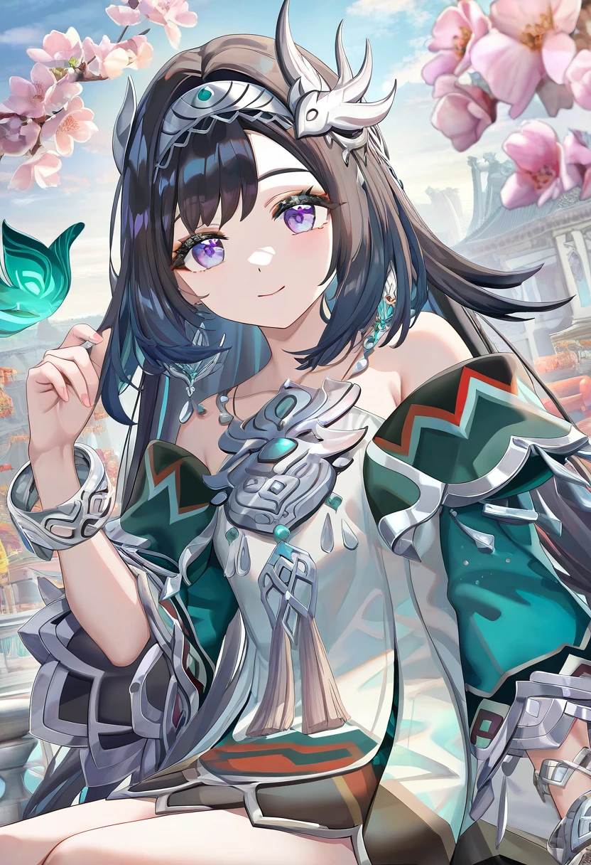 1girl,lan_yan_\(genshin_impact\),long hair,solo,purple eyes,jewelry,bare shoulders,feather hair ornament,off shoulder,bracelet,earrings,hairband,white dress,off-shoulder dress,long sleeves,如果你喜欢我的lora,欢迎来我的爱发电支持我,也可以定制角色/画风lora。闲鱼同名Wenaka_,多平台同名