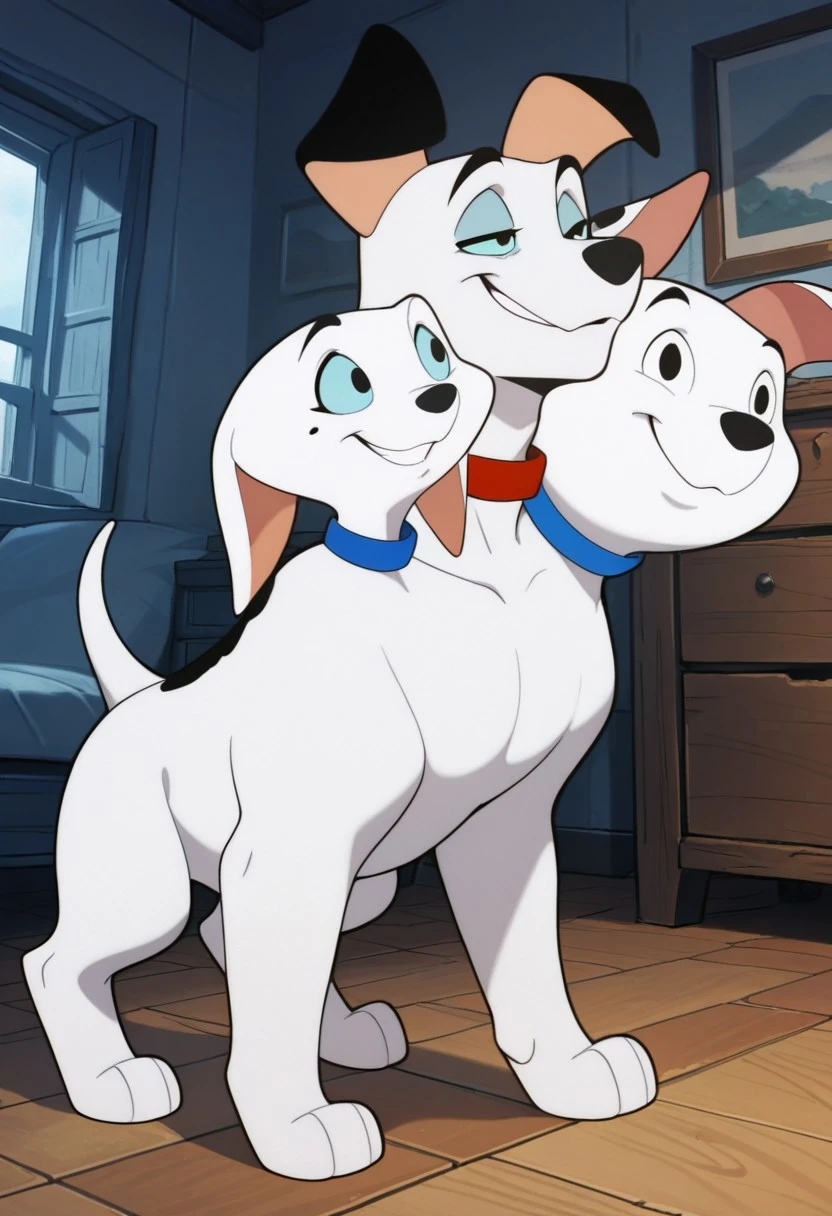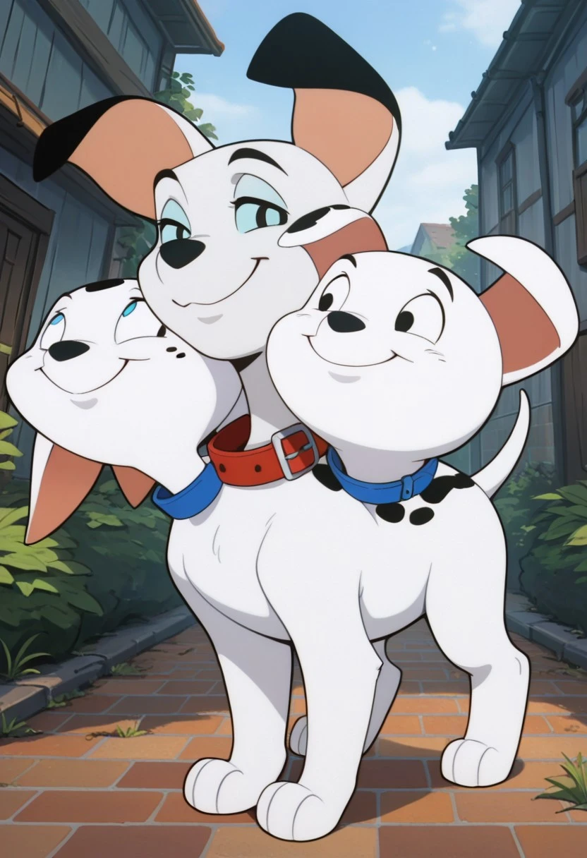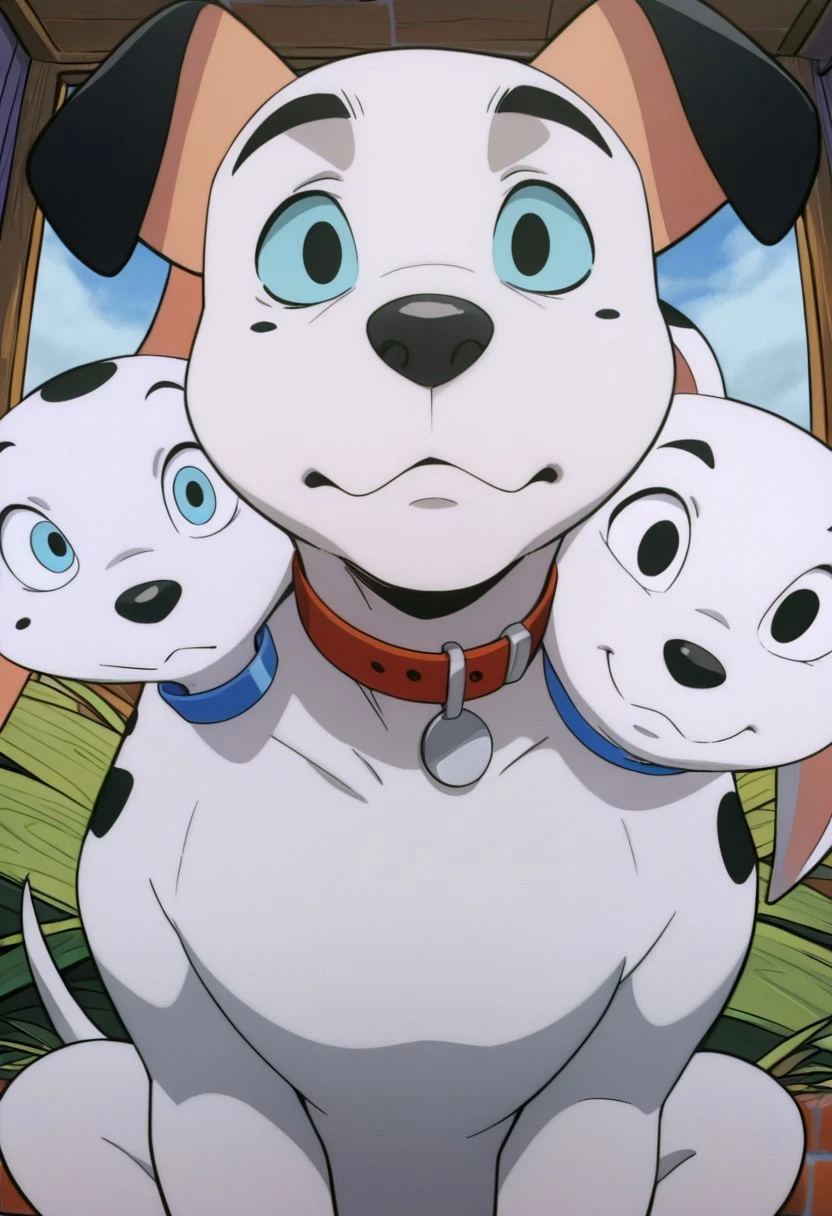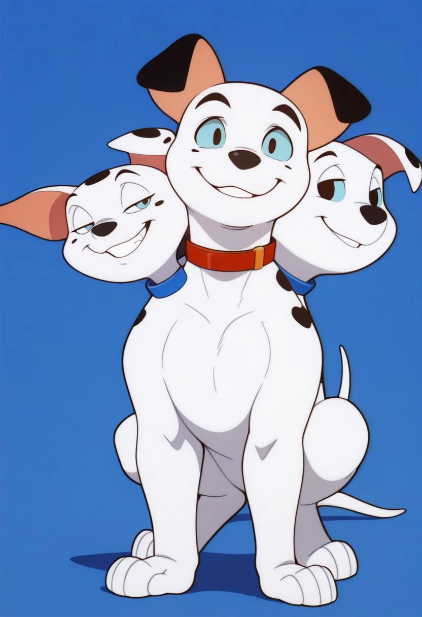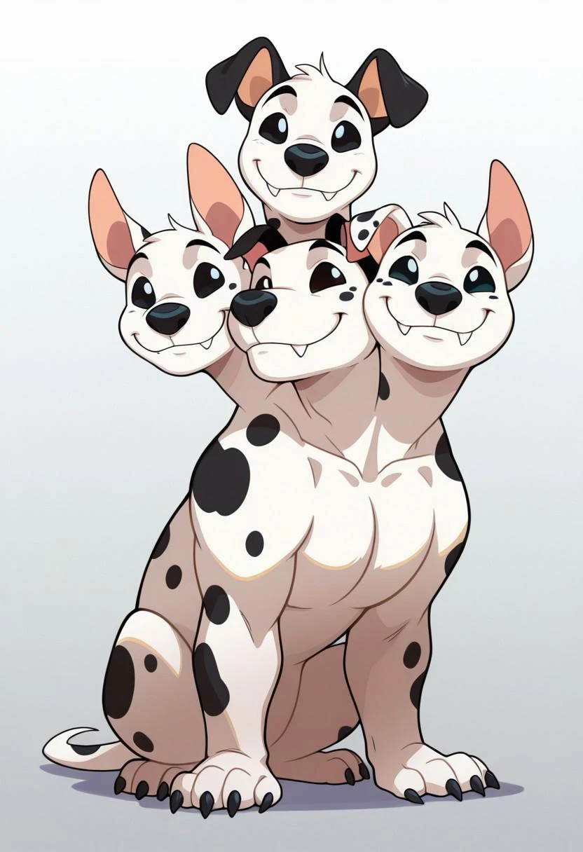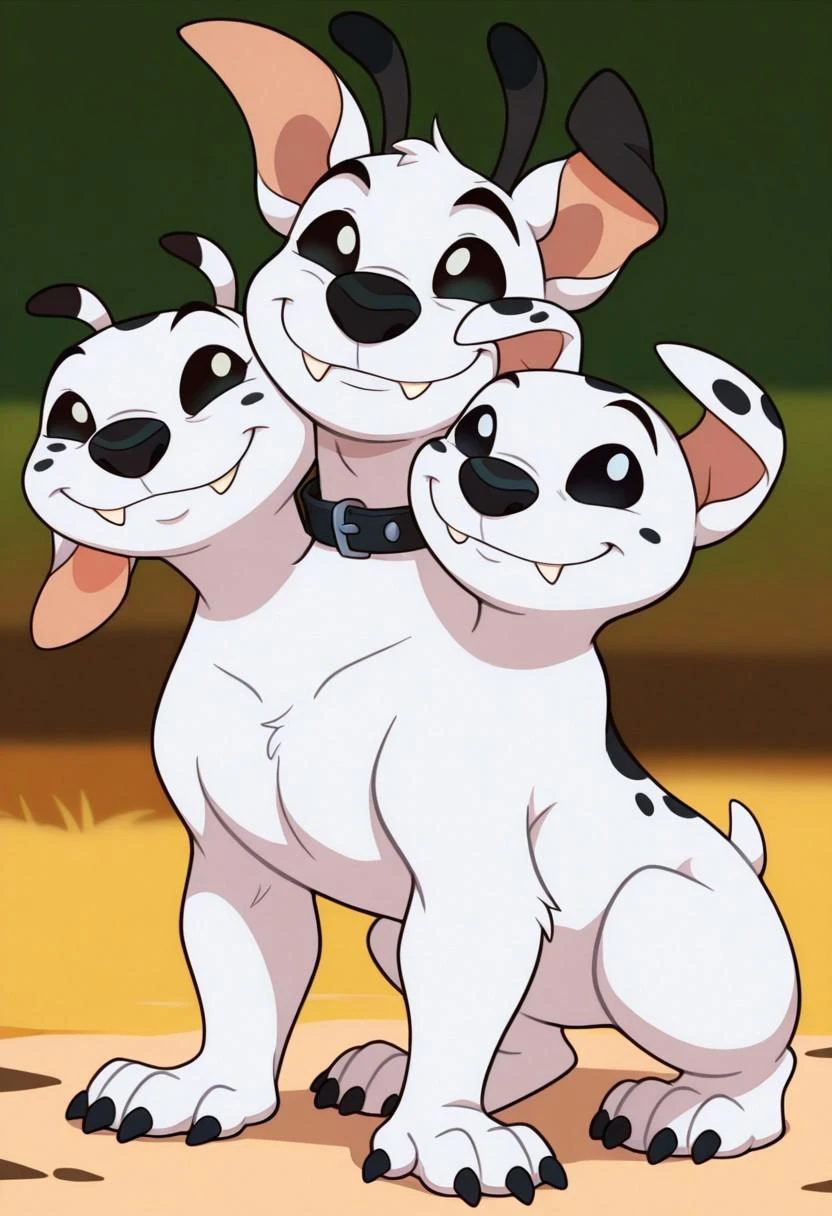 Prompt: barkio dalmatian, solo, dog, cerberus, 3 heads, dalmatian, white fur with black spots, black nose, tail, left_head_white_sclera_blue_pupils_mole_white_ear_blue_collar, center_head_blue_sclera_black_pupils_black_ears_red_collar, right_head_white_sclera_black_pupils_white_ear_with_spots_blue_collar