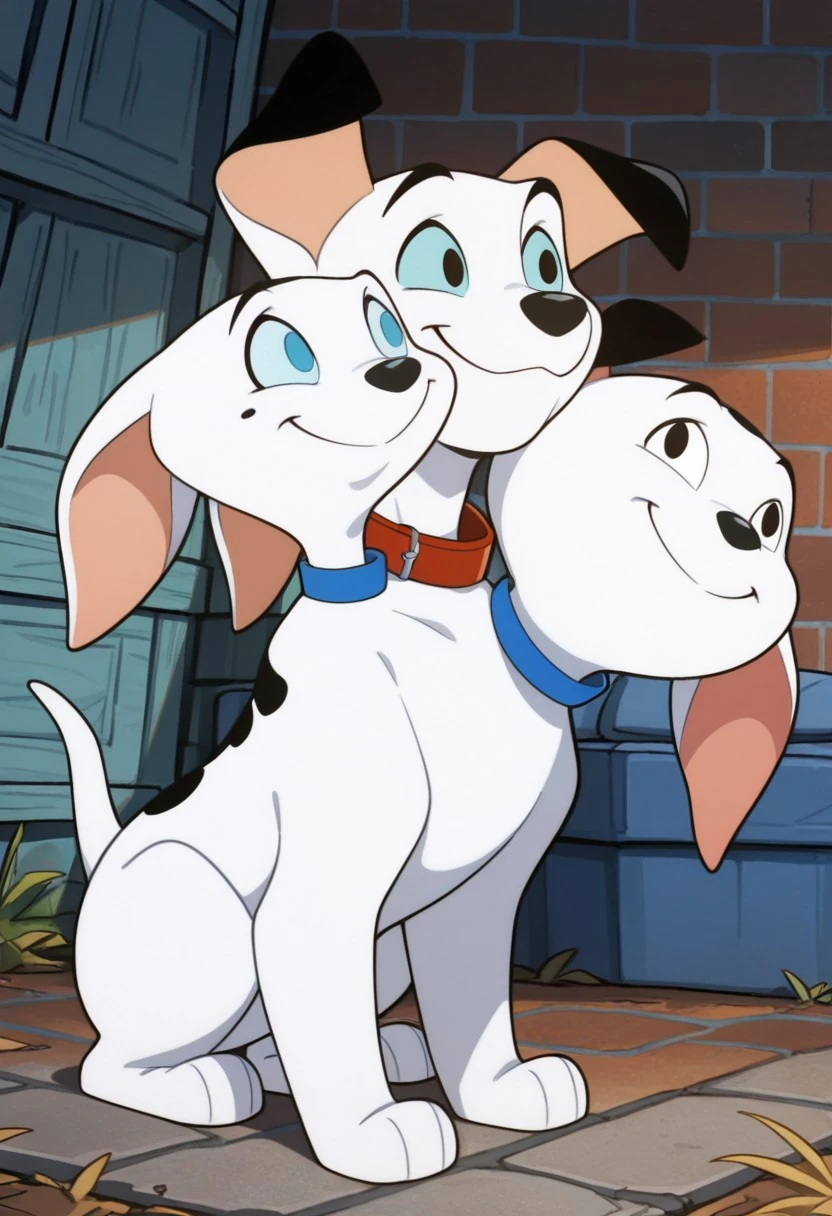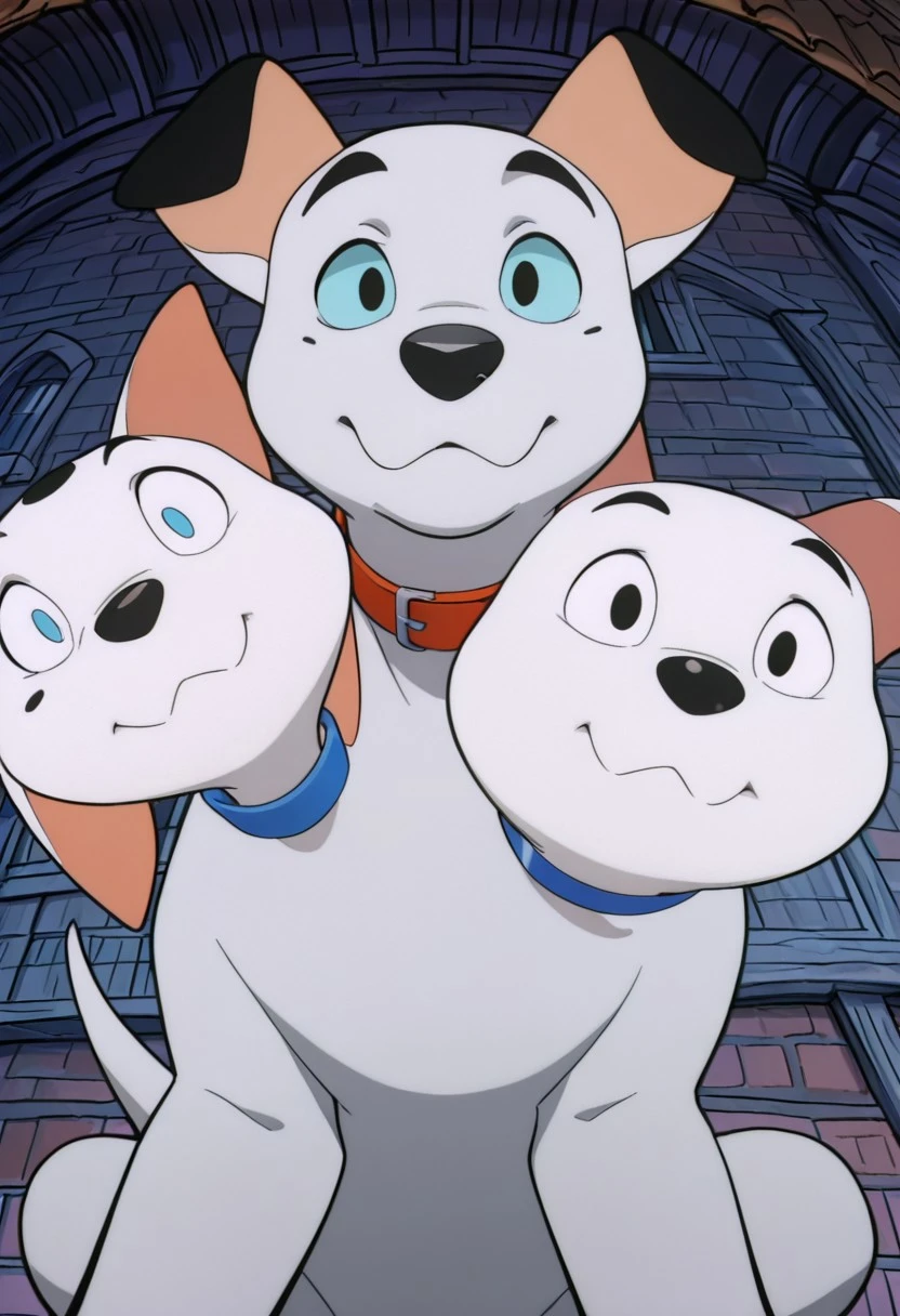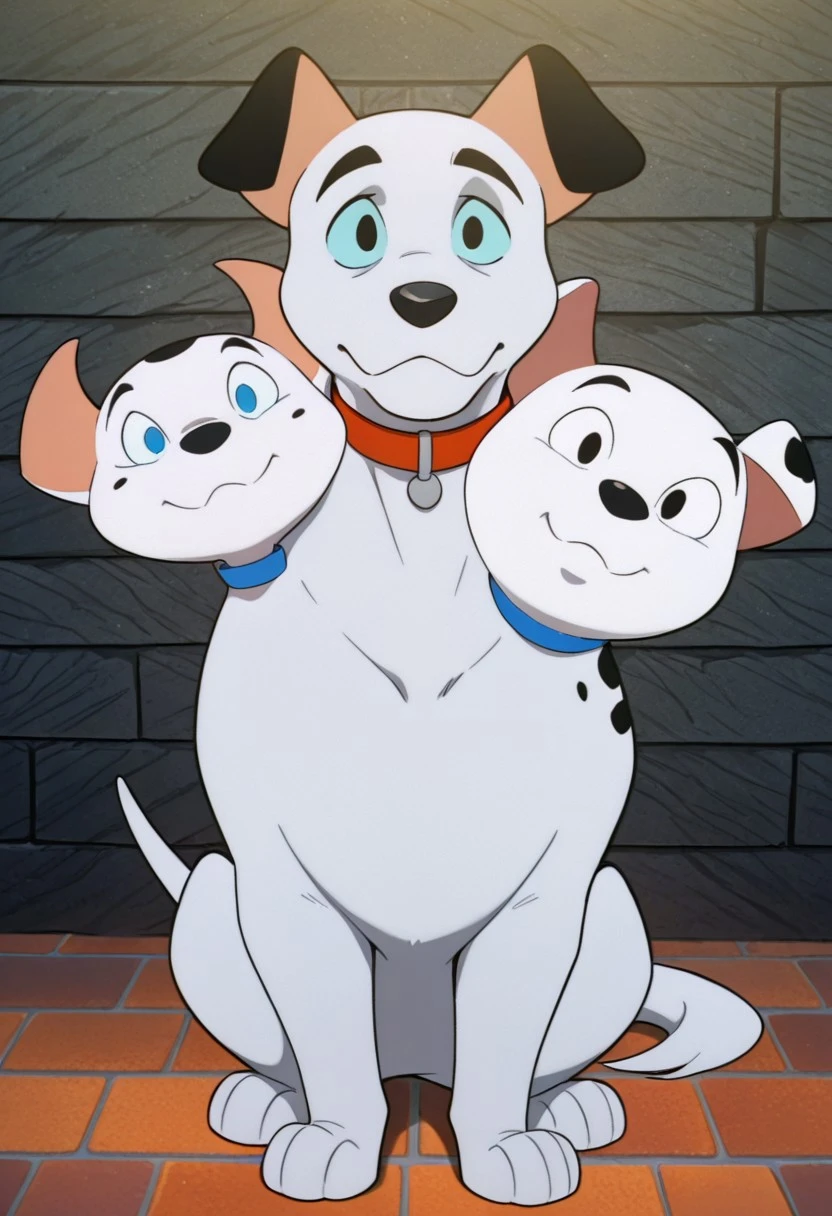barkio dalmatian, solo, dog, cerberus, 3 heads, dalmatian, white fur with black spots, black nose, tail
