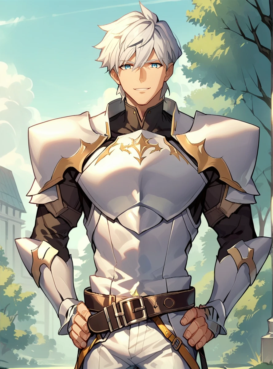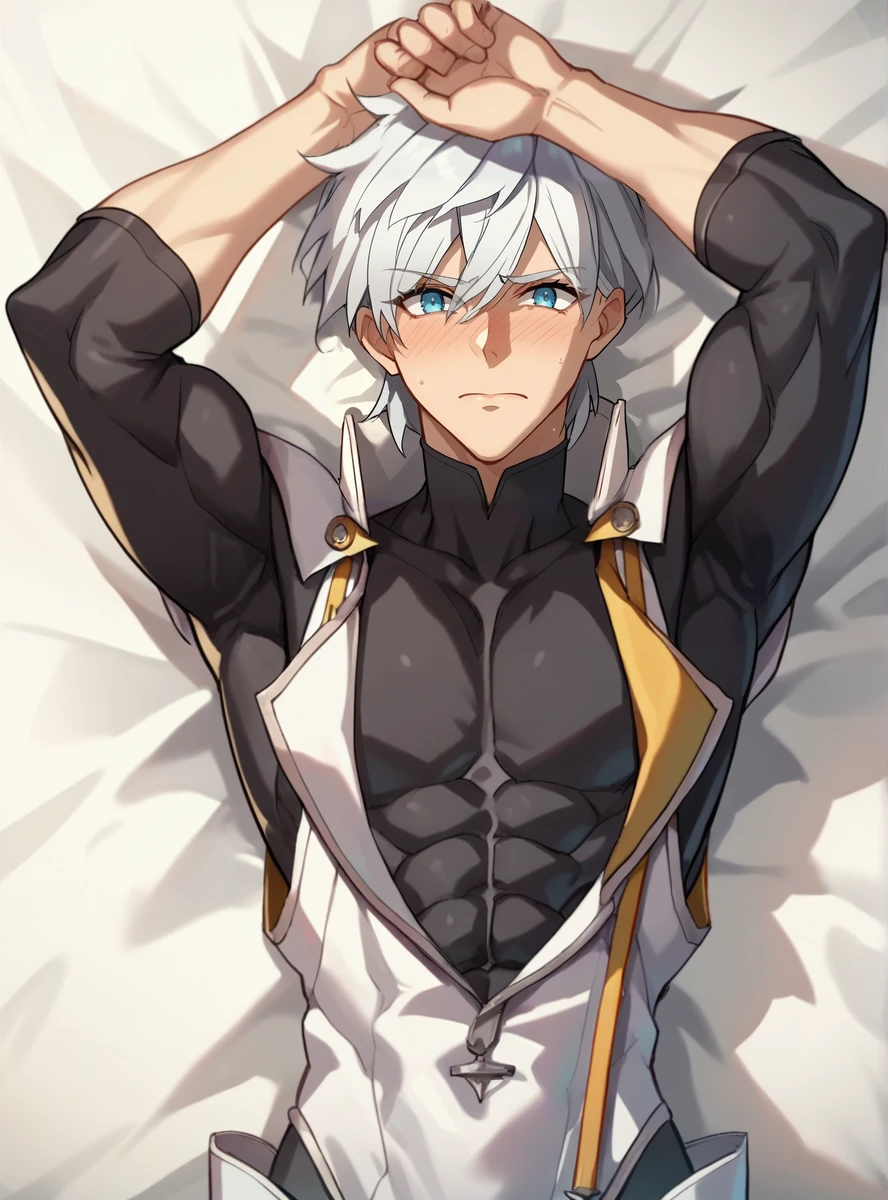 male focus, 1boy, solo, armor, blue eyes, short hair, white hair, looking at viewer, bodysuit, belt, shoulder armor