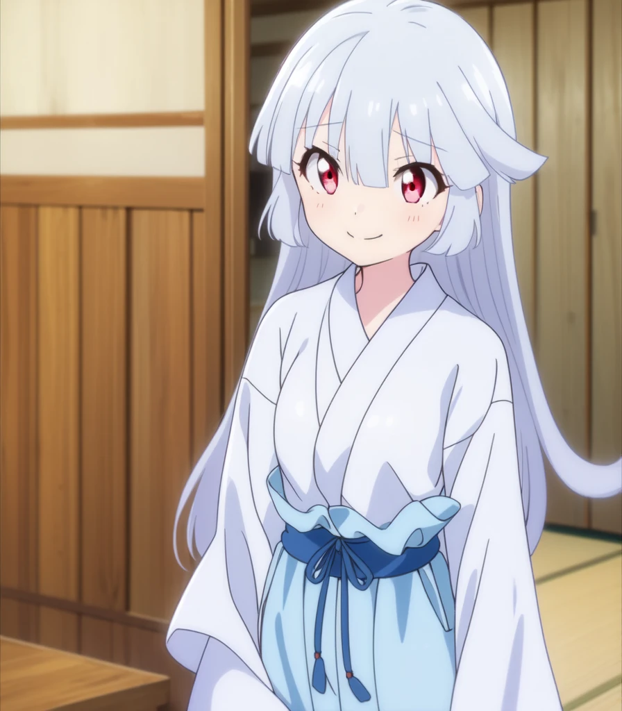 1girl, solo, long hair, looking at viewer, smile, bangs, hime cut, red eyes, long sleeves, hair between eyes, closed mouth, standing, full body, grey hair, boots, japanese clothes, wide sleeves, kimono, sash, brown footwear, obi, white kimono