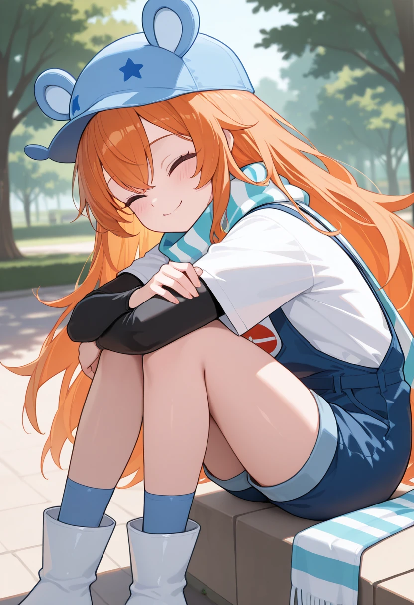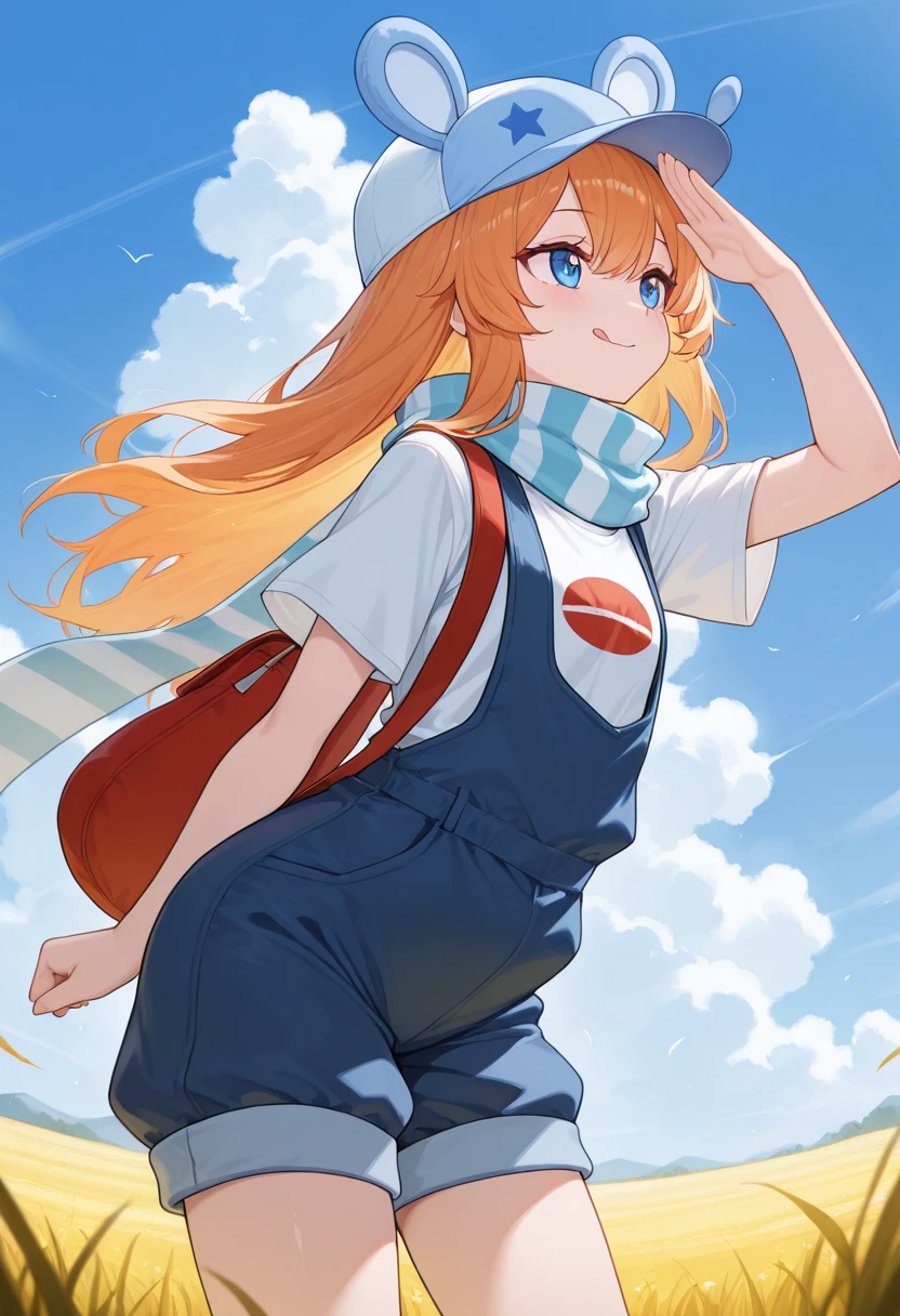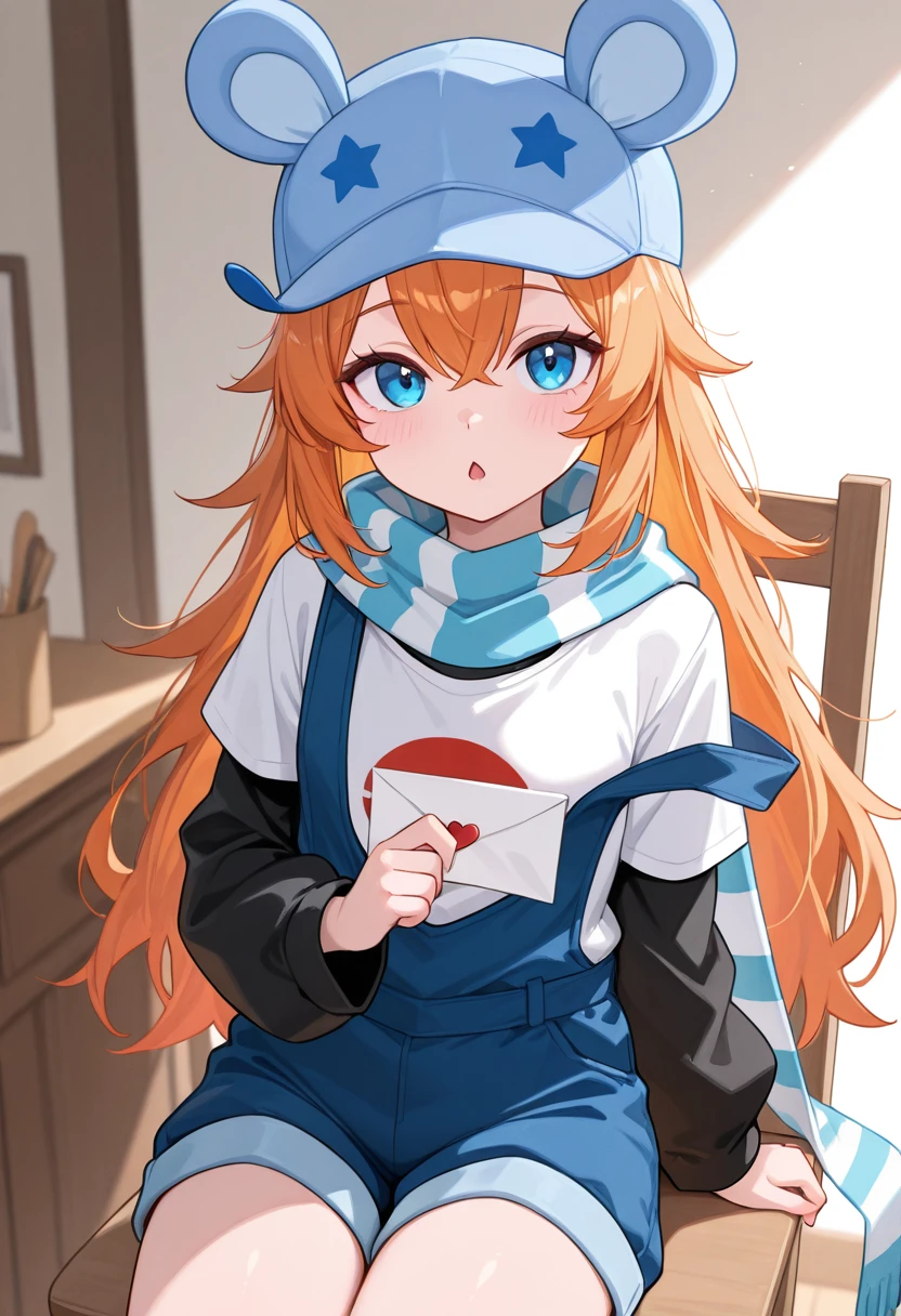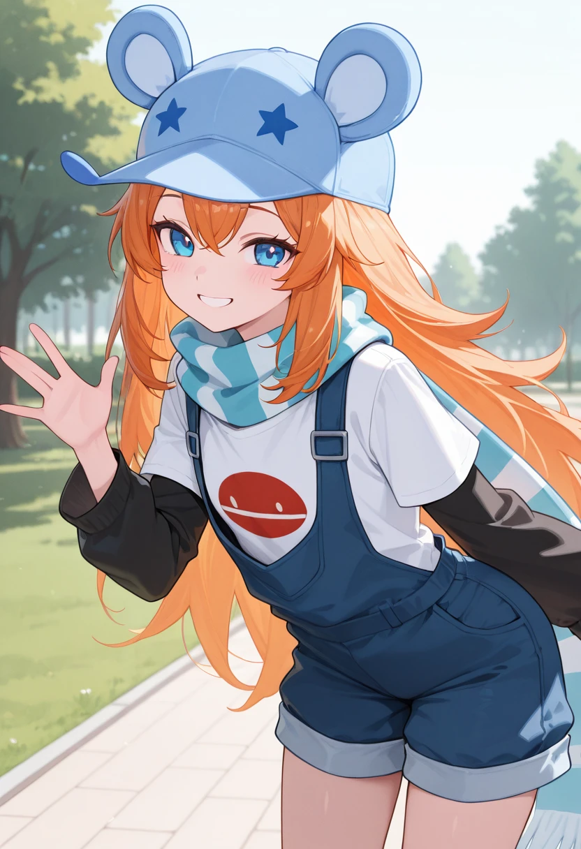 blue hat,animal ears,overalls,overall shorts,black sleeves,striped scarf,blue scarf,
