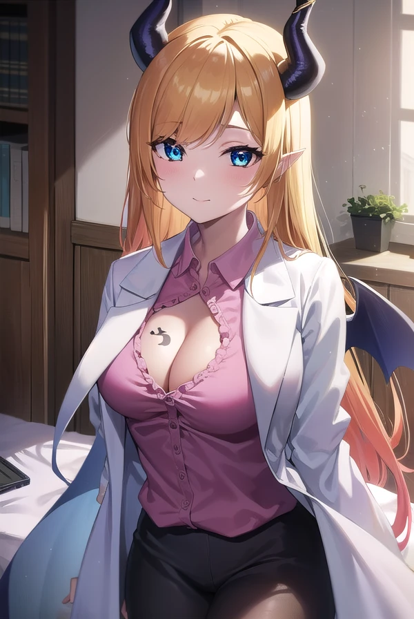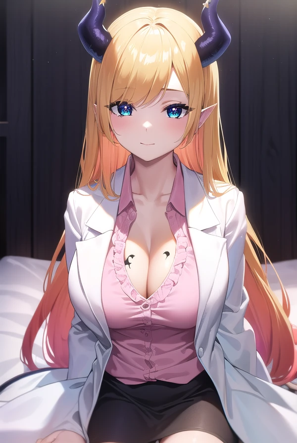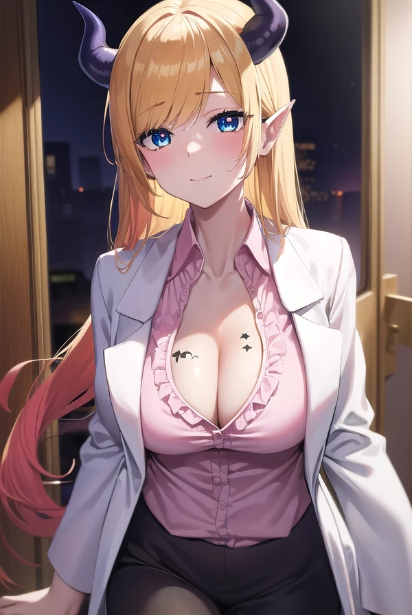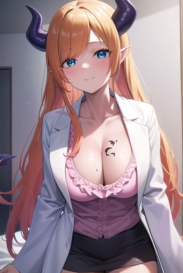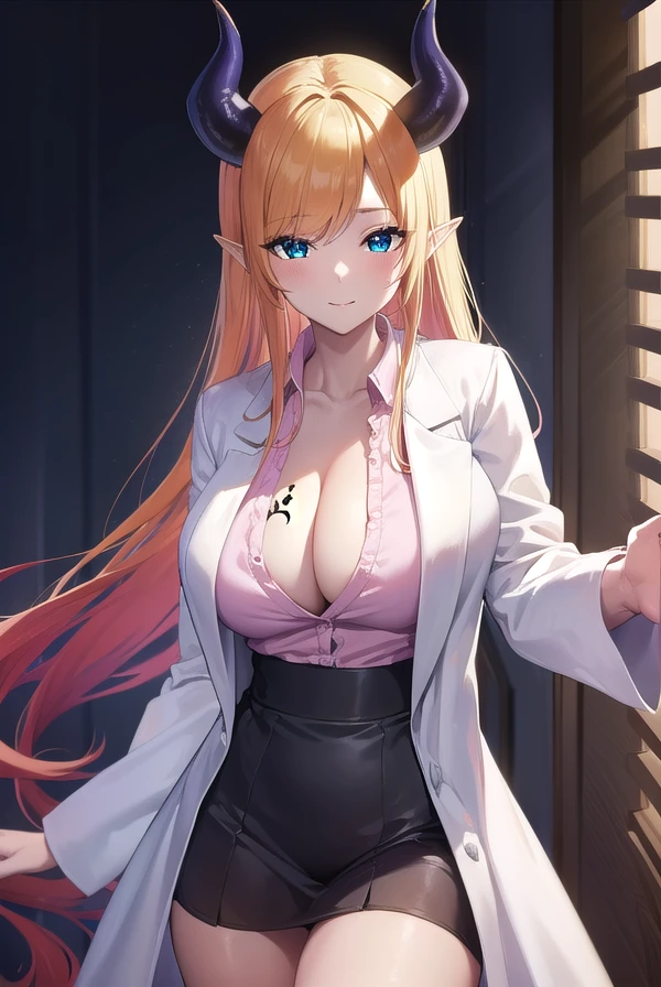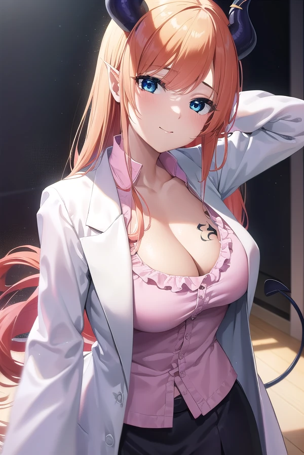 black skirt, breast tattoo, (cleavage:1.2), frilled shirt, frills, lab coat, (white labcoat:1.5), (pink shirt:1.2), shirt, skirt, tattoo,