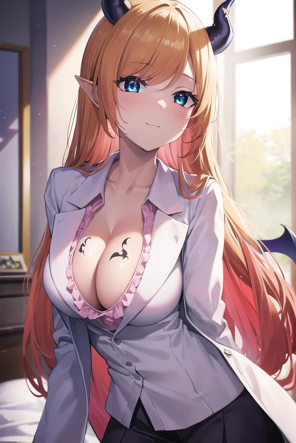 choco yuzuki, aqua eyes, black horns, blonde hair, demon girl, demon horns, demon tail, demon wings, gradient hair, horn ornament, horn ring, horns, long hair, multicolored hair, pink hair, pointy ears, (swept bangs:1.5), tail, wings, colored tips,