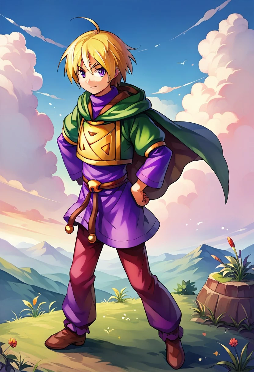 green cloak, hooded cloak, purple tunic, short sleeves over long sleeves, sash, red pants, brown shoes