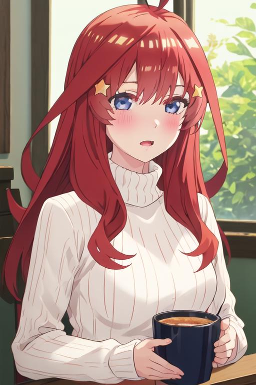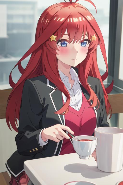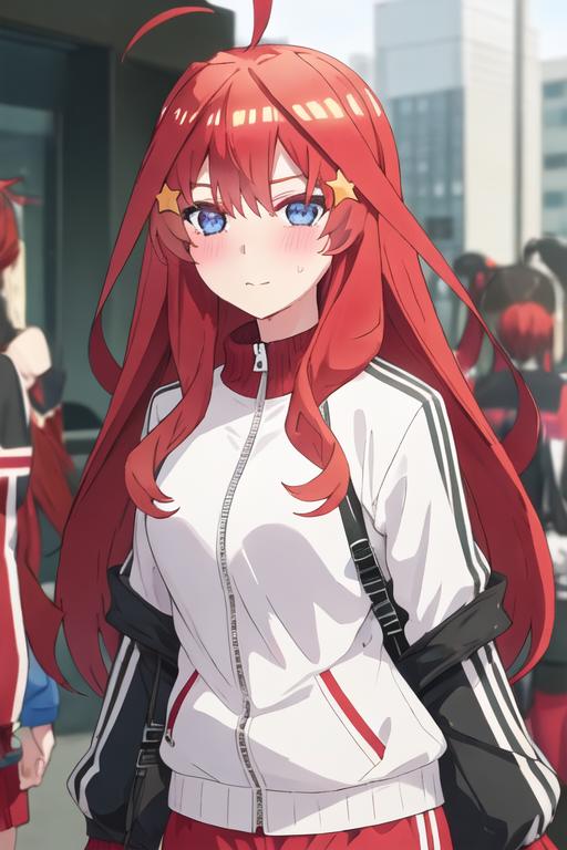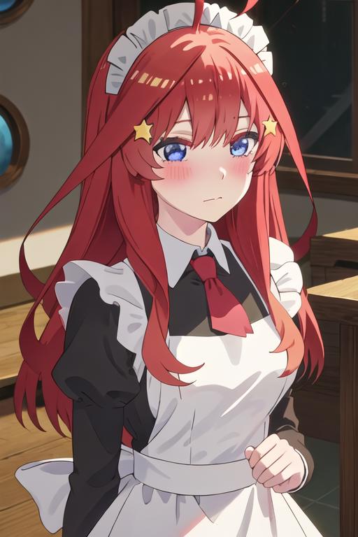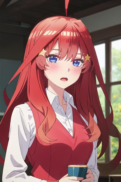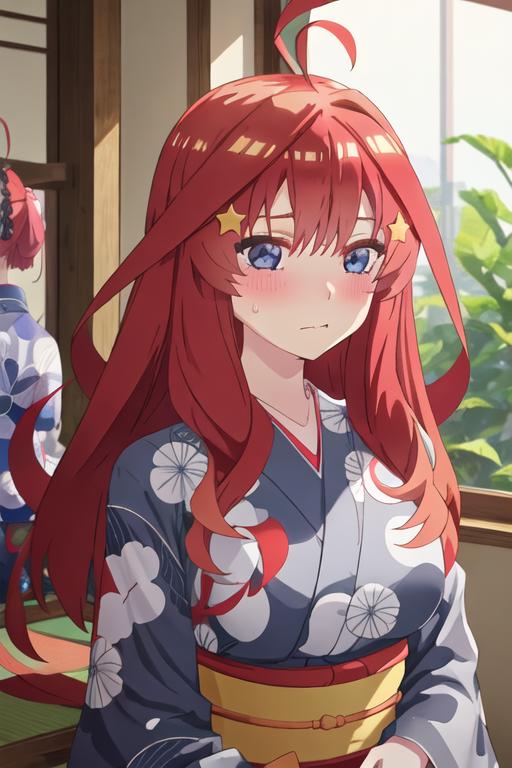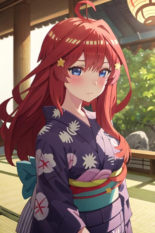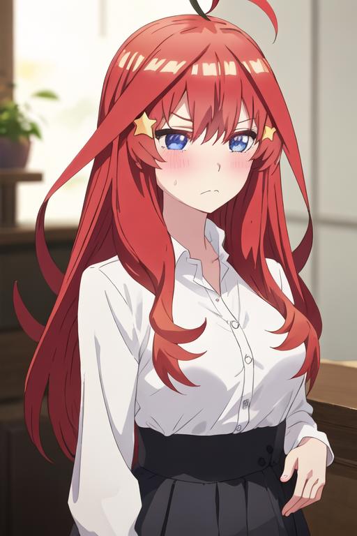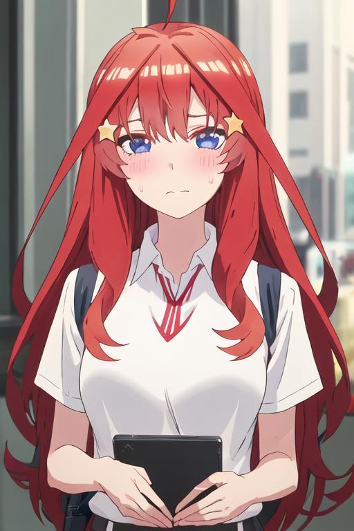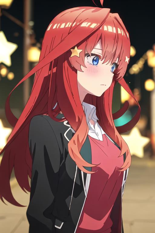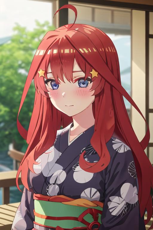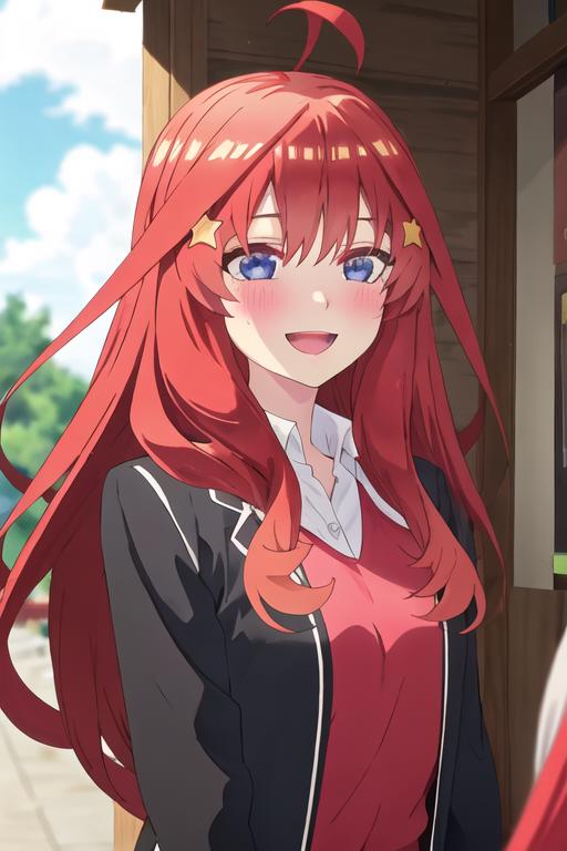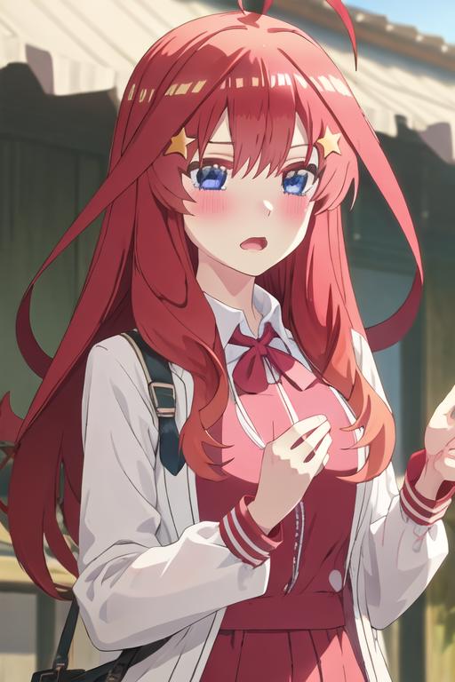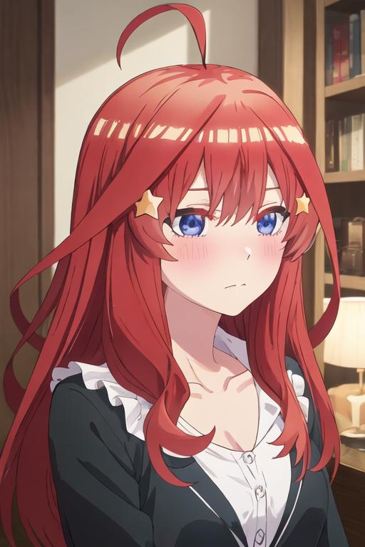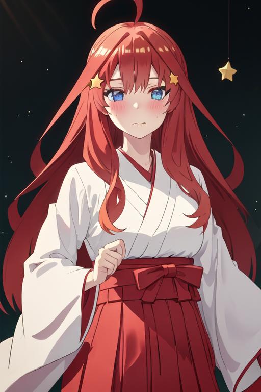 The trigger word is nakano_itsuki_gotoubunnohanayome, and the recommended tags are best quality, masterpiece, highres, solo, {nakano_itsuki_gotoubunnohanayome:1.15}, long_hair, red_hair, hair_ornament, star_\(symbol\), star_hair_ornament, bangs, blue_eyes, ahoge, blush, hair_between_eyes, closed_mouth, shiny_hair.