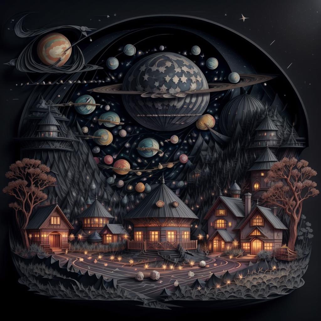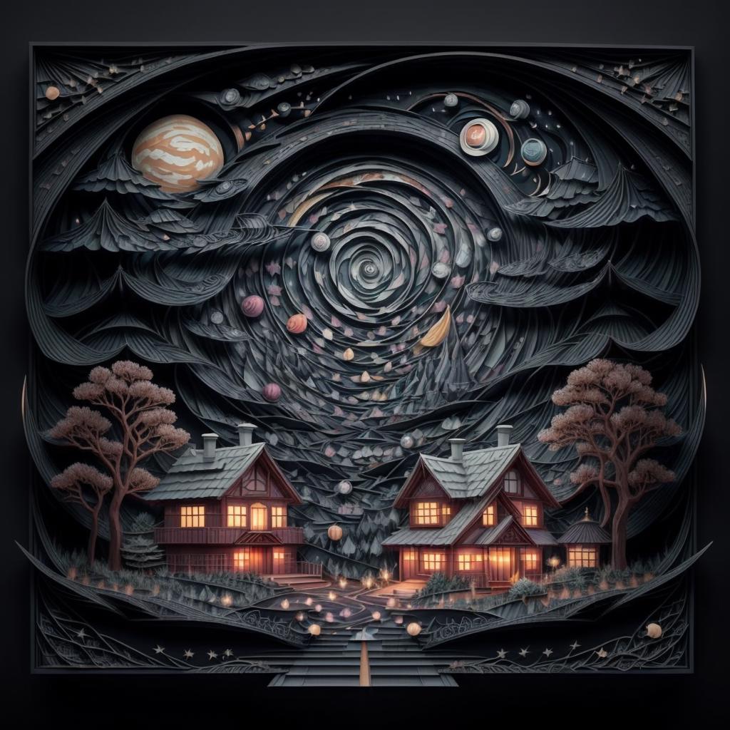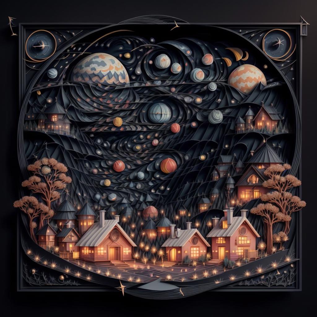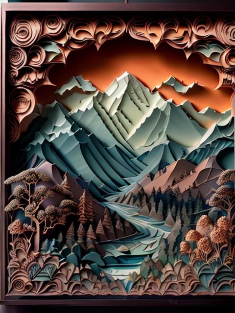 Suggested keywords: regal, high detail, fractal, 3d depth, 3D graphics with simplistic polygon shapes, intricate designs, delicate patterns, shadowbox frame, silhouette, kirigami, scherenschnitte,