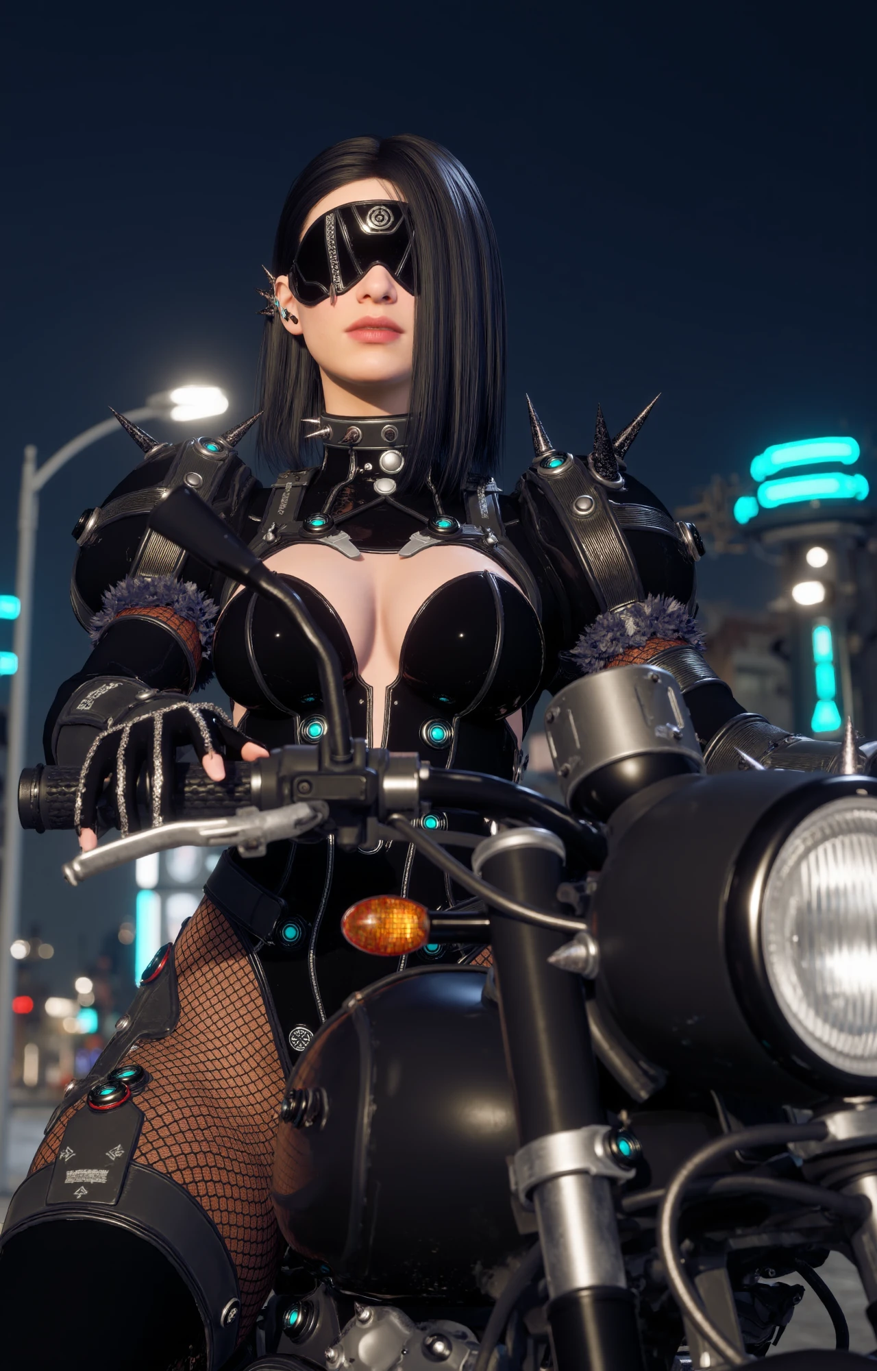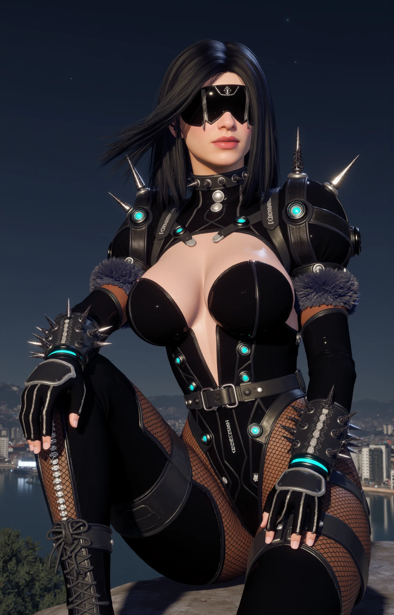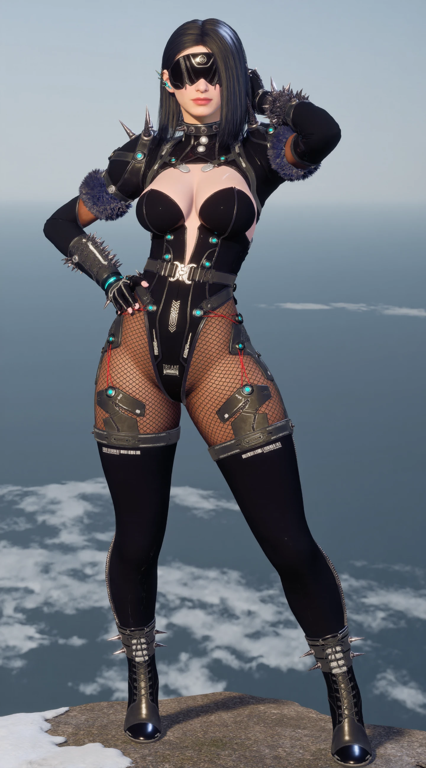 TFD-Hailey-BlackThorn. She has straight, shoulder-length black hair and teal ear clasps. She is wearing a futuristic, black bodysuit with metallic and teal glowing details and high neckline. The low-cut design of the bodysuit reveals her cleavage. She is wearing a black visor that covers her eyes, adding to her cyberpunk aesthetic. She has spiked shoulder pads and fur accents that look tough and edgy. She is wearing high-heeled boots with turquoise details and metal spikes. Her lower body is covered in black fishnet stockings covering her thighs.