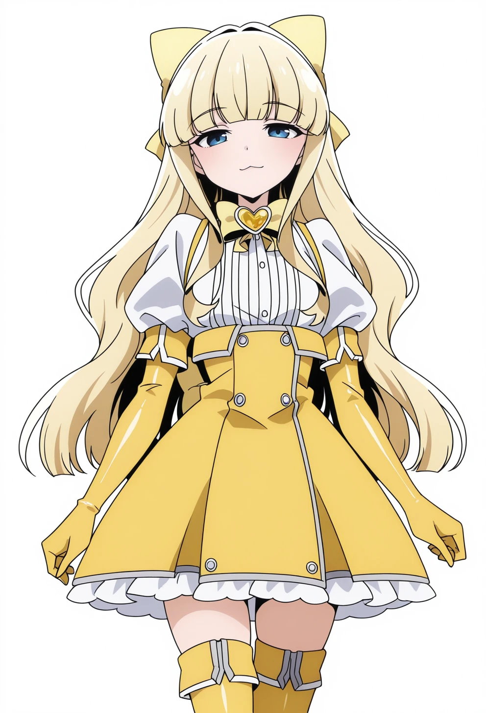 yellow gloves, elbow gloves, bow, thighhighs, hair bow, dress, brooch, puffy sleeves, short sleeves,