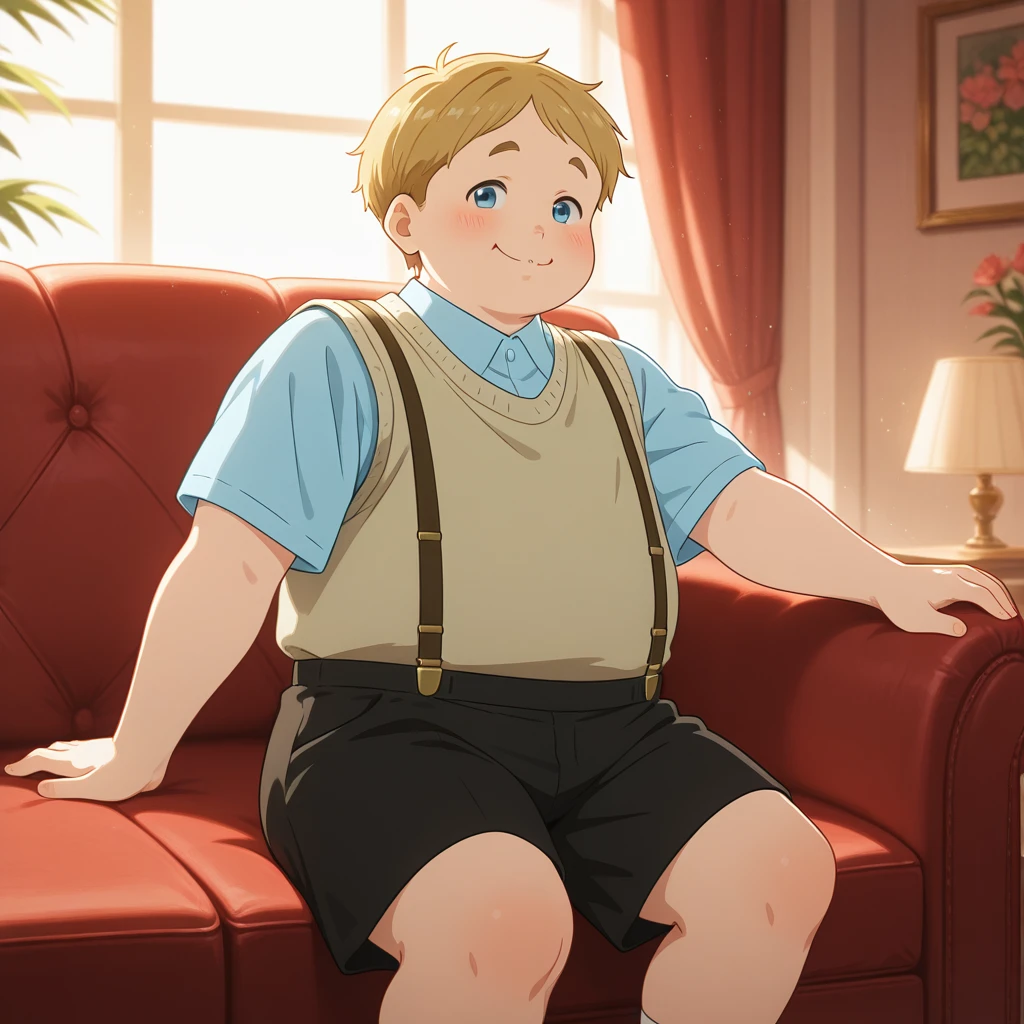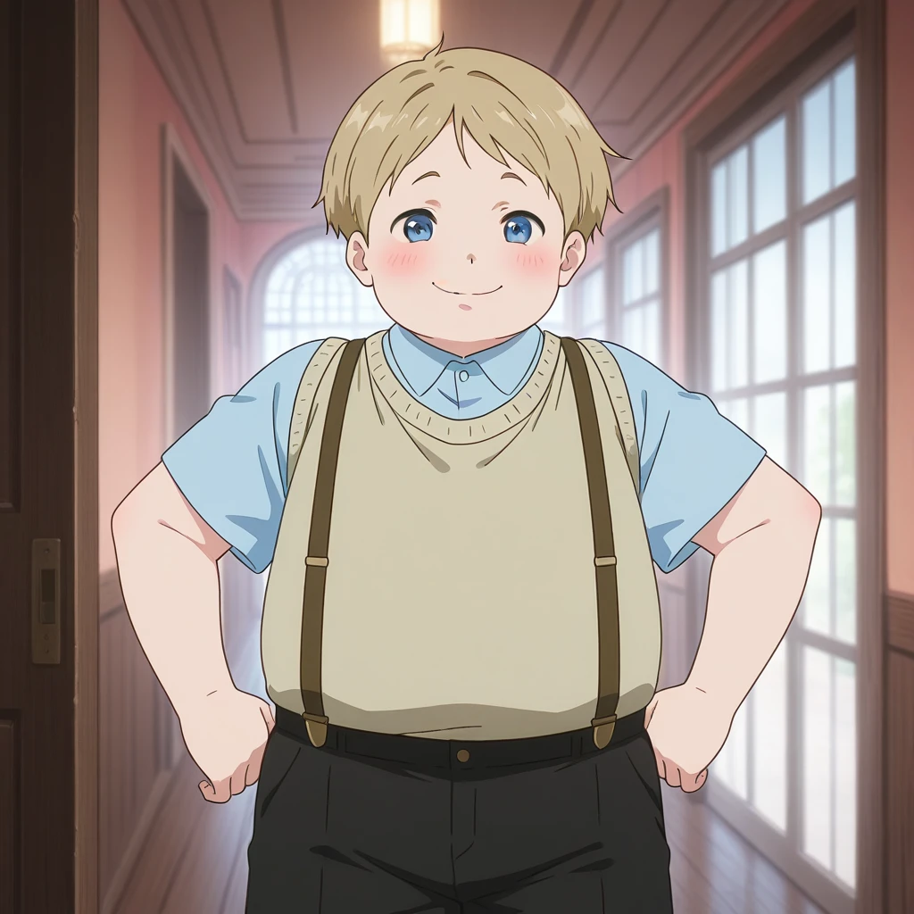 blue shirt, khaki sweater vest, brown suspenders, black shorts, white socks, brown footwear