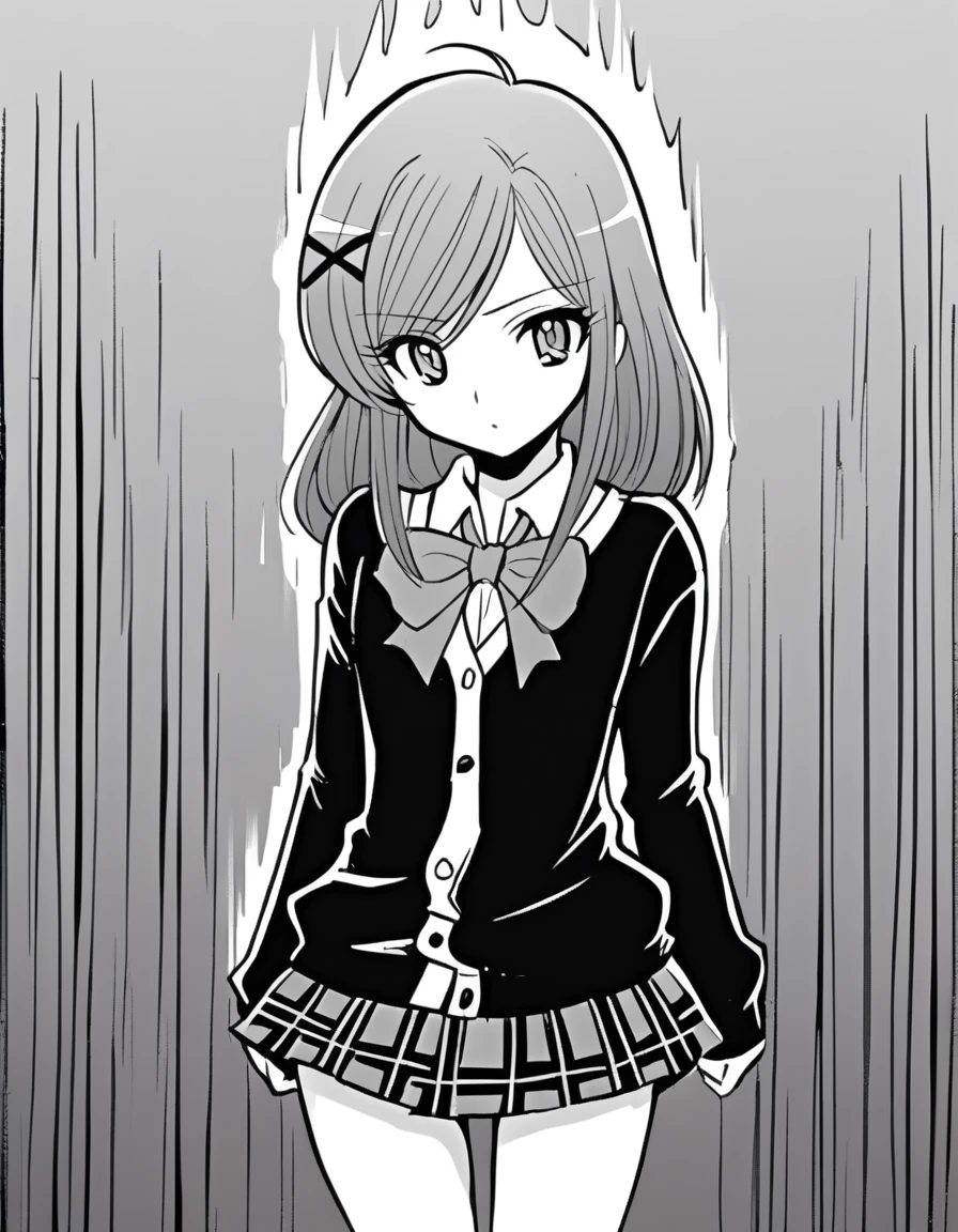 cardigan, long sleeves, neck bow, striped bow, plaid skirt