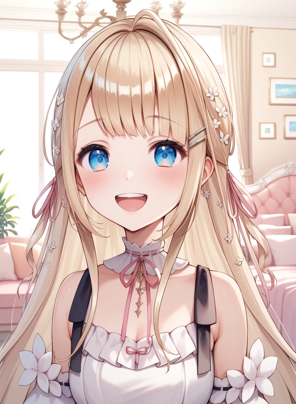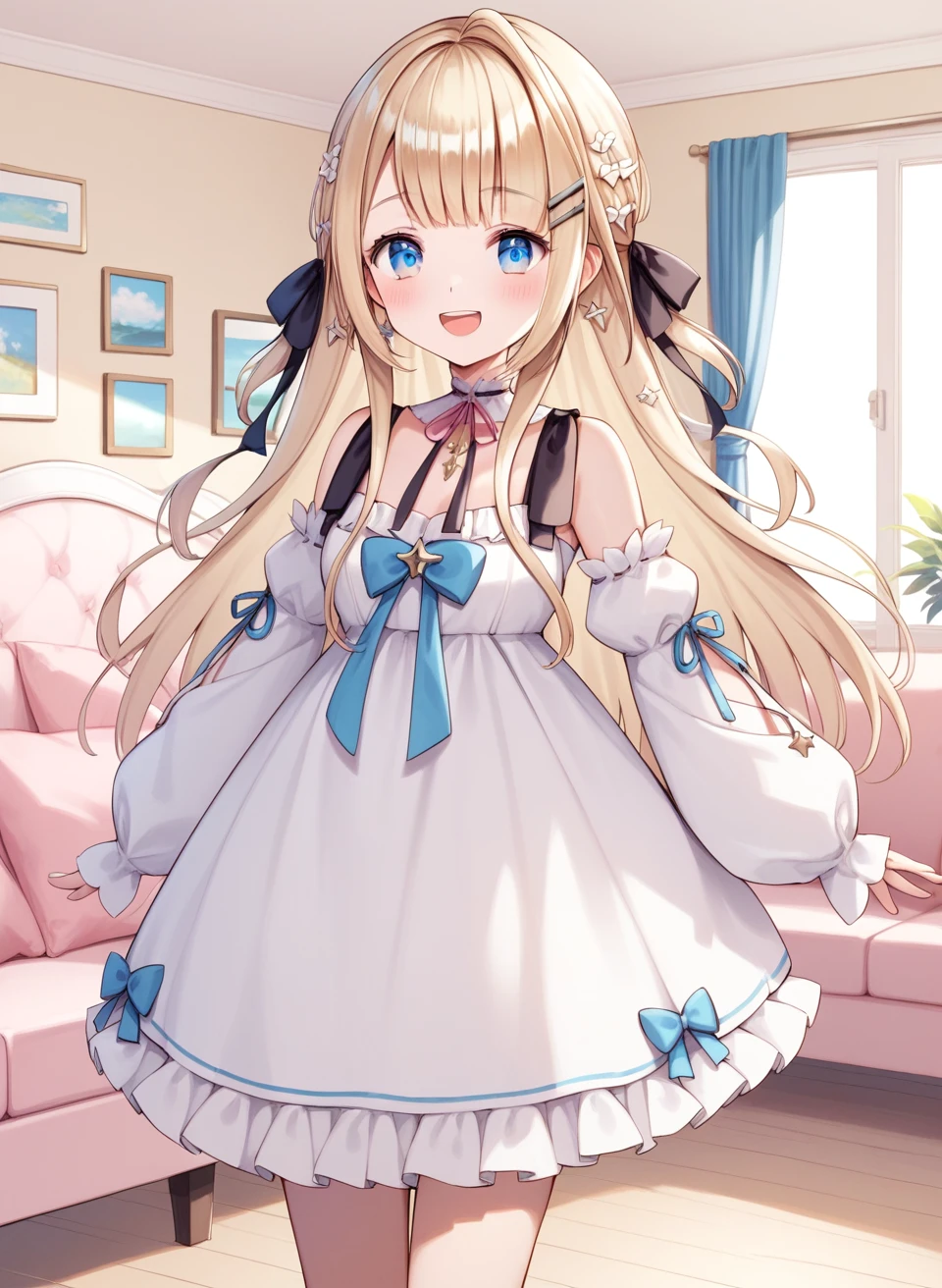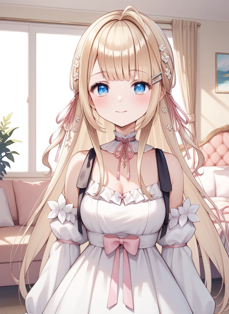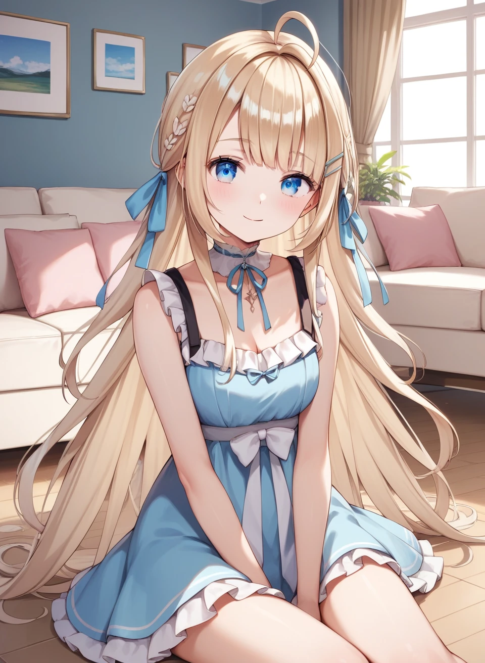 1girl, virtual youtuber, long hair, blonde hair, blue eyes, dress