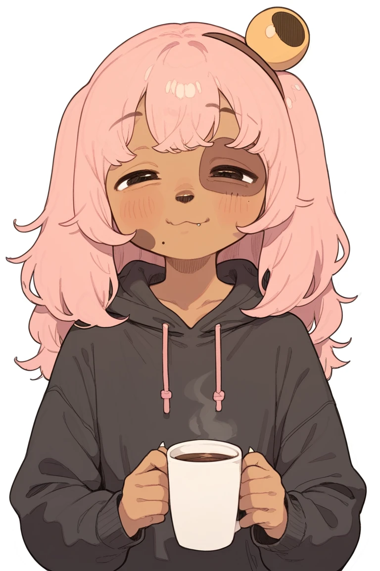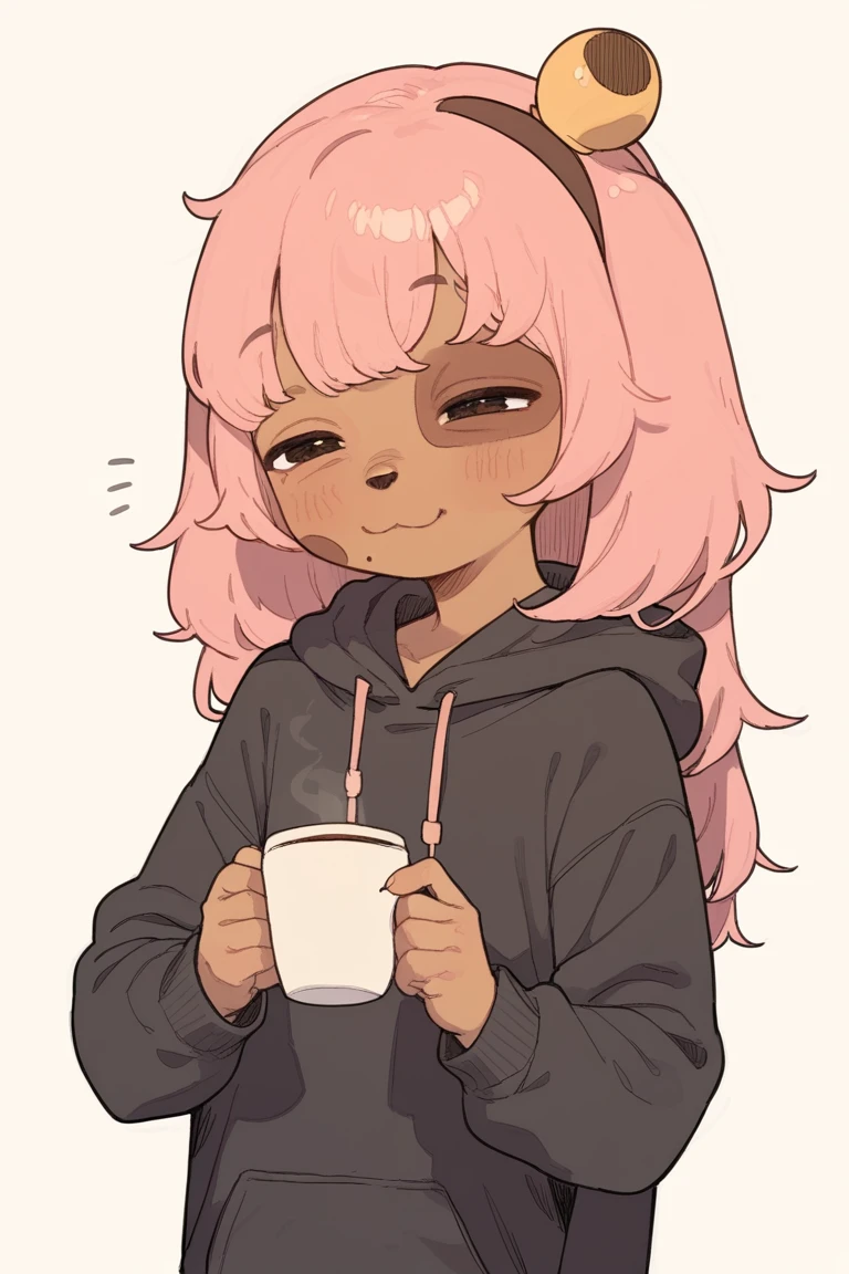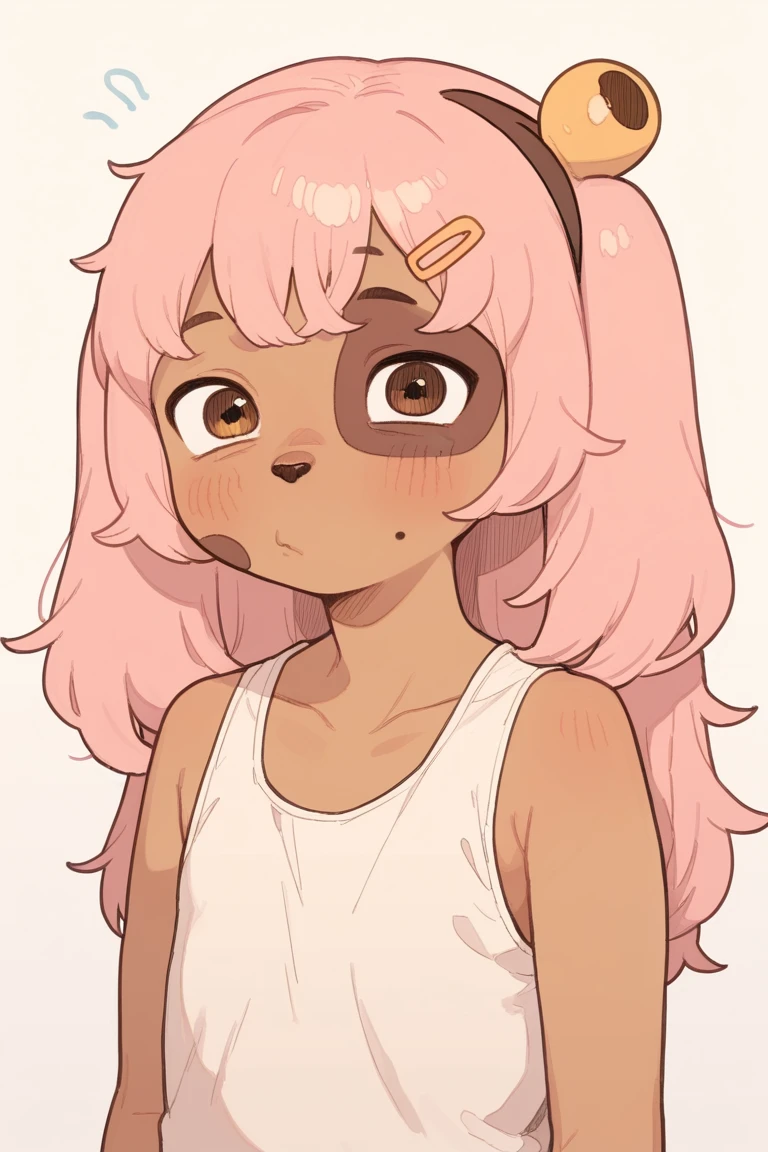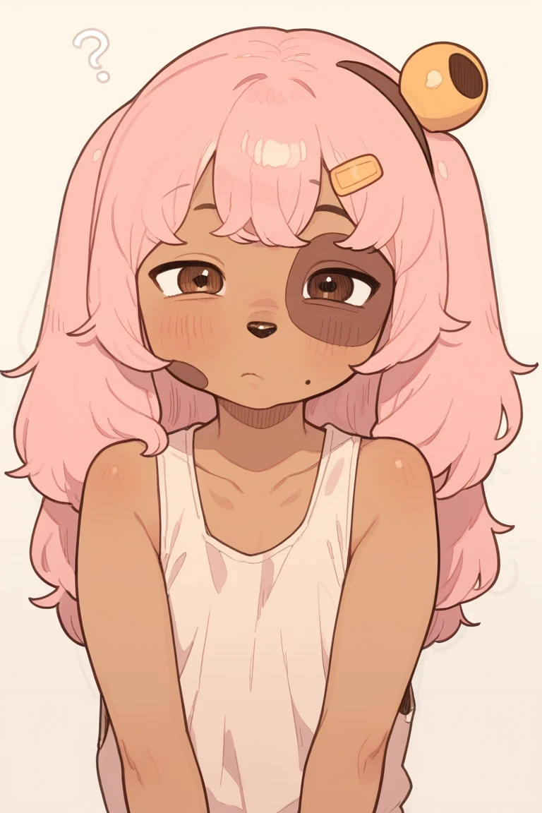 lilotte, 1girl, dog girl, pink hair,long hair, dog ears, brown skin,hair band,orange overalls,single mole, solo