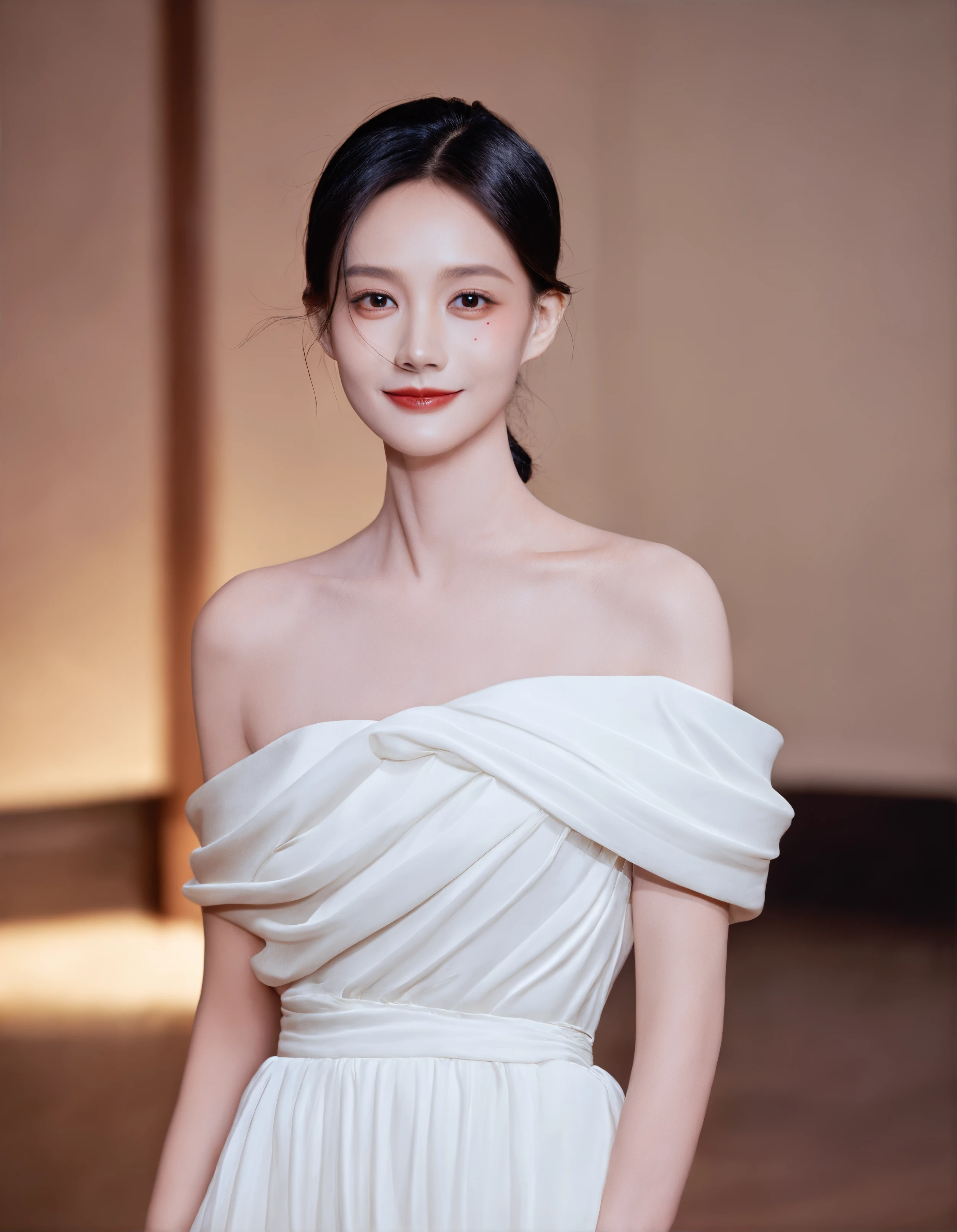 she wearing wedding dress,The background is a plain, light-colored wall, giving a simple and clean look to the image. The lighting is soft and even, highlighting her face and creating a serene