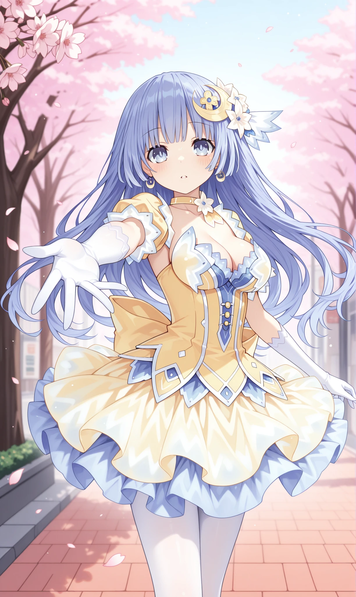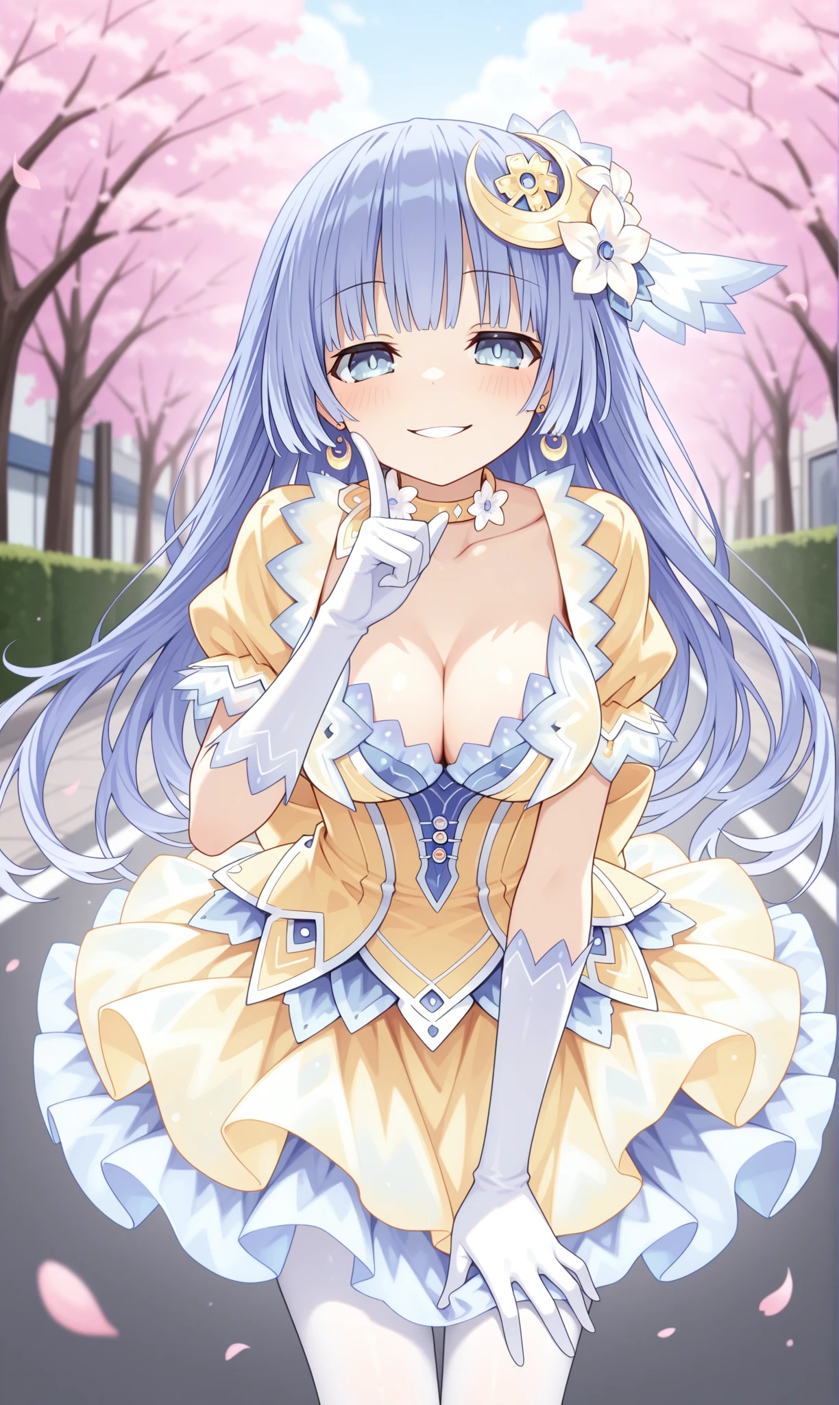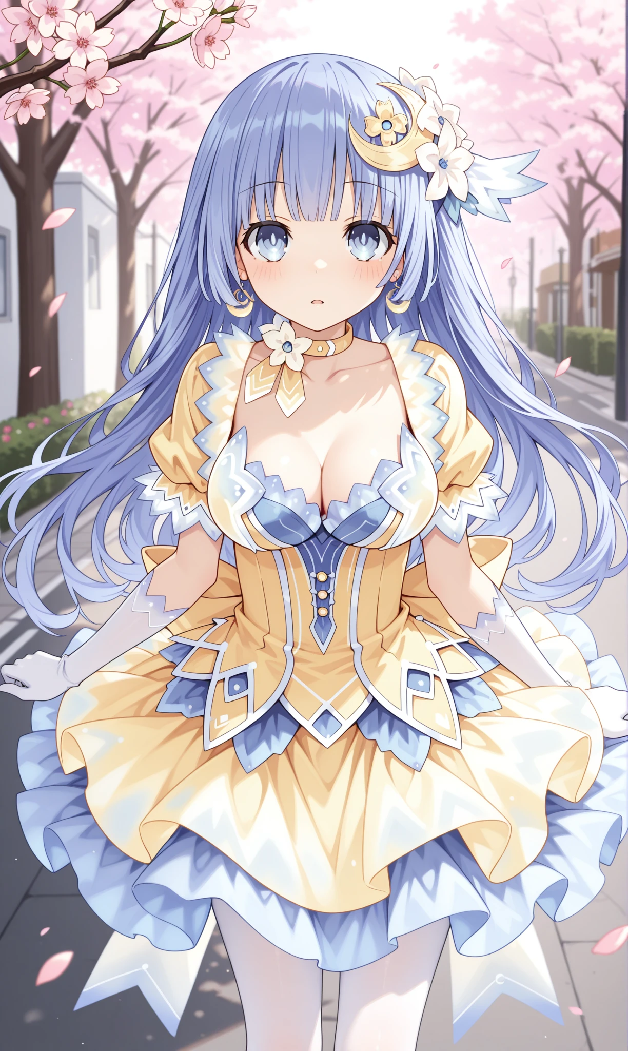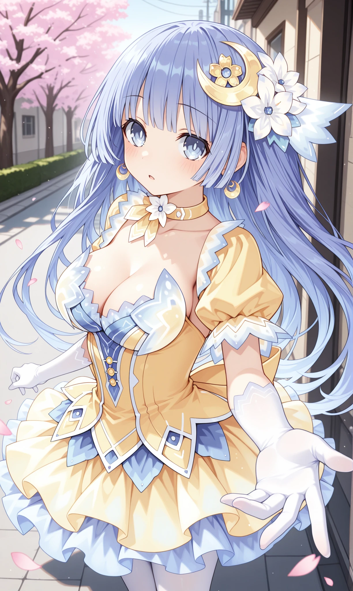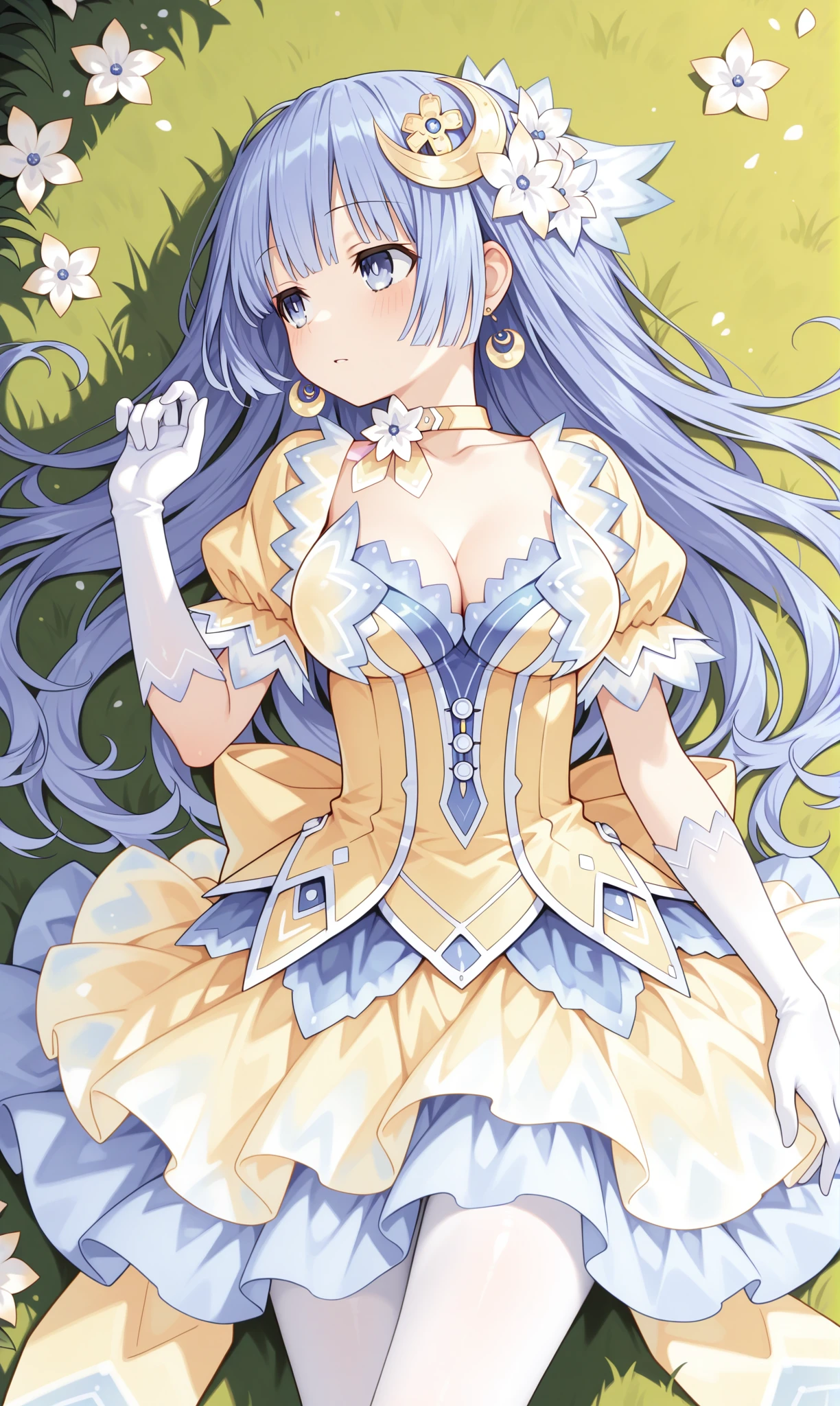 izayoi miku (spirit), hair ornament, cleavage, crescent, circle skirt, crescent hair ornament, elbow gloves, flower, gloves, hair flower, white pantyhose, yellow dress, date a live style