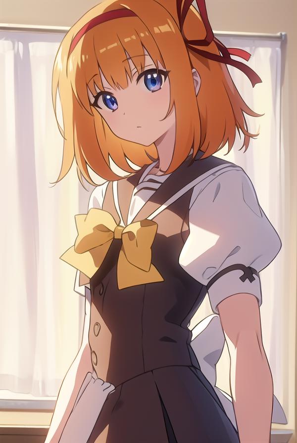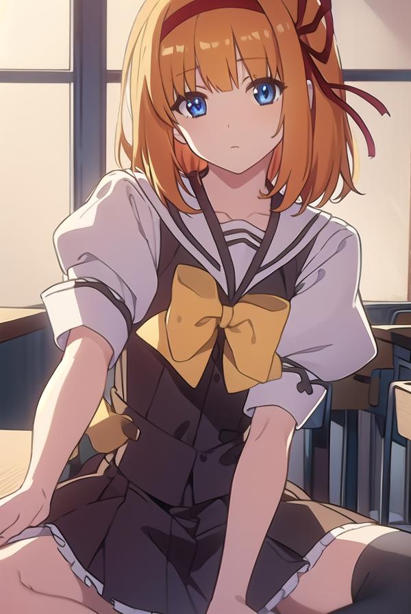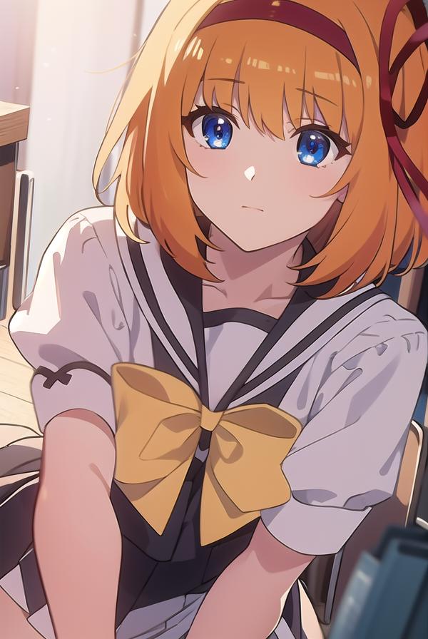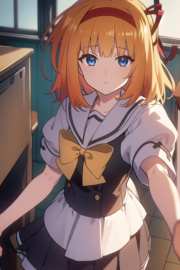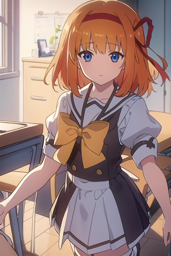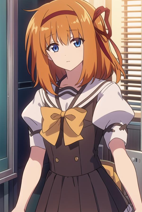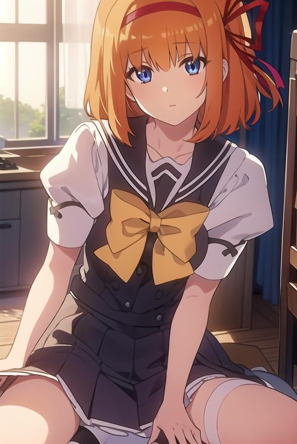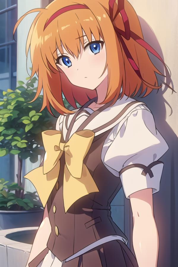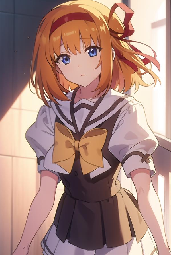 kaede fuyou, short hair, orange hair, hair ribbon, hairband, blue eyes,