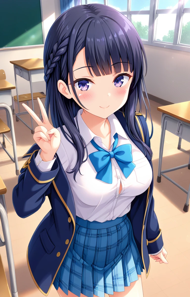 トリガー(Trigger):shirouzurikka, blue purple hair, asymmetrical bangs, blunt bangs, braid, purple eyes, medium breasts