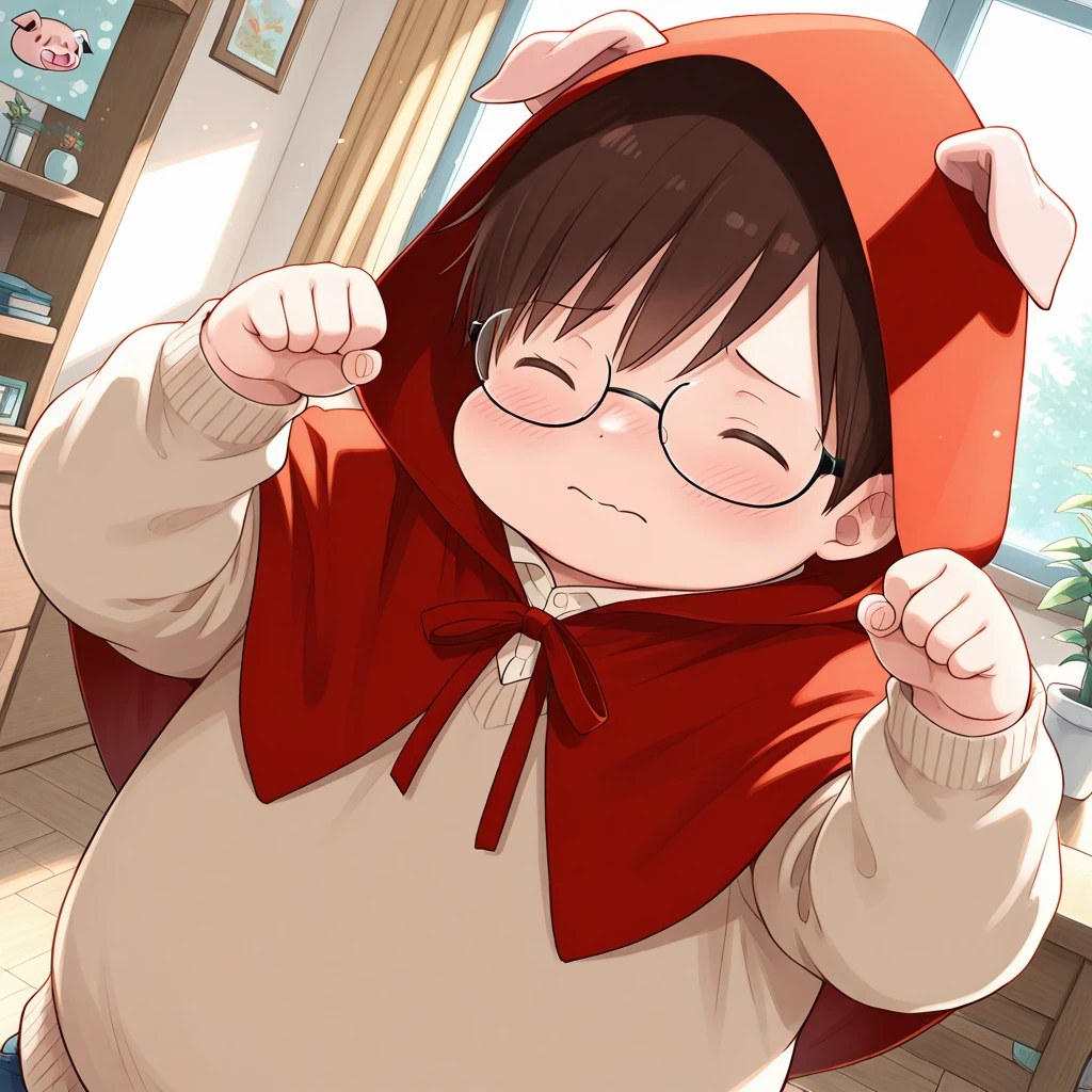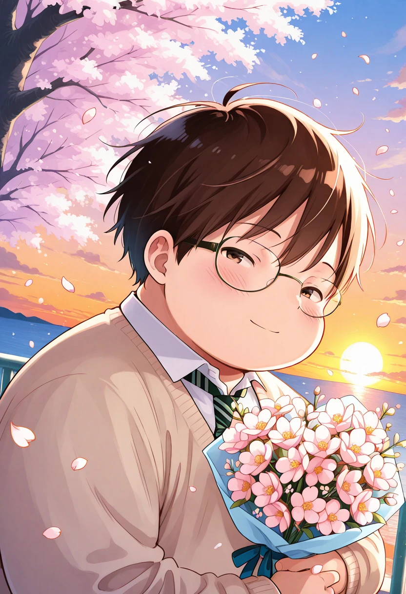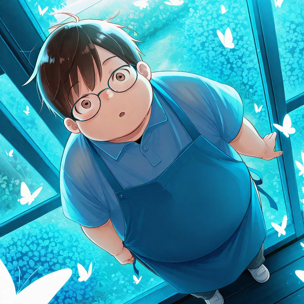 mktmk-satou, brown hair, brown eyes, glasses, chubby, 1boy