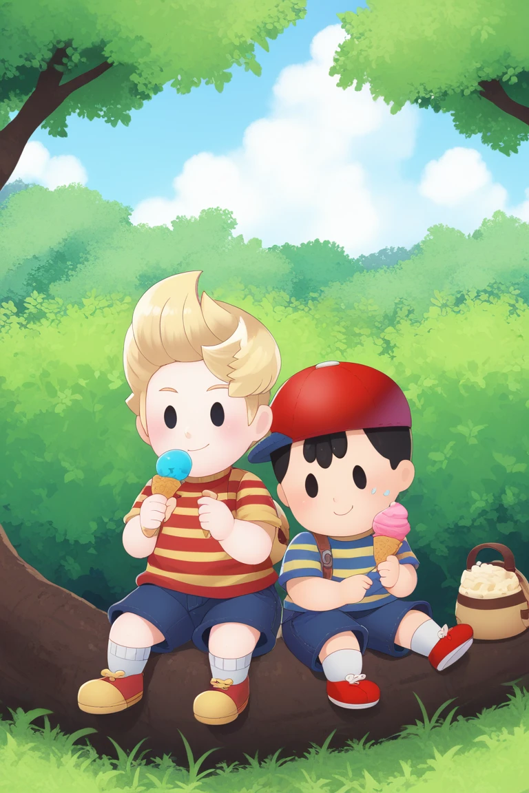 ness, black hair, black eyes, solid oval eyes, red hat, striped shirt,red headwear, blue shorts