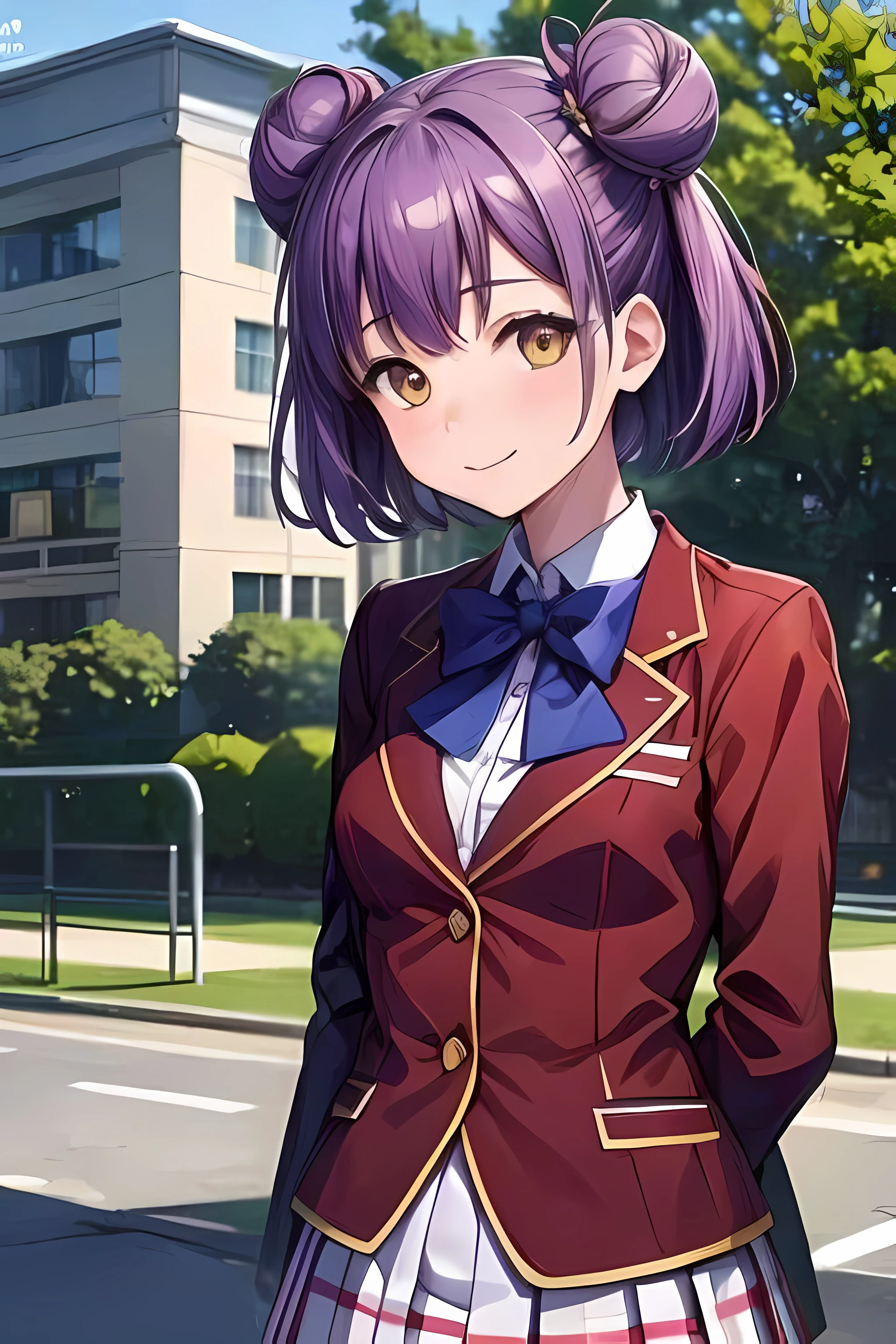 1girl, tachibana akane, purple hair, hair bun, double bun, yellow eyes