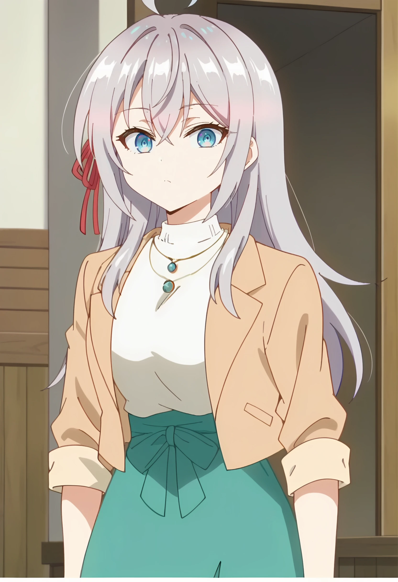 outfit 2: green skirt, shirt, red ribbon, brown jacket,turtleneck, necklace, sweater