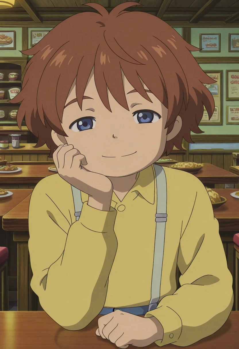Oliver,short hair,brown hair,thick eyebrows,blue eyes,collared shirt,yellow shirt,suspenders,pants,sneakers,blue footwear